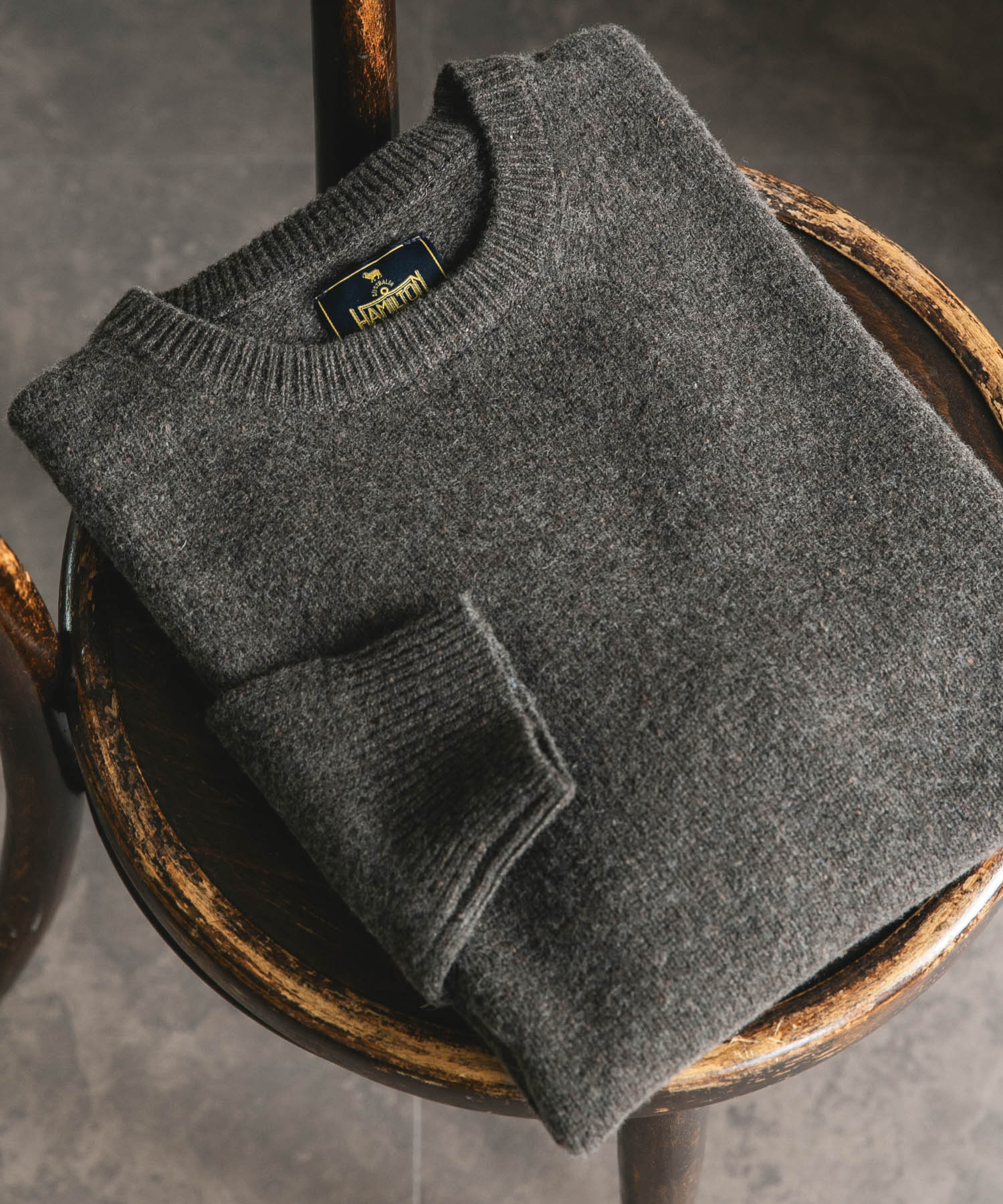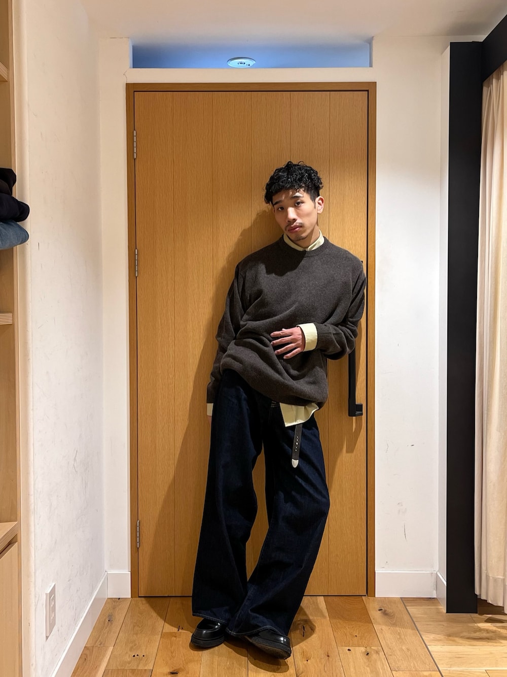 深みのあるブラウンはハミルトンニットを採用。インナーは同系色の明色で合わせました。