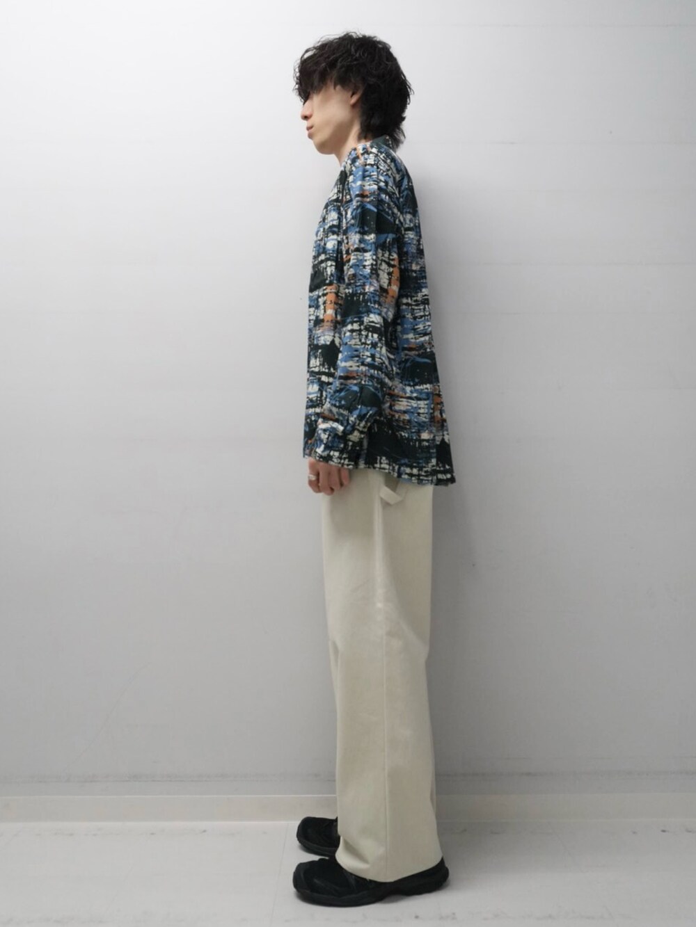 柄シャツメインになるように、白パンツを合わせてコーディネートしました。