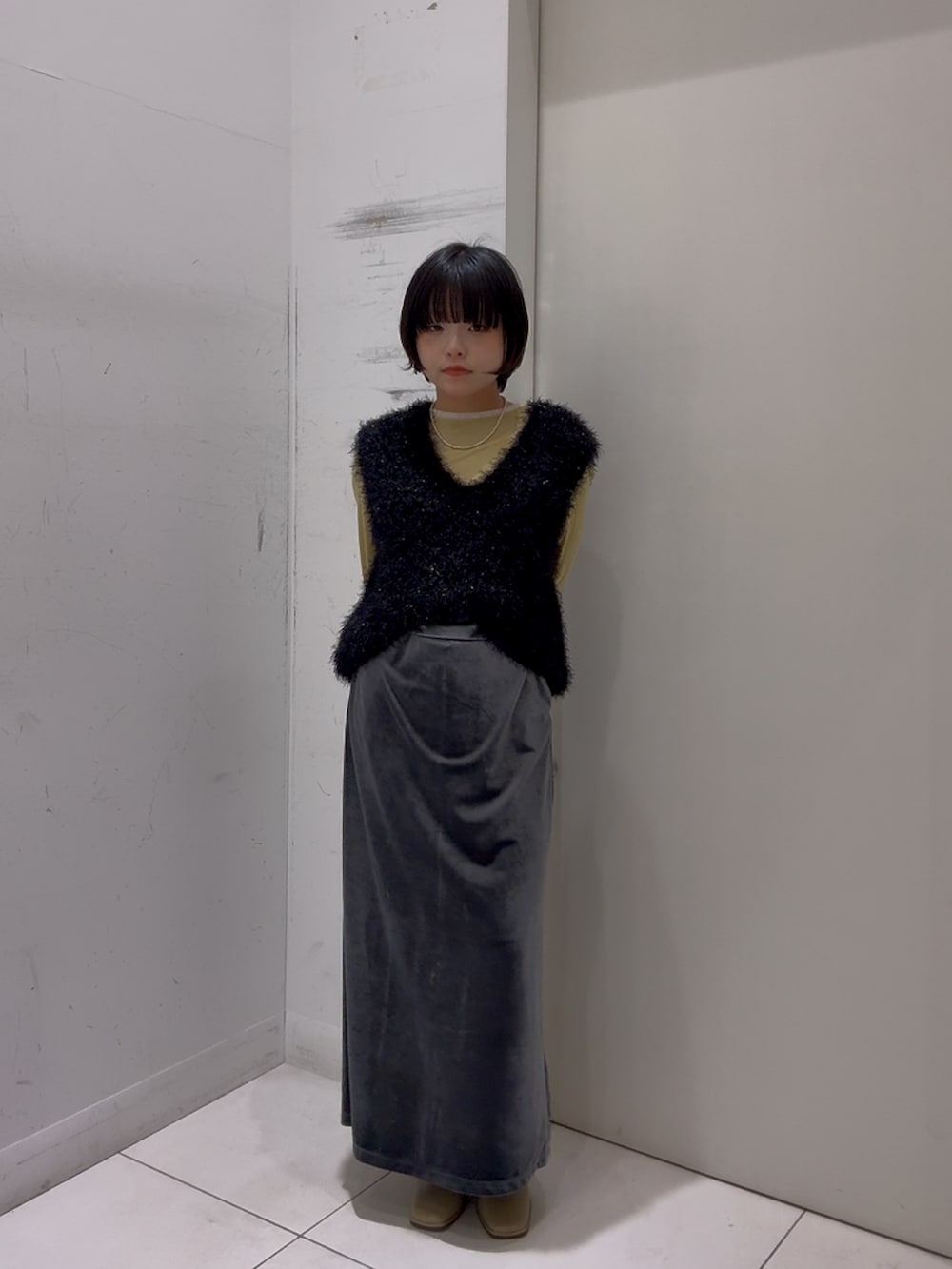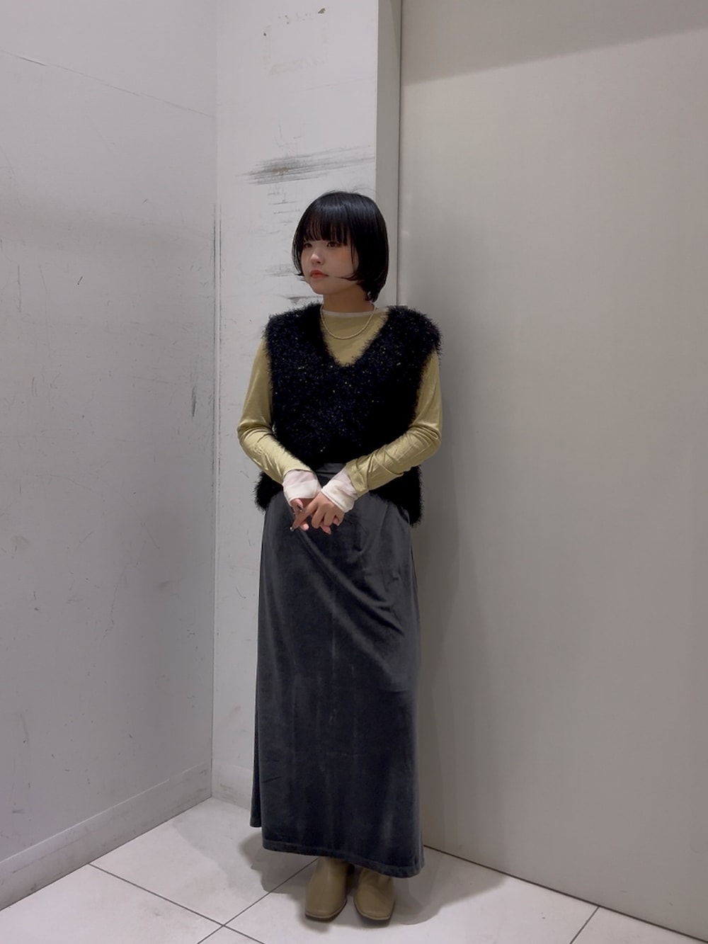 ふわふわもこもこしてれば可愛いと言ってもらえるような甘い世界ではないけれど、もこもこしたいのでします( っ◜~◝c)インナーの色が絶妙でとってもすき。。タイプ。。色んなものに合わせたい。。です、ベロアのスカートも上品で可愛い!♡渋滞てこと