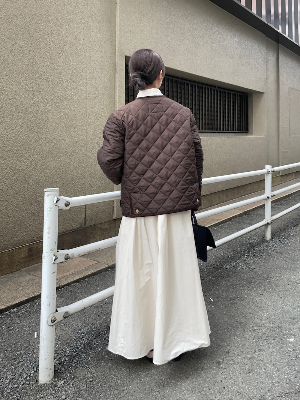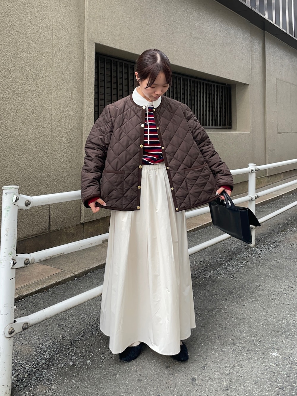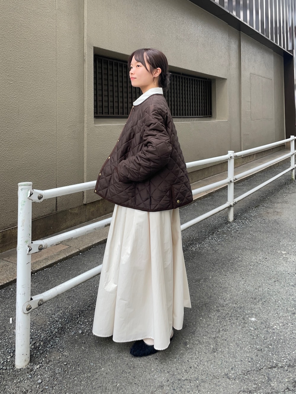 羽織は、Traditional Weatherwearの別注BROWNアイテムで、ブランドのベストセラーキルティングジャケットのARKLEYのモデルです!横向きのスタイリング見るとわかるのですが、Aラインシルエットで、肩のラインが少し落ちたリラックス感のあるデザインです!