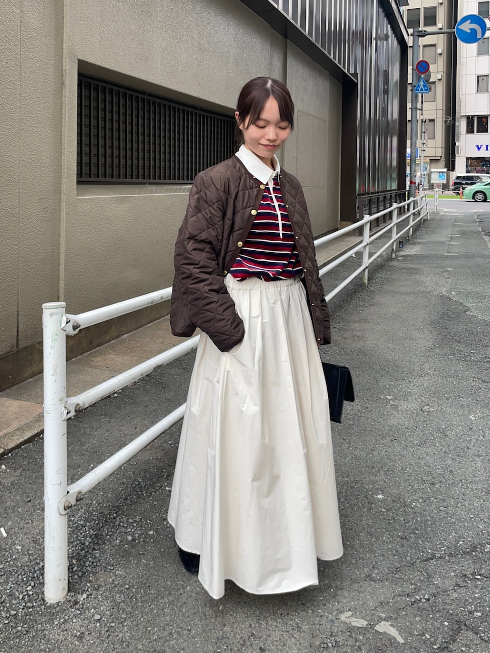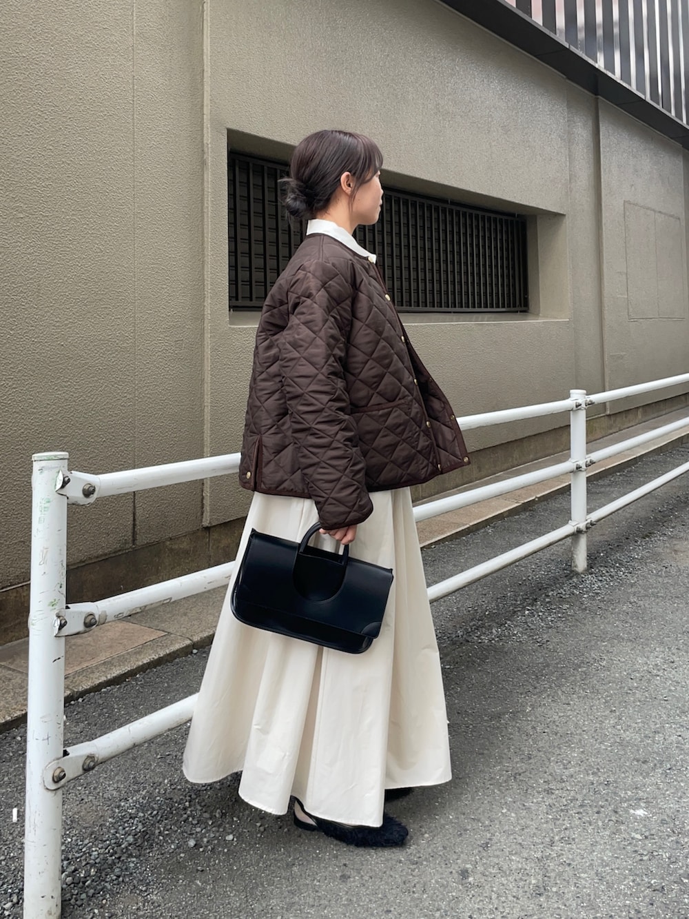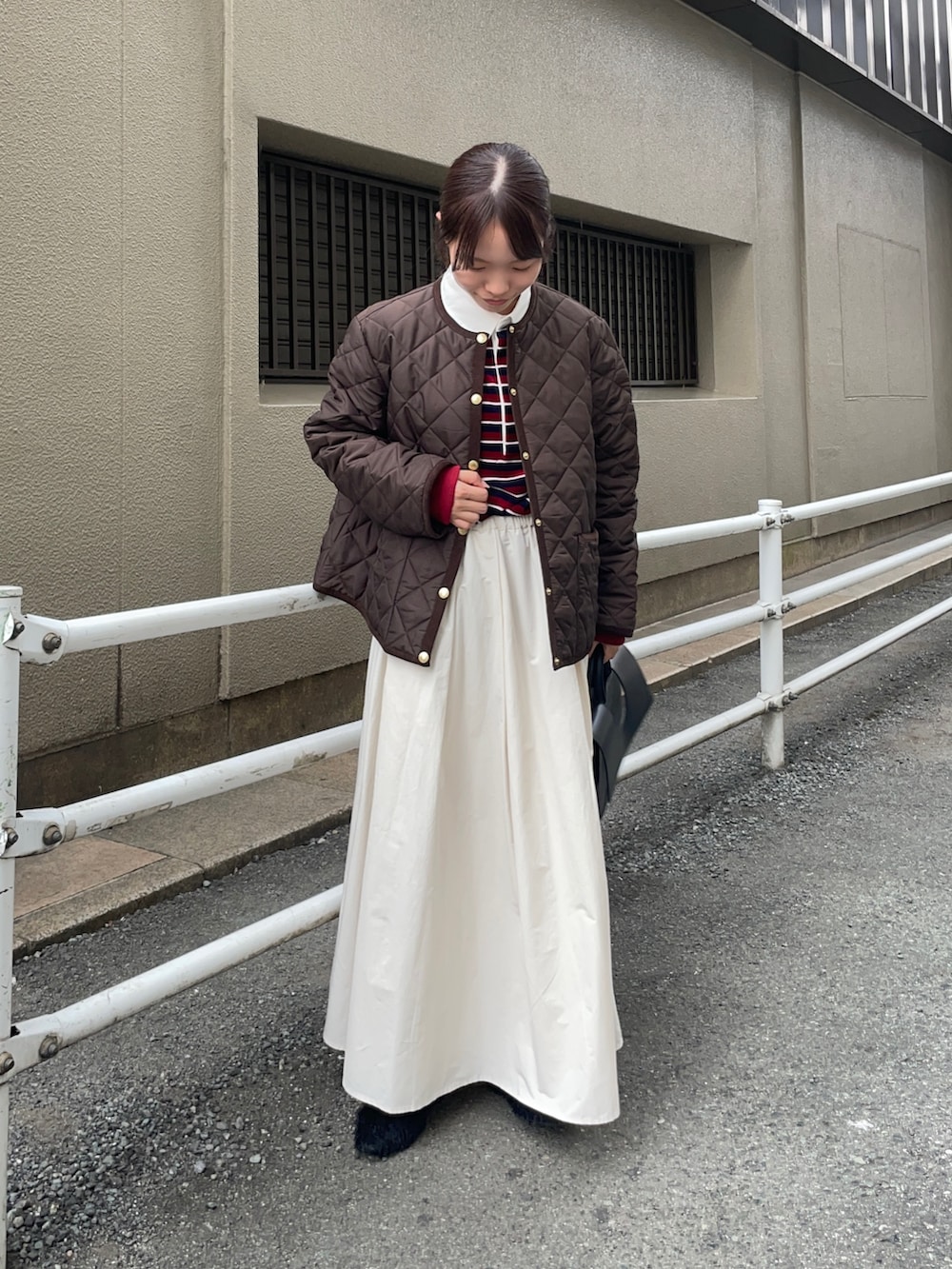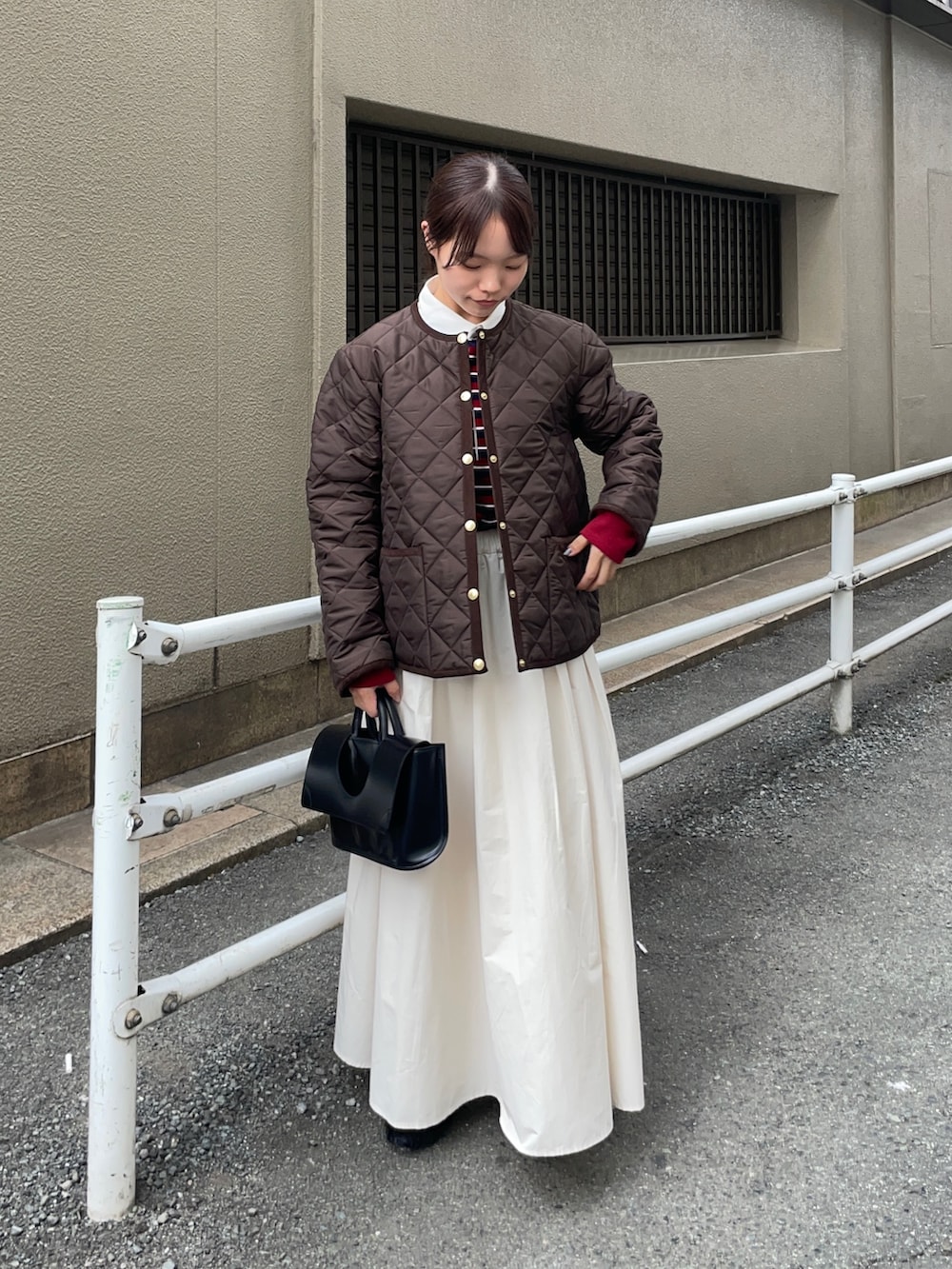 羽織は、Traditional Weatherwearの別注BROWNアイテムで、ブランドのベストセラーキルティングジャケットのARKLEYのモデルです!横向きのスタイリング見るとわかるのですが、Aラインシルエットで、肩のラインが少し落ちたリラックス感のあるデザインです!