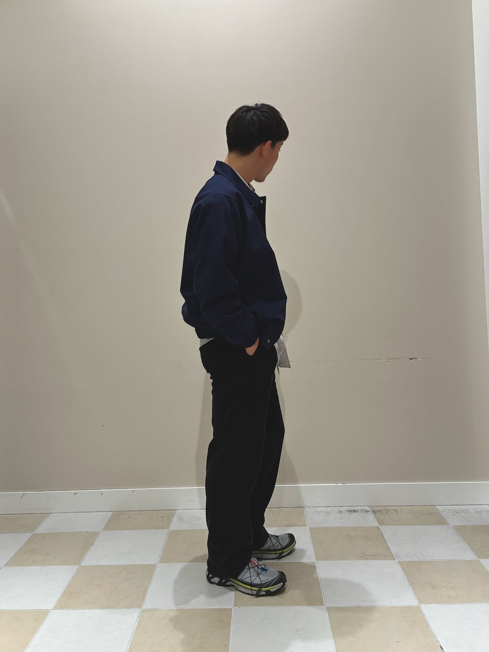 ネイビーのコーチジャケットに、ゆるめシルエットのシャツを合わせた抜け感のある大人カジュアルコーデ。