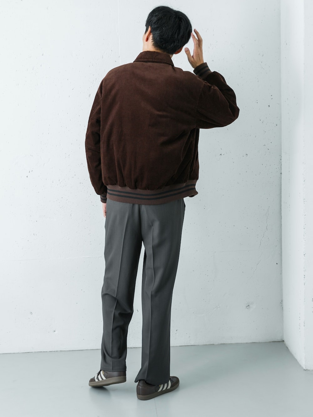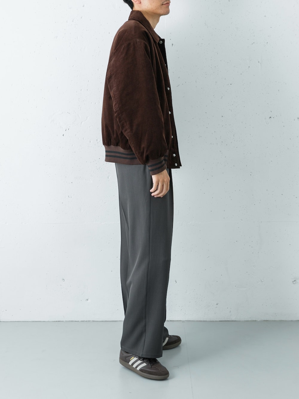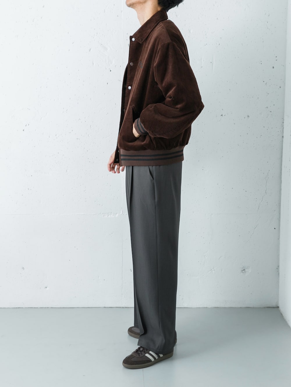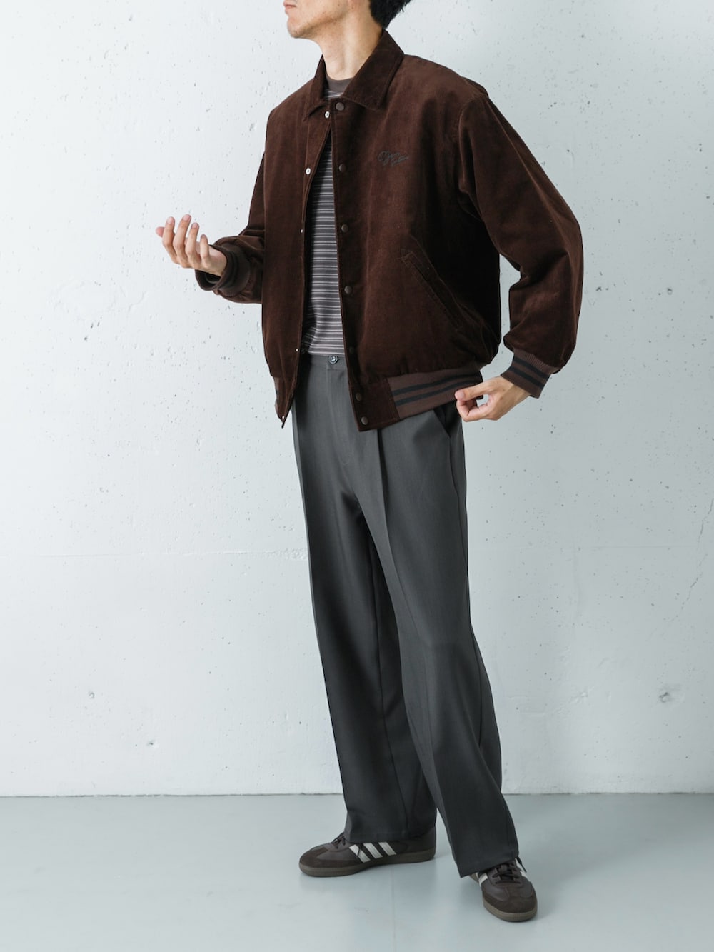 程よい厚みのコーデュロイブルゾンを主役に、柔らかな着心地のカットソーを合わせたカジュアルスタイル。