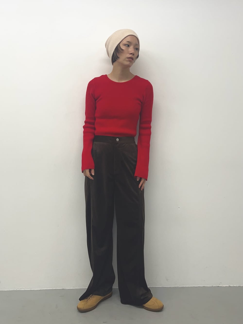 ボトムスにはややルーズ目なコーデュロイパンツ。