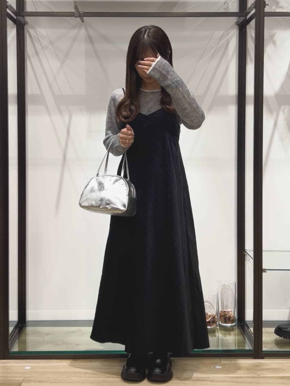 落ち着いた色を来てシックに揃えつつ、シルバーのバッグで少し華やかさをプラスしました!