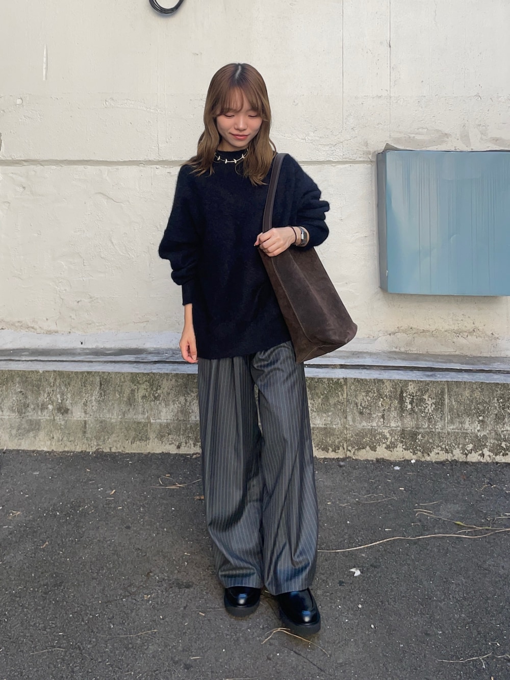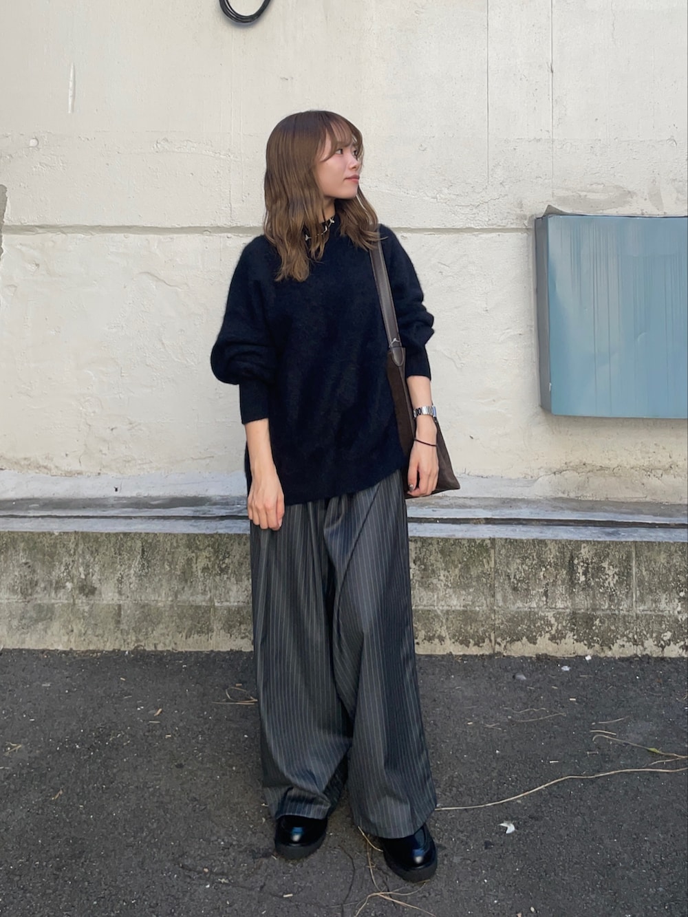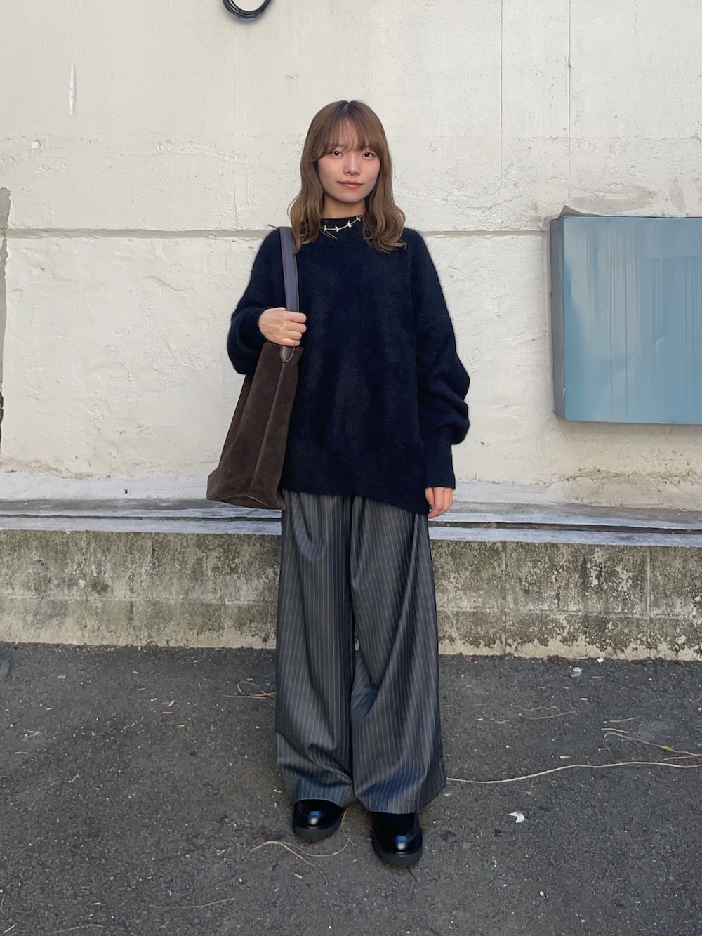 トップスのニットはウールとカシミヤで出来たルーズニットで、フワフワな見た目とゆったりとしたシルエットアイテムです!他のピンクとベージュのカラーも可愛くてオススメですよ〜!ウールのチクチク気になる方はインナーにカットソーやタートルネックと合わせたら、気にならないと思います!
