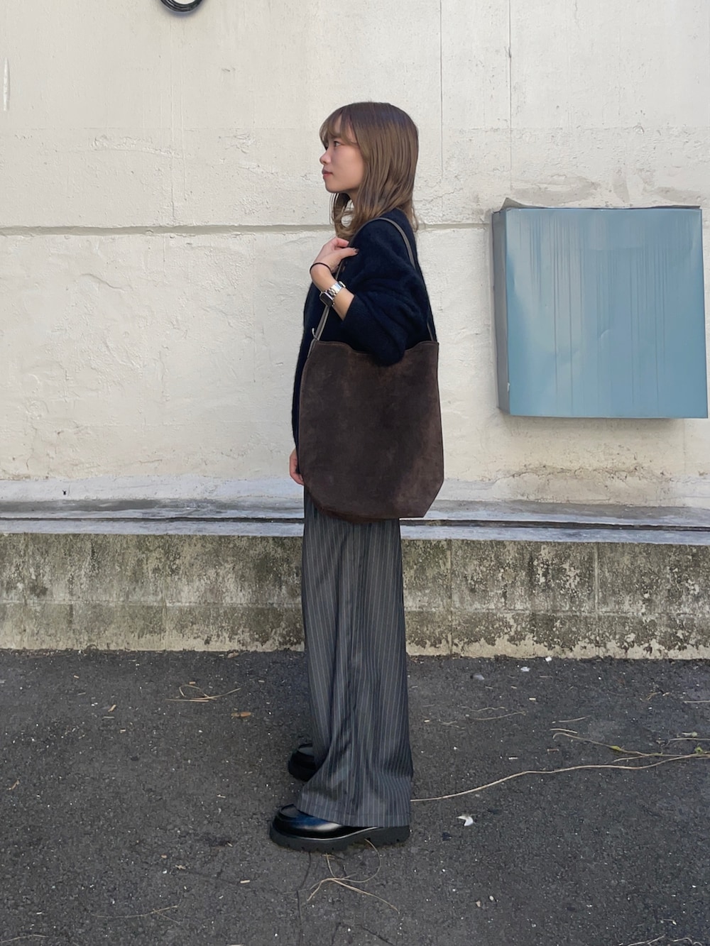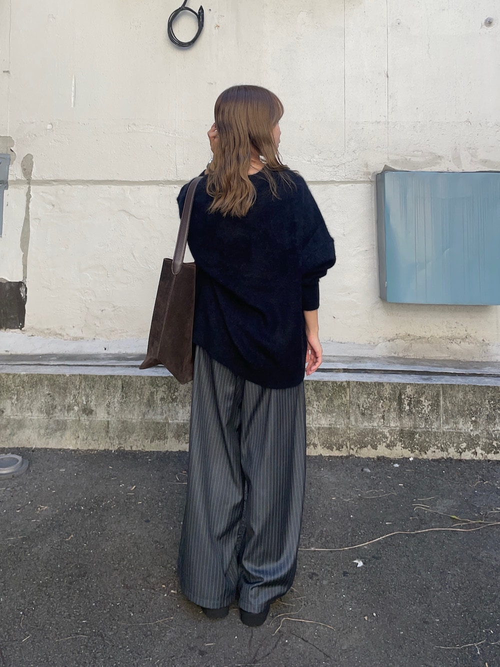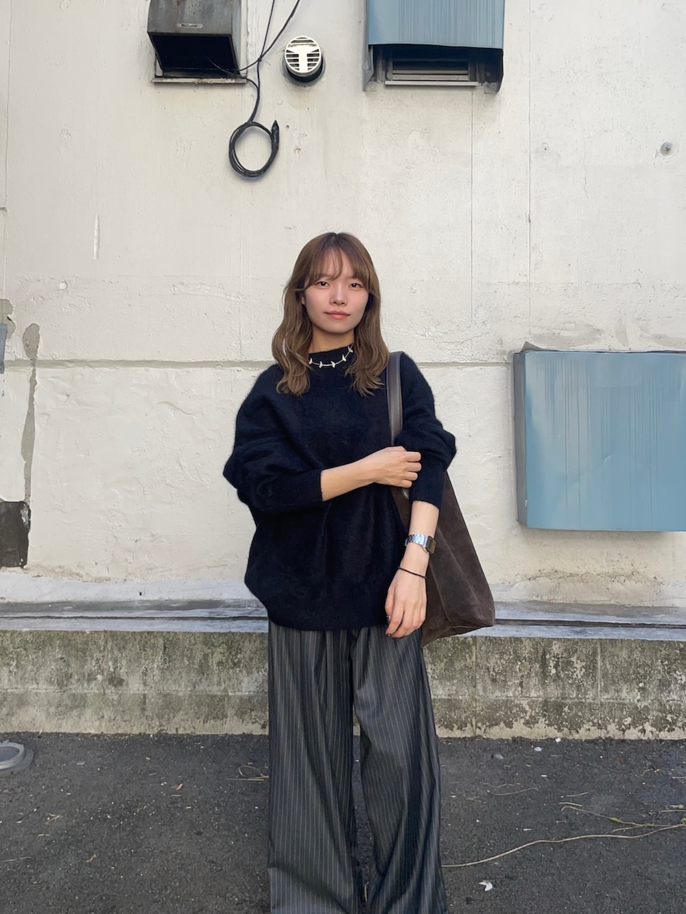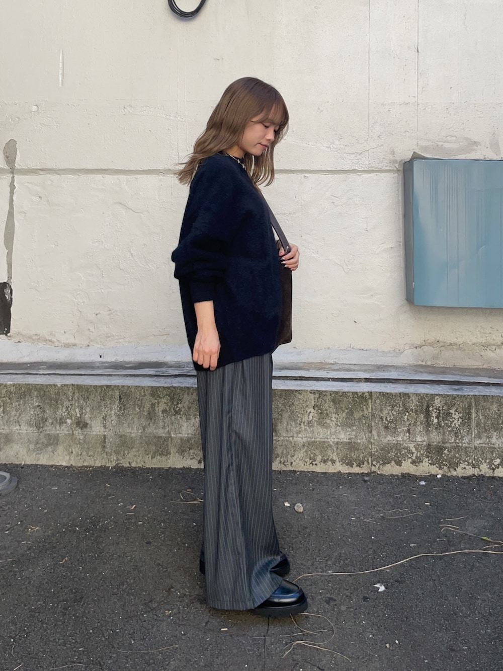トップスのニットはウールとカシミヤで出来たルーズニットで、フワフワな見た目とゆったりとしたシルエットアイテムです!他のピンクとベージュのカラーも可愛くてオススメですよ〜!ウールのチクチク気になる方はインナーにカットソーやタートルネックと合わせたら、気にならないと思います!