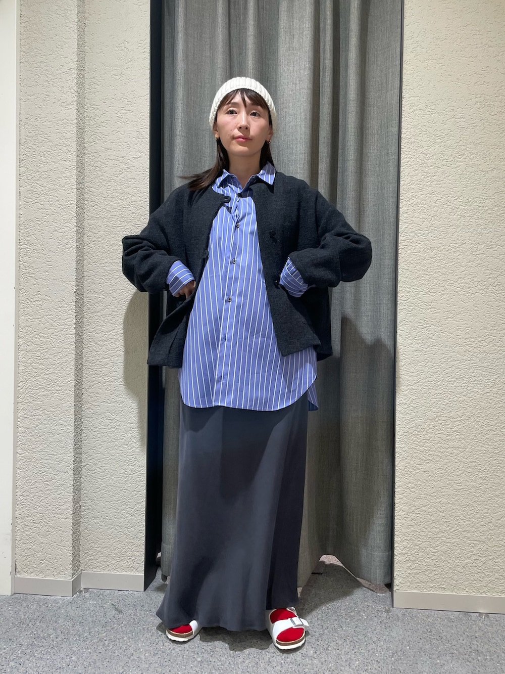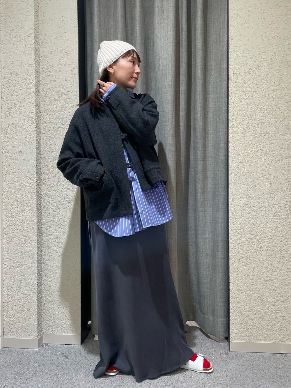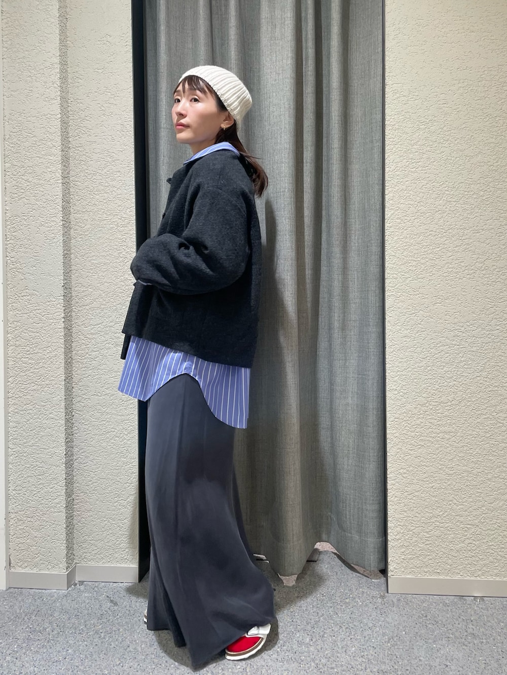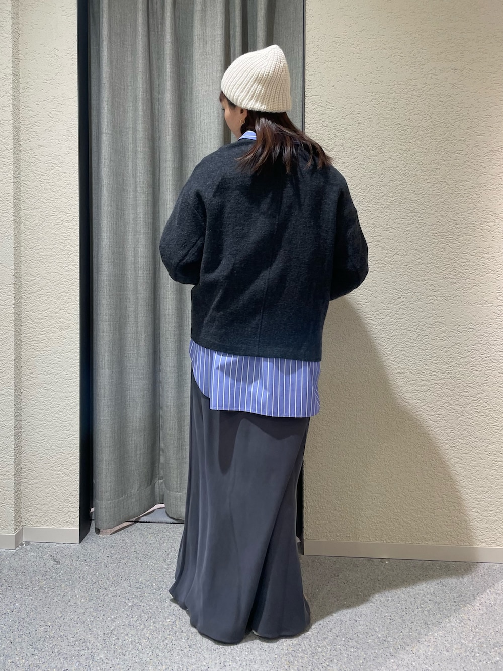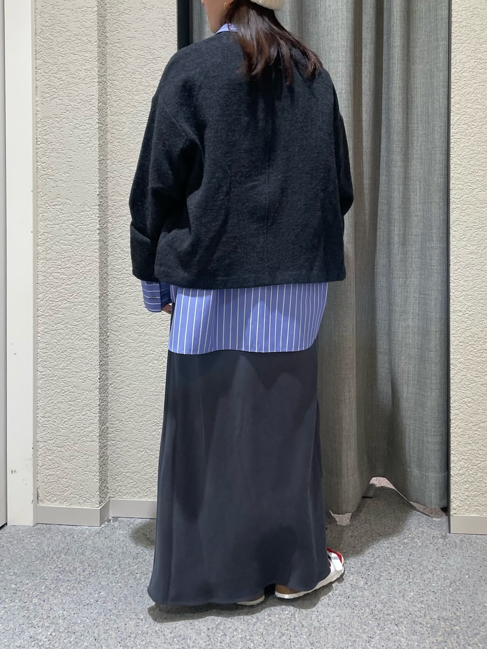 ウールクルーネックジャケットのCHARCOALはシャツとスカート合わせのこなれスタイルで!