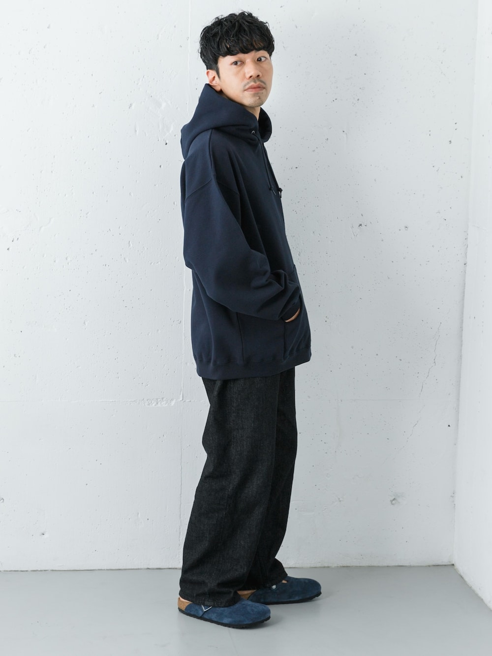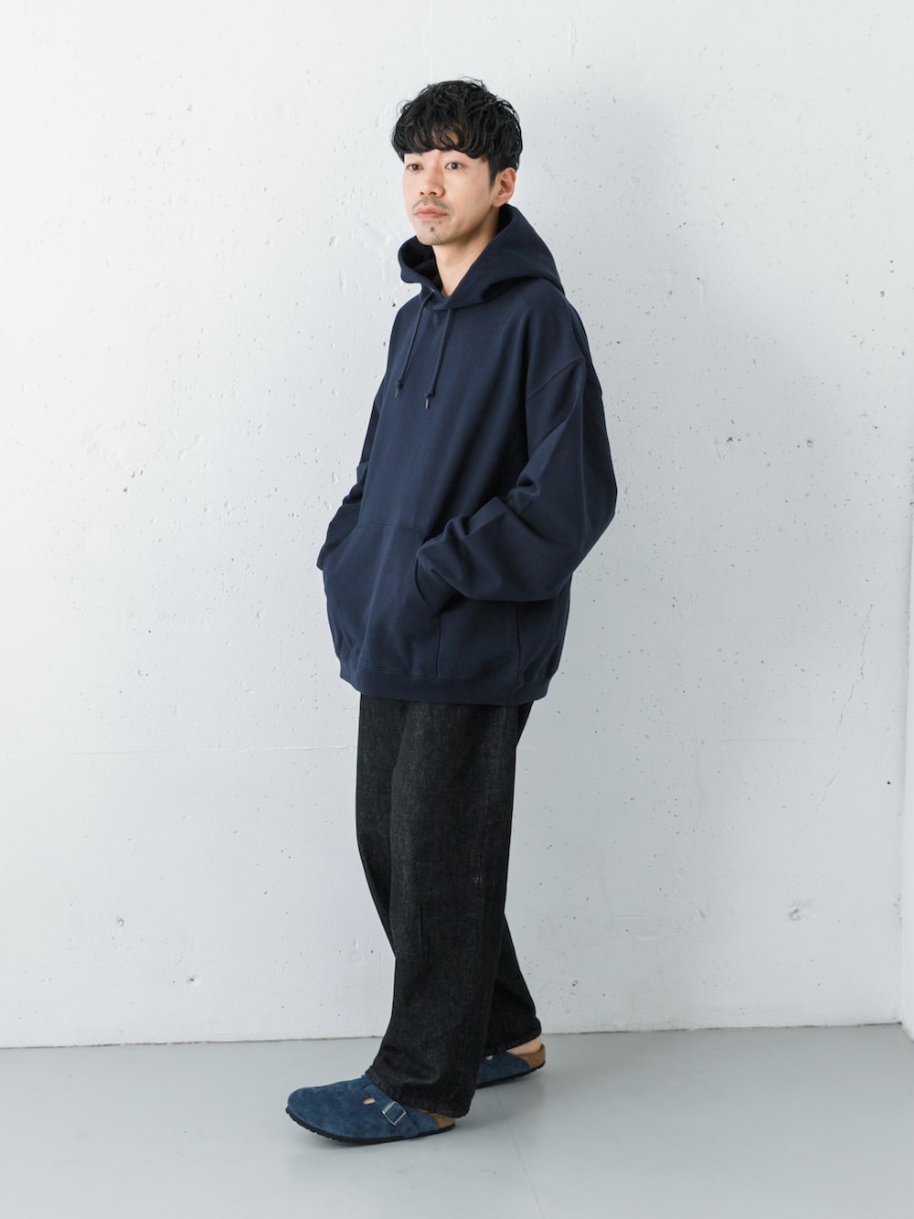 Wide Dadのオーバーなパーカーと別注ビルケンをネイビーでリンクさせました。