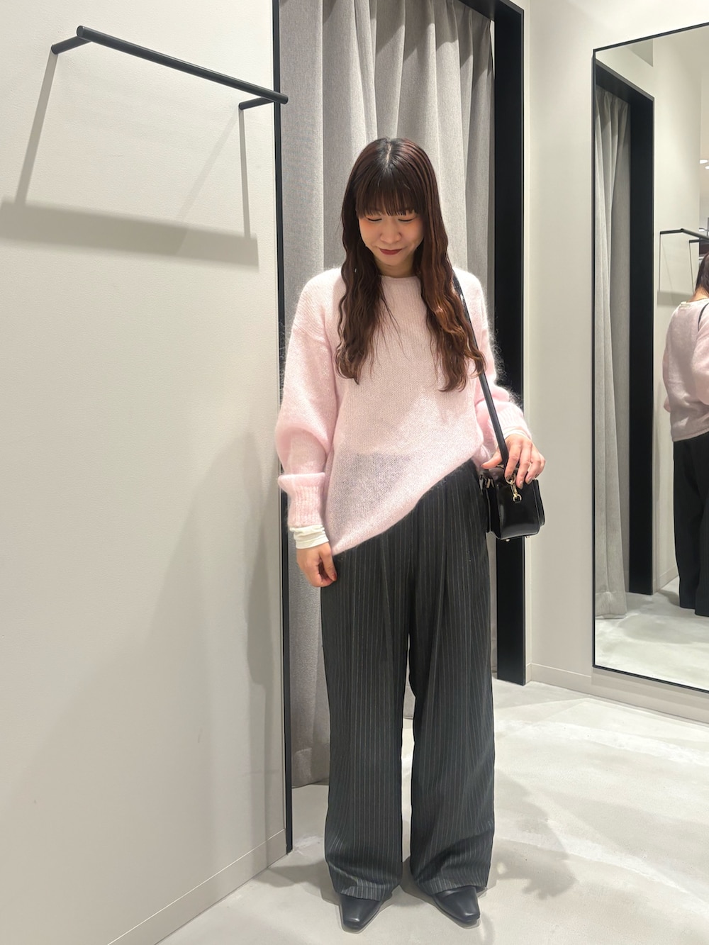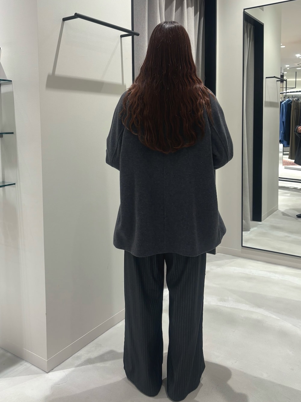 毎年人気なスーパー100ウールを使用したPコート!着心地はふわっと軽いのにすごく暖かいです✨ピンクのニットにグレーのアウターとパンツで甘くなりすぎないコーデです🩶