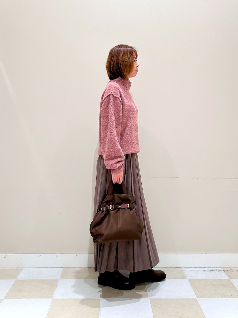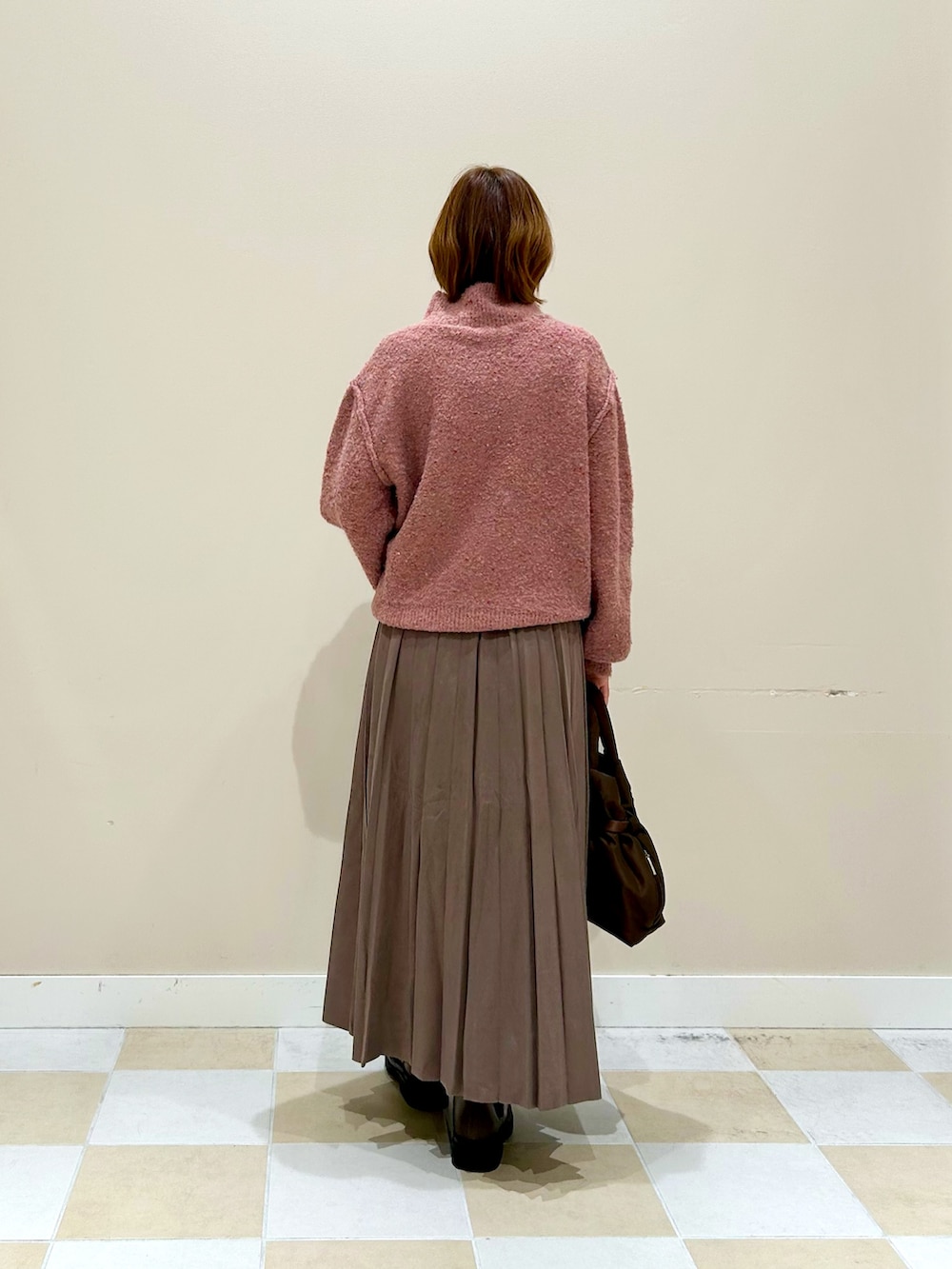 シャーベットカラーが優しい雰囲気で可愛いハイネックニットに、サテンプリーツスカートで柔らかい印象のスカートコーデにしました!