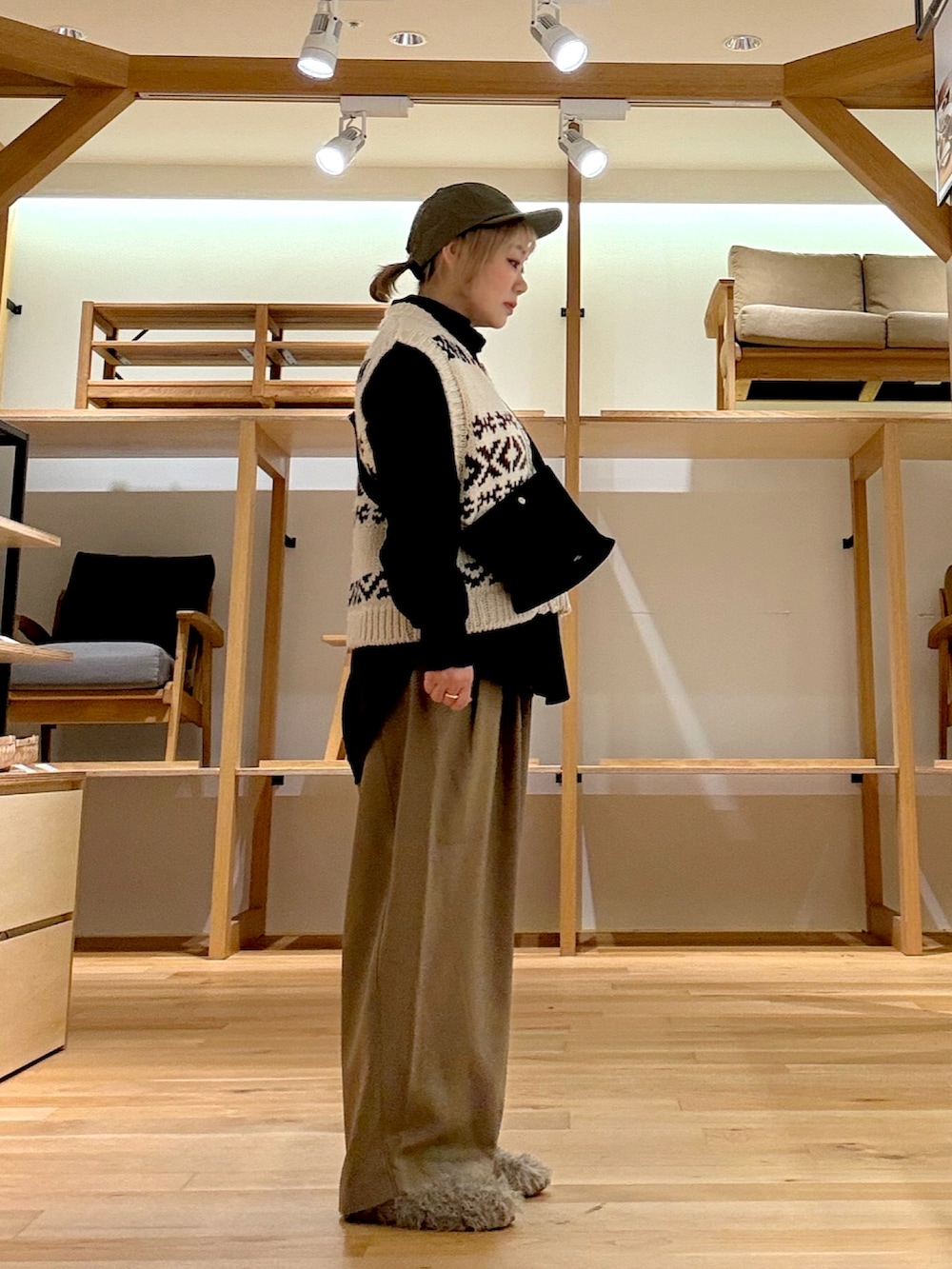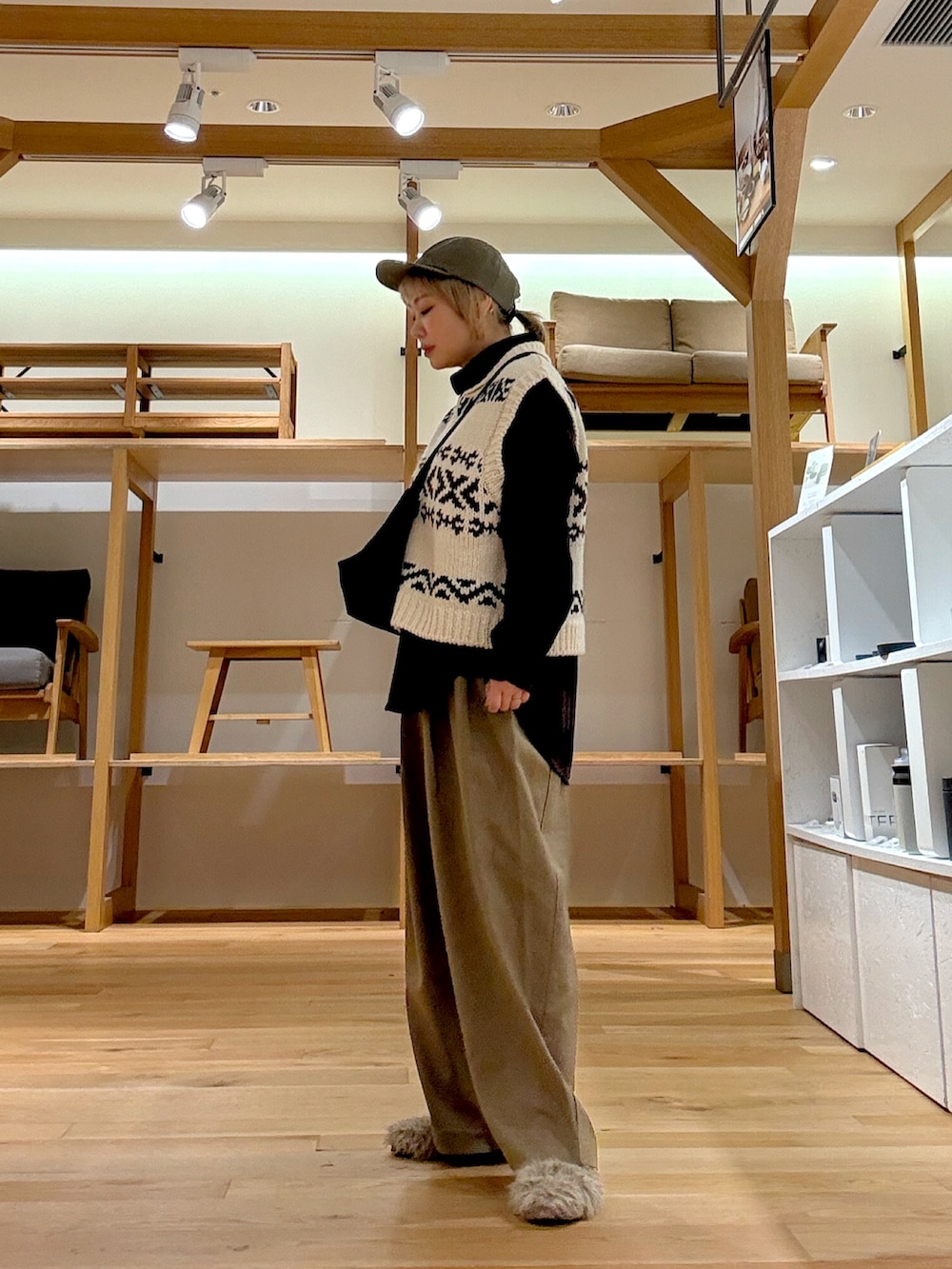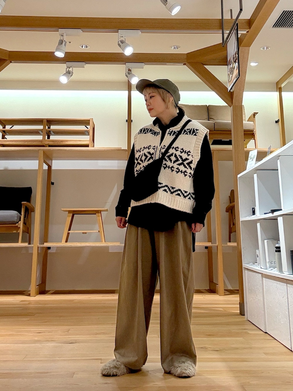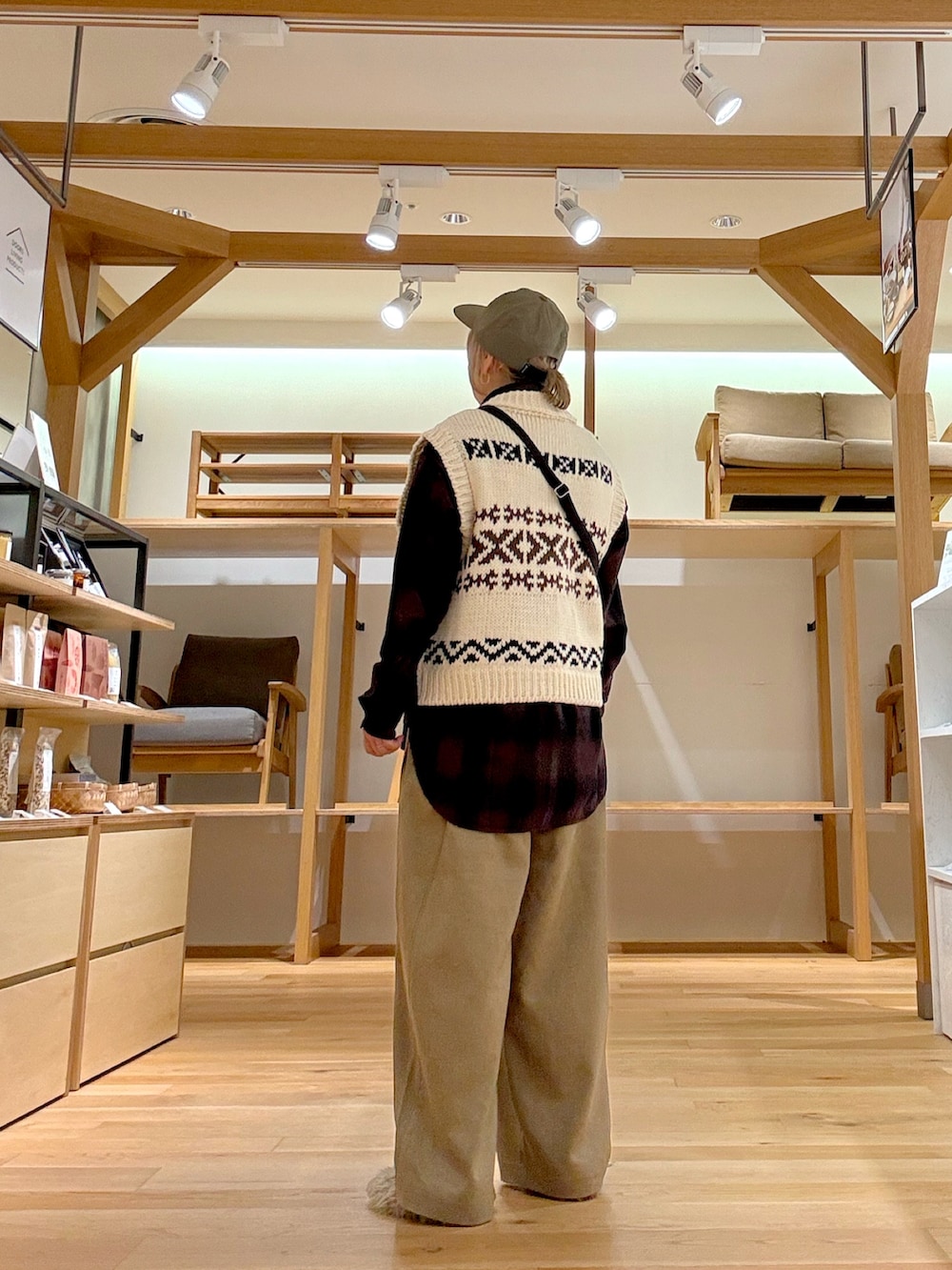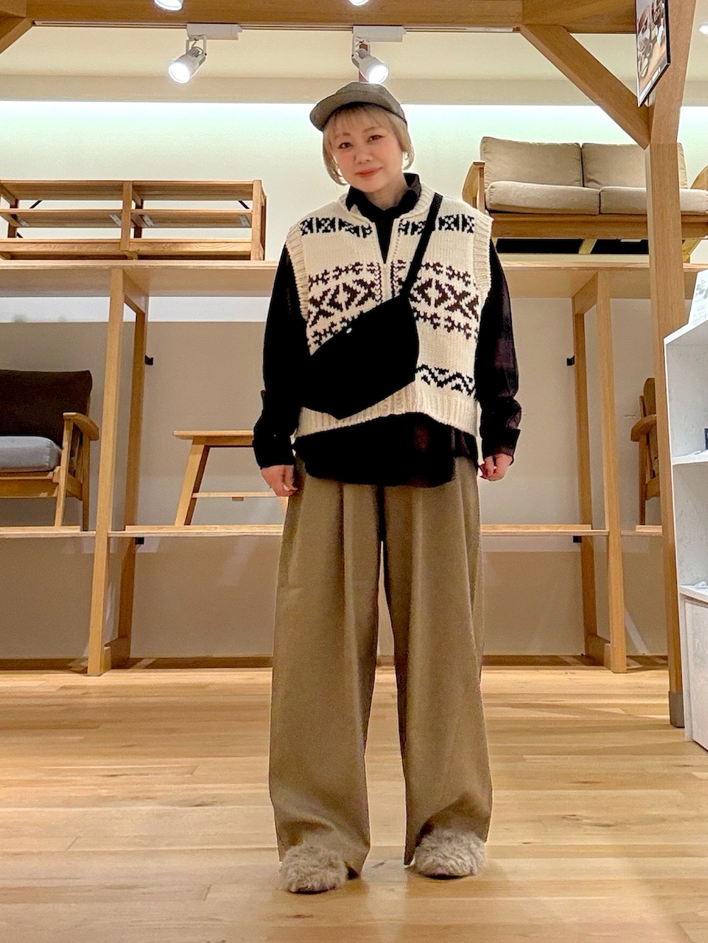 ブラウンチェックのシャツはコットン100%で柔らかく着心地が良いです。生地が暖かいのでこの時期におすすめです。シャツだけでもたくさん着回せるアイテムです。シャツの上に合わせたカウチンベストは着膨れせず、サラッと着れてポイントになるアイテムです。こちらも柔らかく軽いのでおすすめです!丈感も程よくショート丈なのでスタイルアップでき、低身長の方にも良いと思います!パンツはウエストゴムで楽ちんですが、きちんと感が出せて、カーブラインもキレイです!