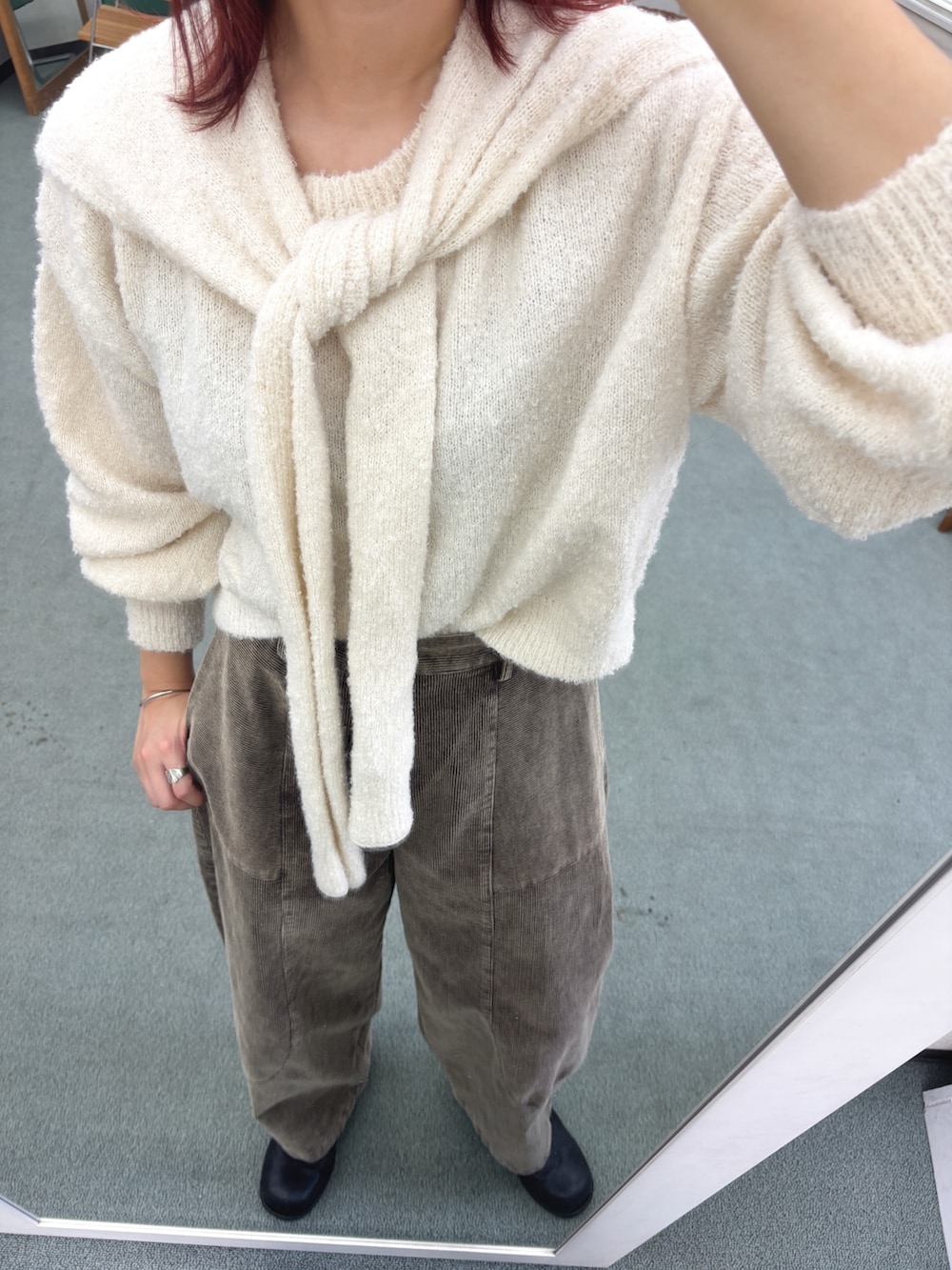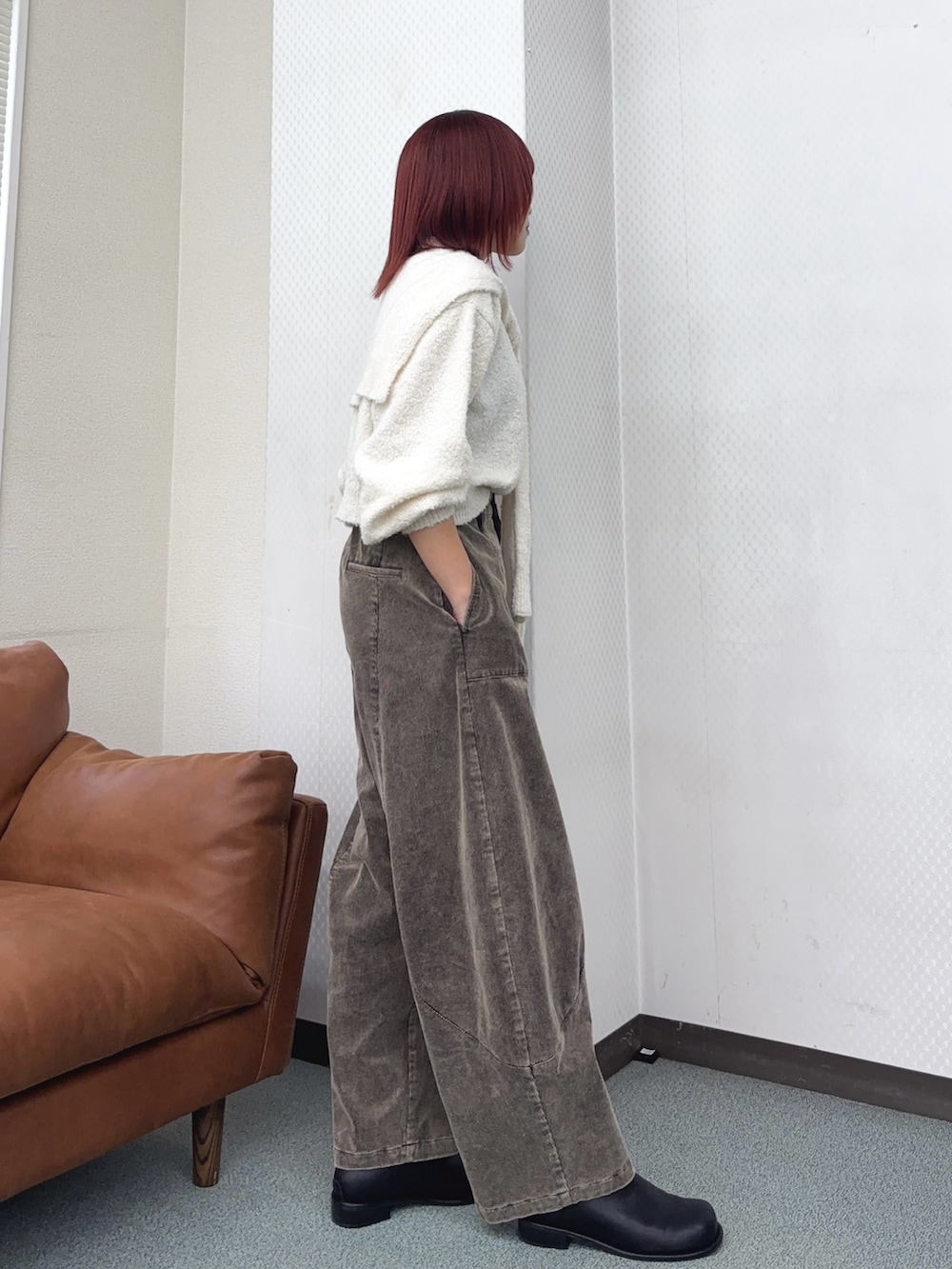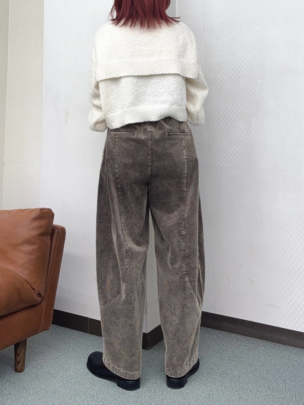 ボトムも合わせやすく、アウターも上に着込みやすいのがポイント!