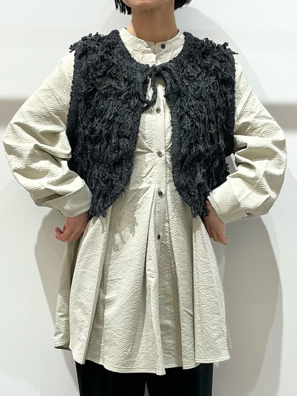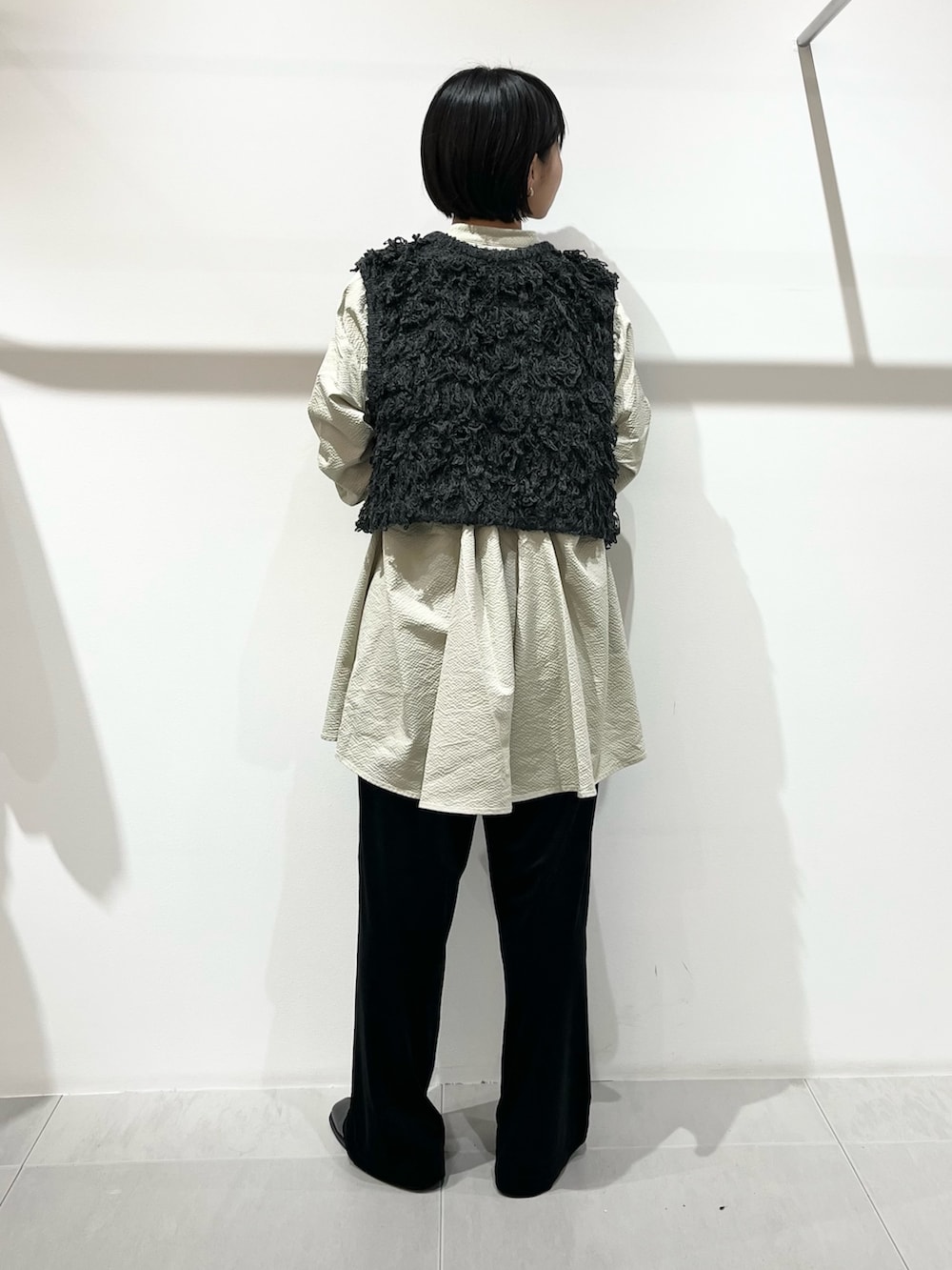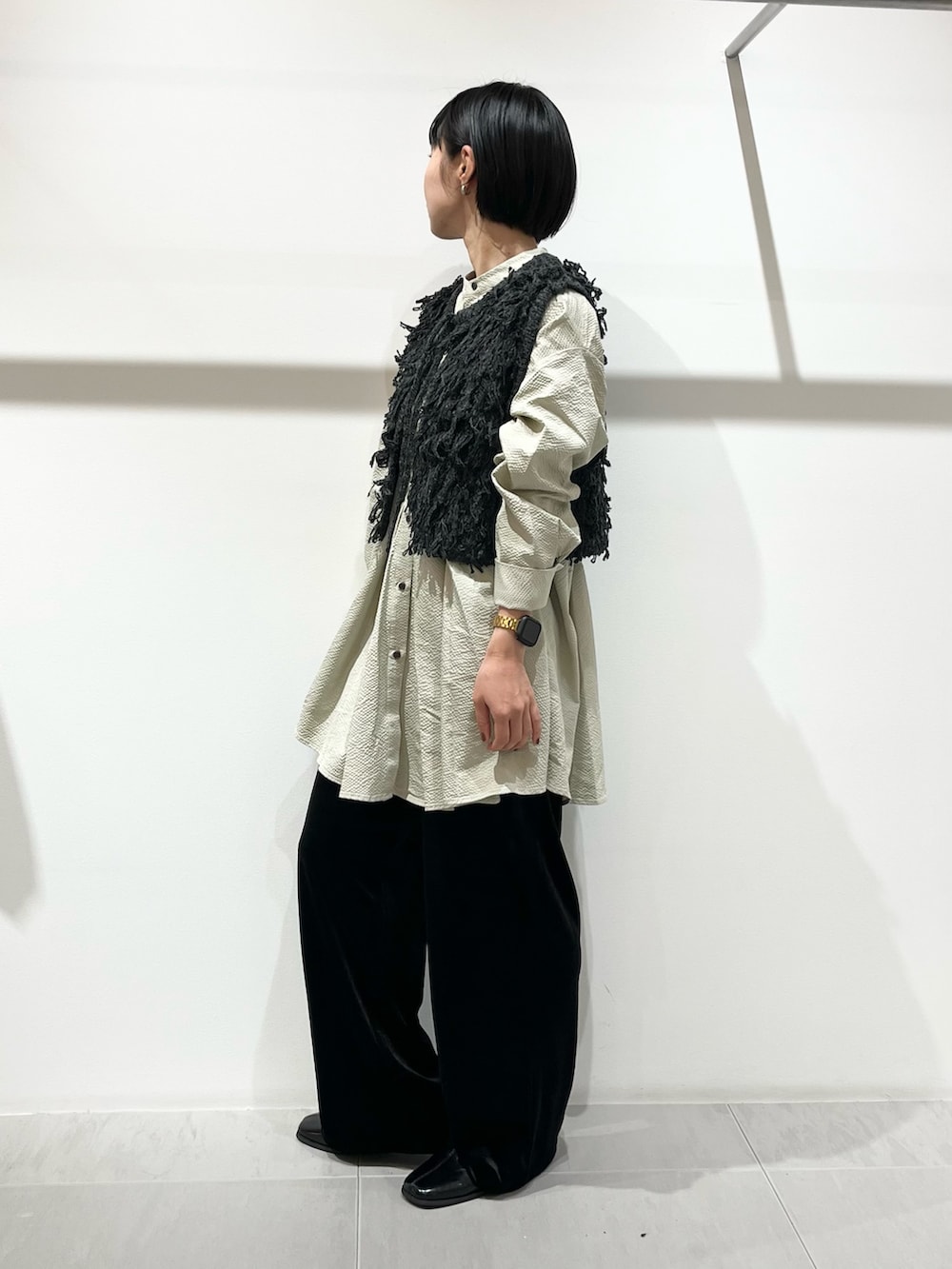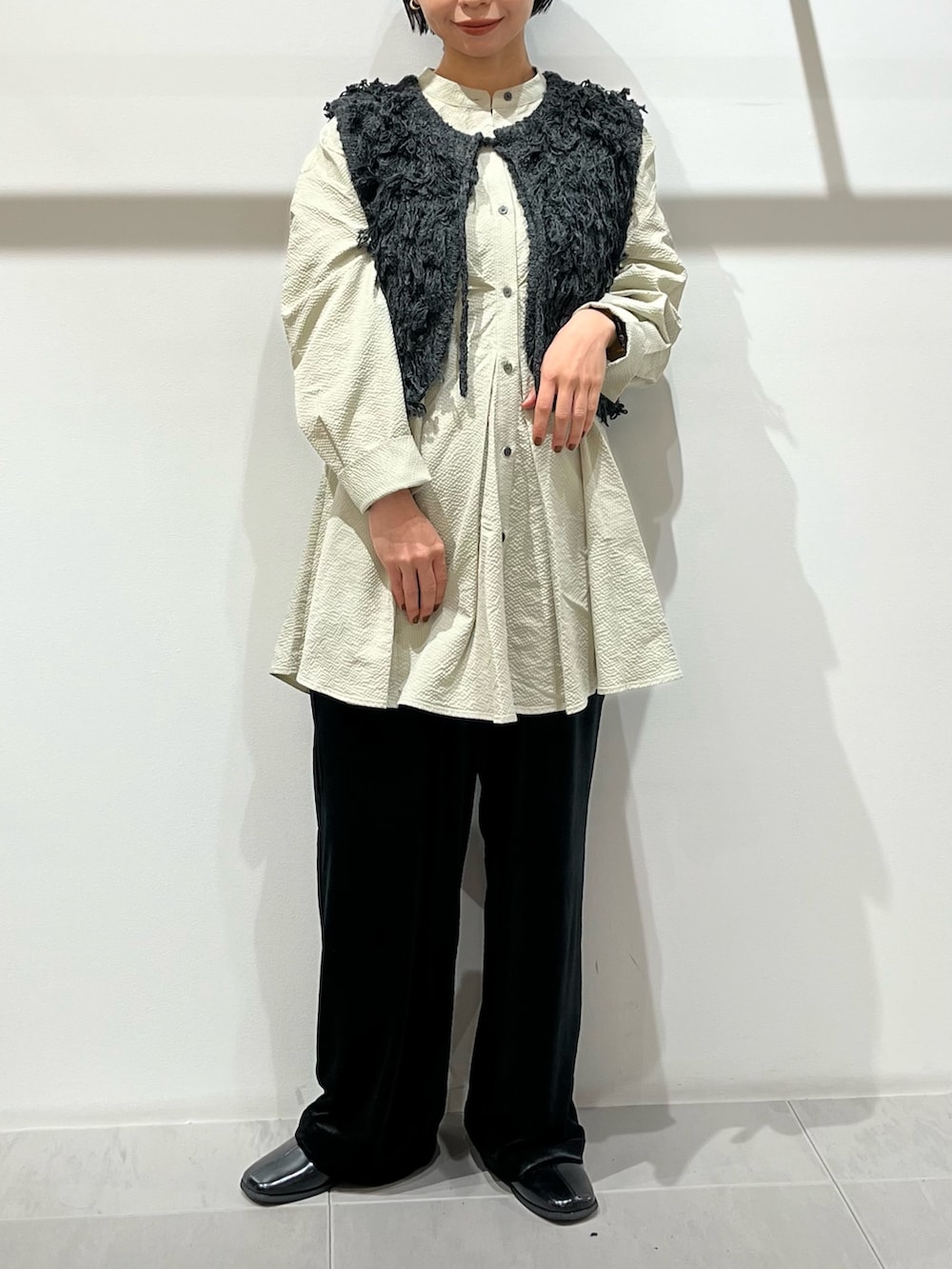 サージカラーが顔映りを明るくしてくれるシャツです。ニットベストはTEE、ワンピース、シャツなんでもプラスすると秋らしくしてくれます!