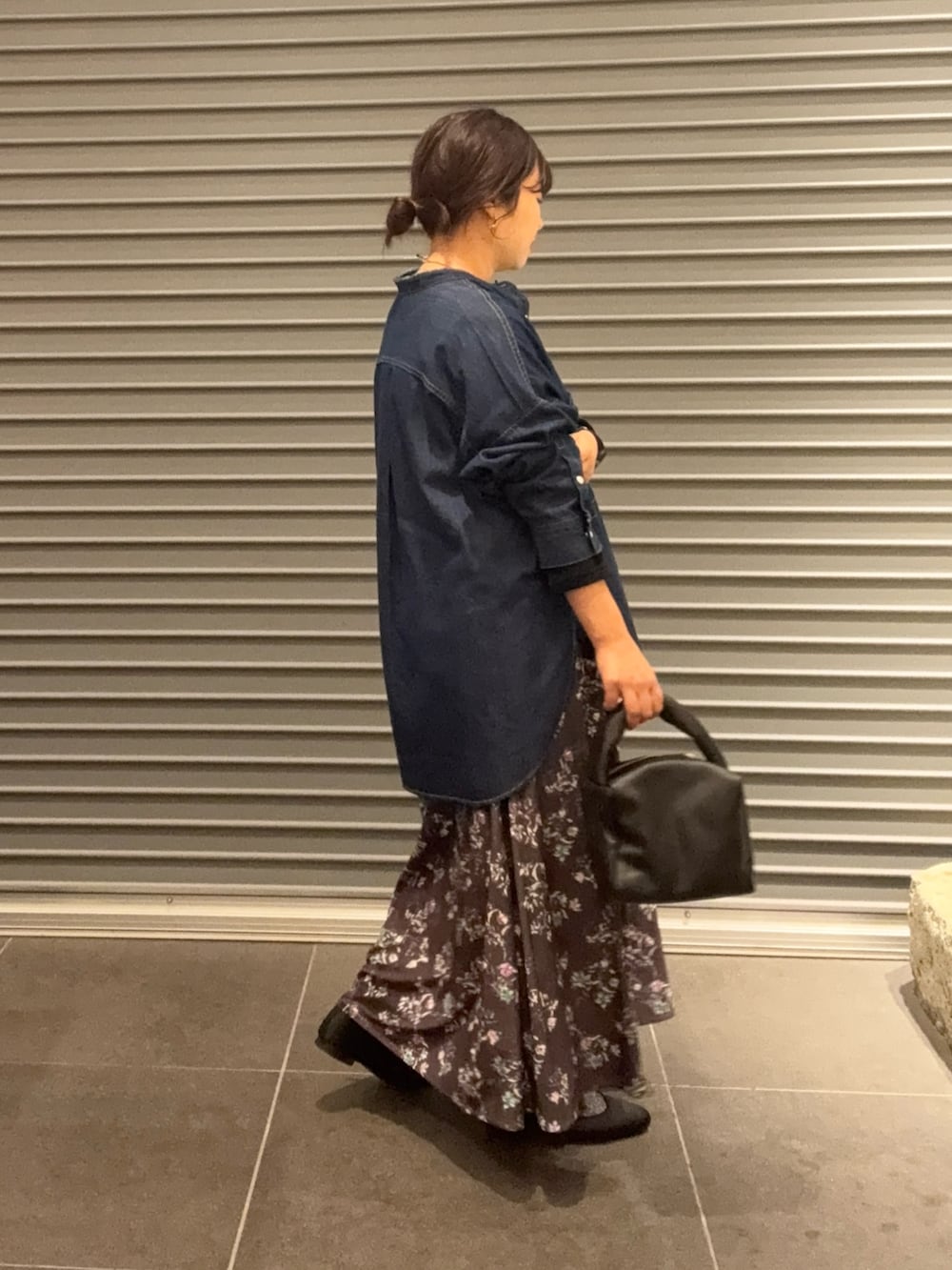 ベロアスカートはフラワープリント柄が秋冬コーデのポイントに。ウエストは総ゴムなのでマタニティでも大丈夫でした。