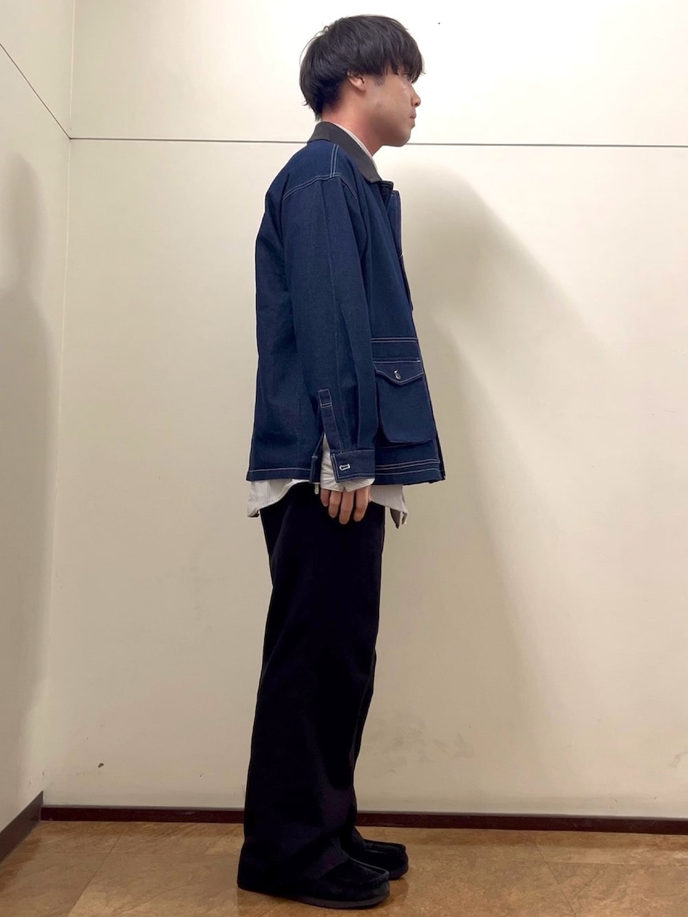 デニムはカジュアル要素が強いので、下にシャツを合わせたり、ボトムスをスラックスにしたりするとバランスがとれますよ!