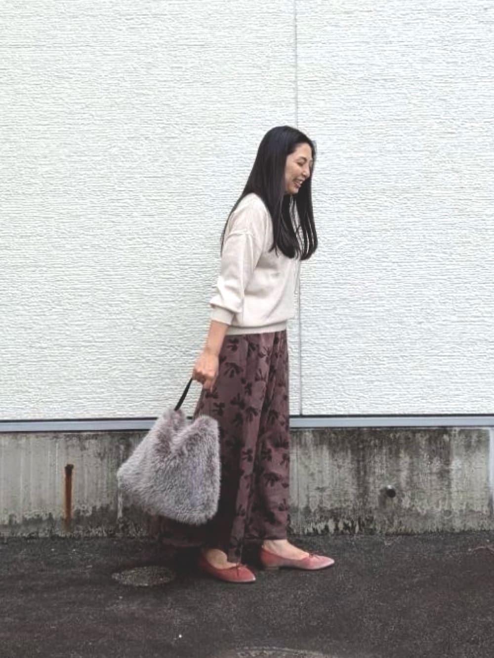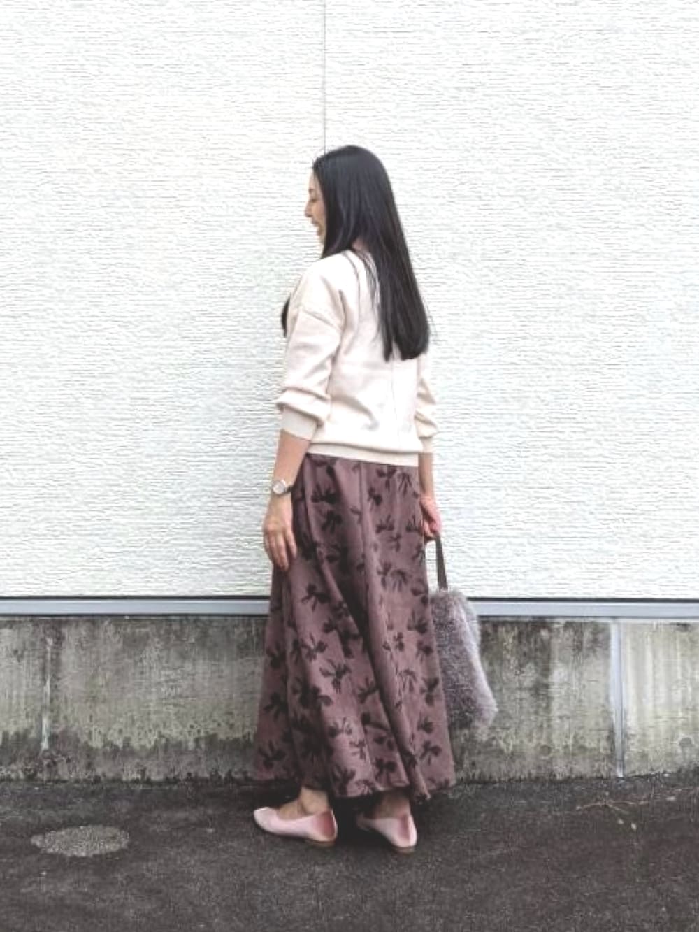 スカートは、ウエストがゴムでラクなのに、シルエットがきれいです。フェイクスエードの質感が柔らかく、高見えします。フレアシルエットが女性らしく、オンオフどちらにも使えます。