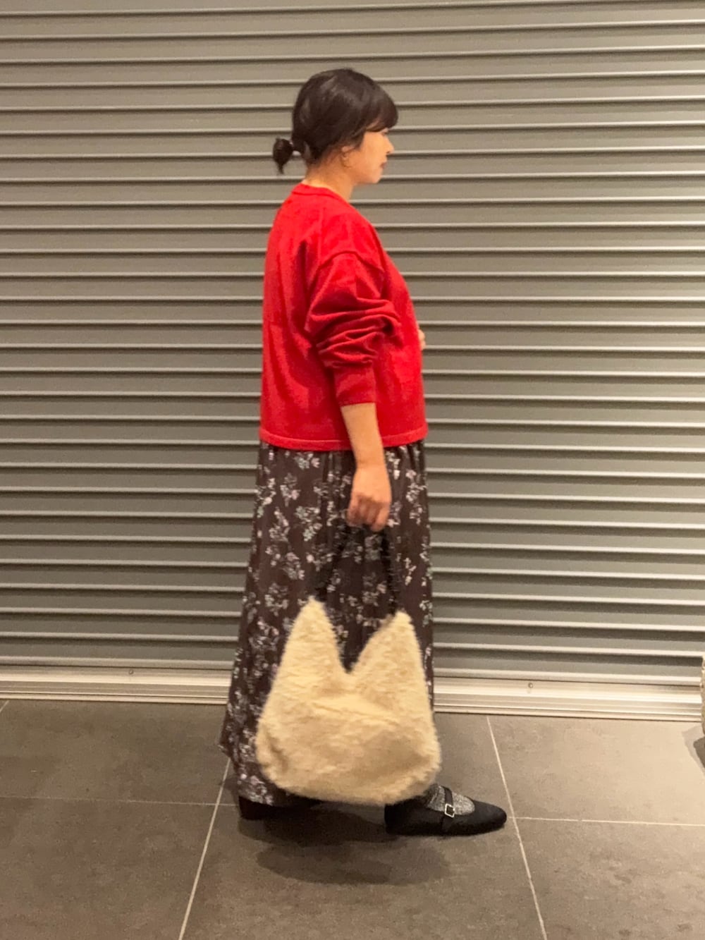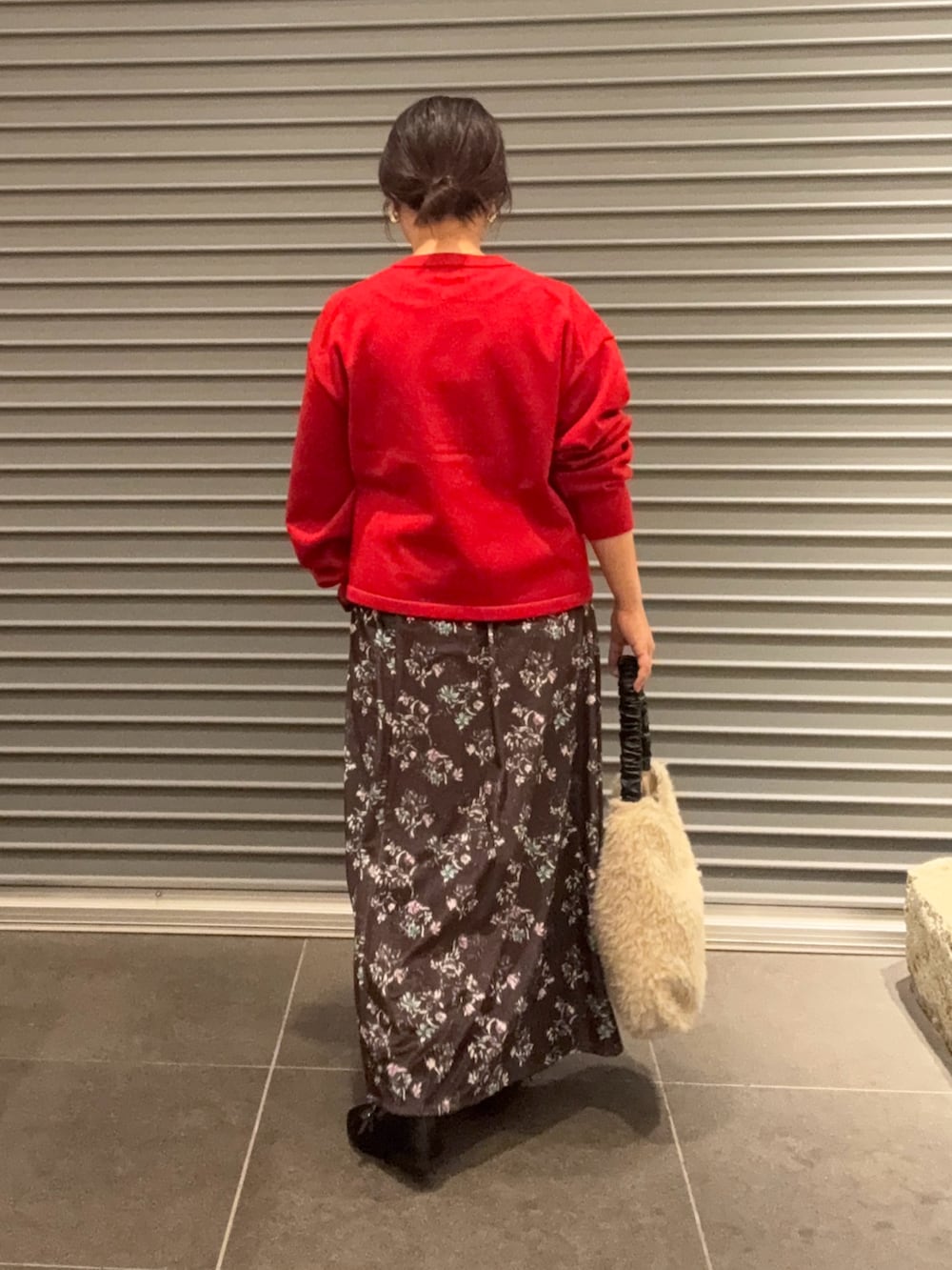 ベロアスカートは上品なフラワープリントが秋冬コーデのポイント使いに。ウエストも総ゴムでストレスフリーです。