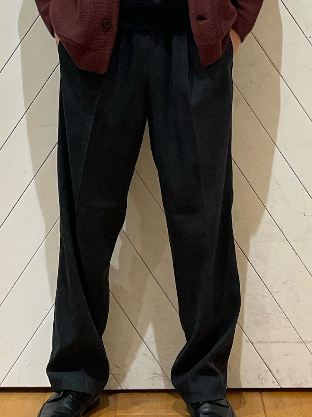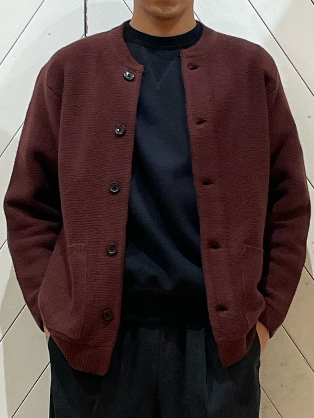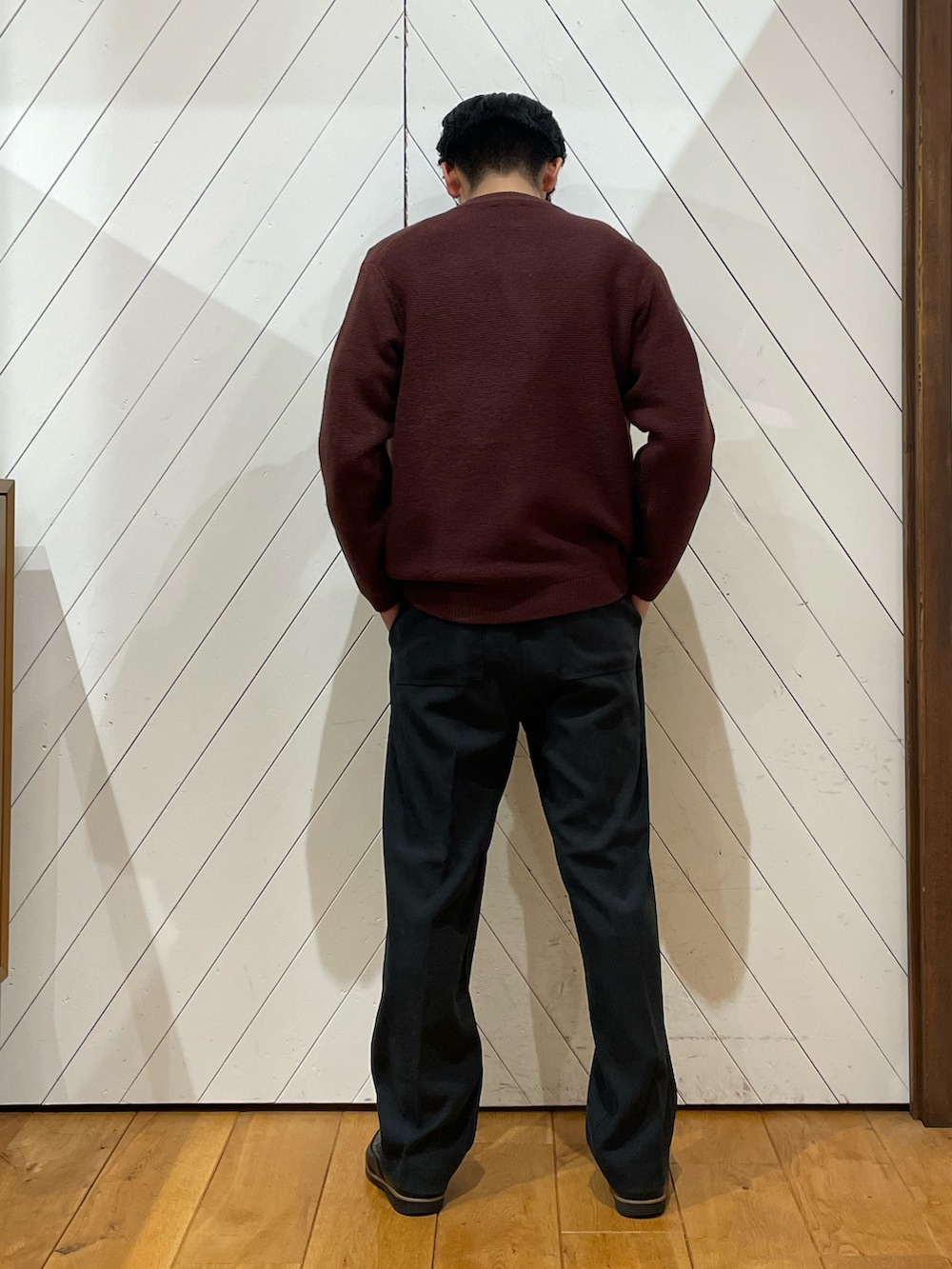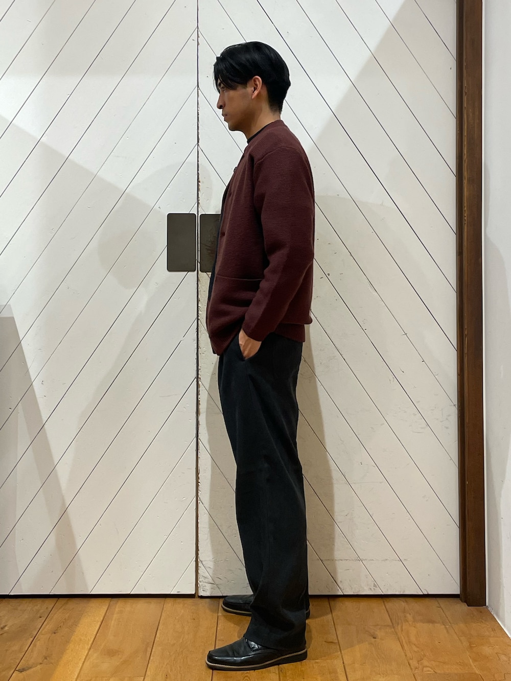暗めな赤色のカーデにシンプルな黒色のパンツであわせました。
