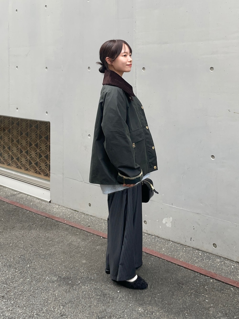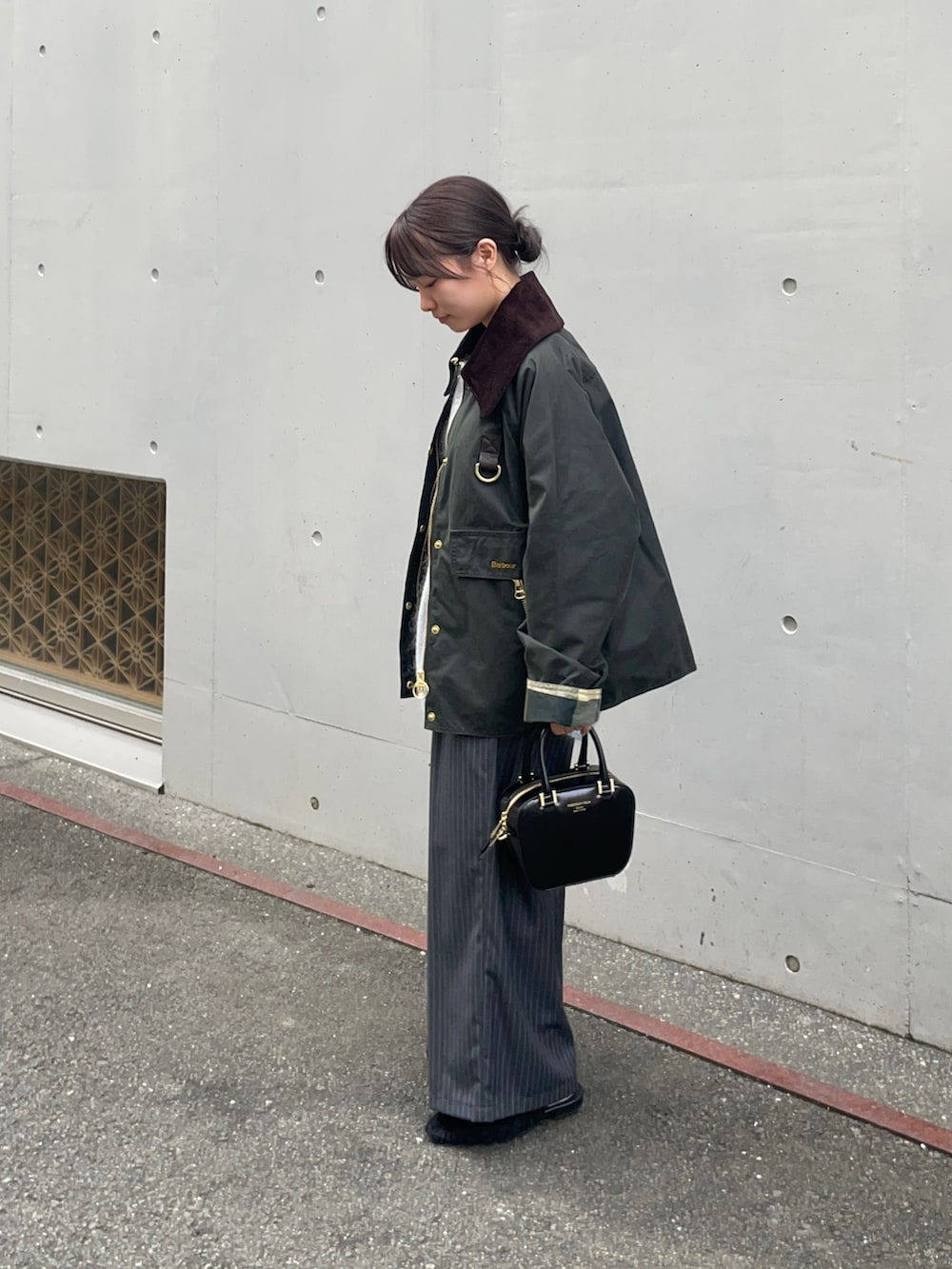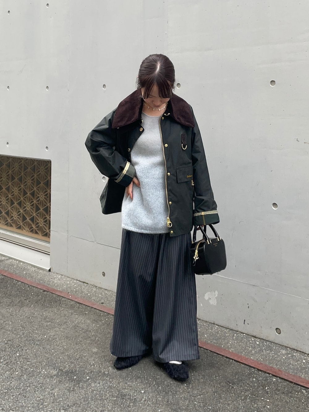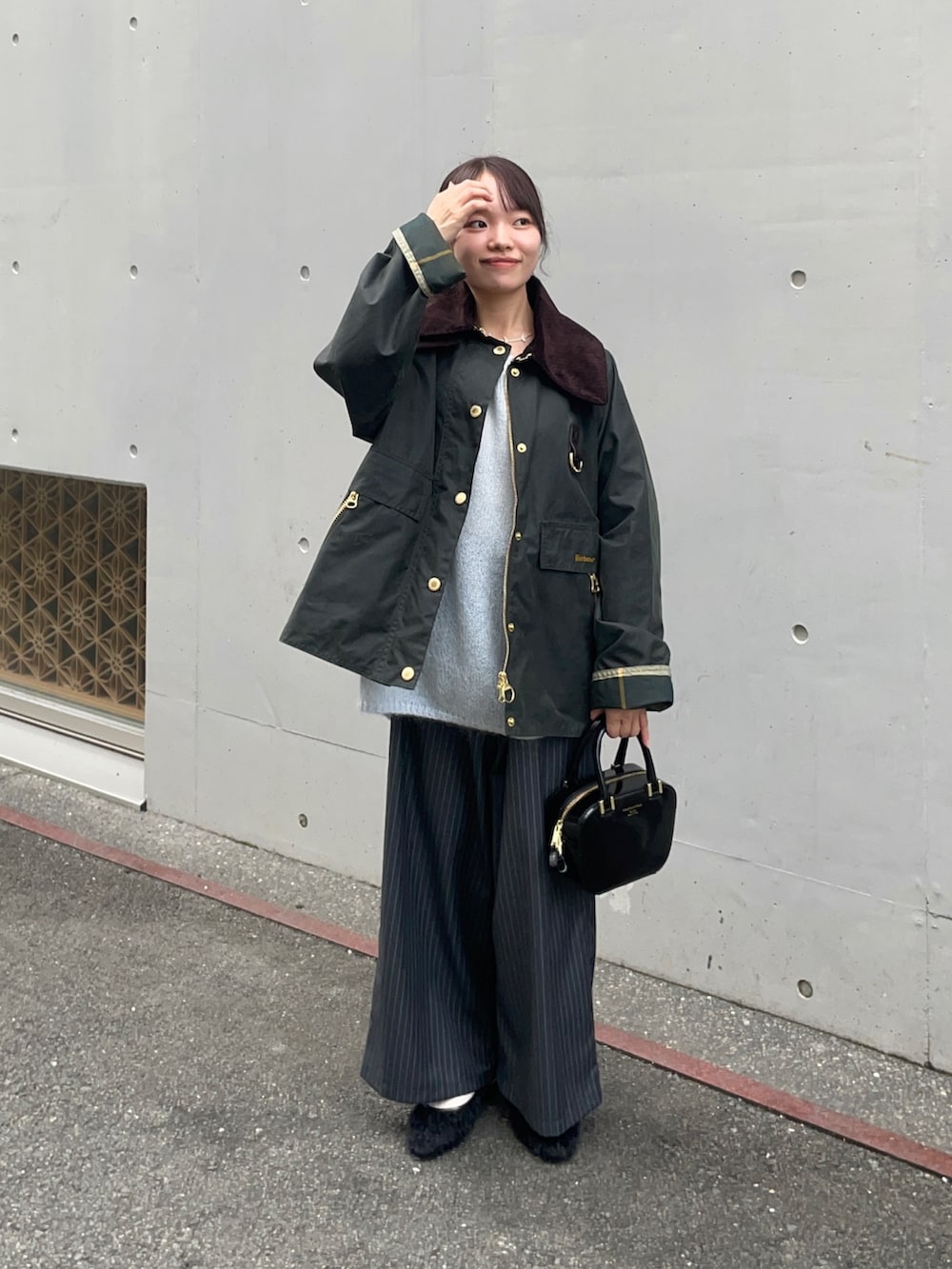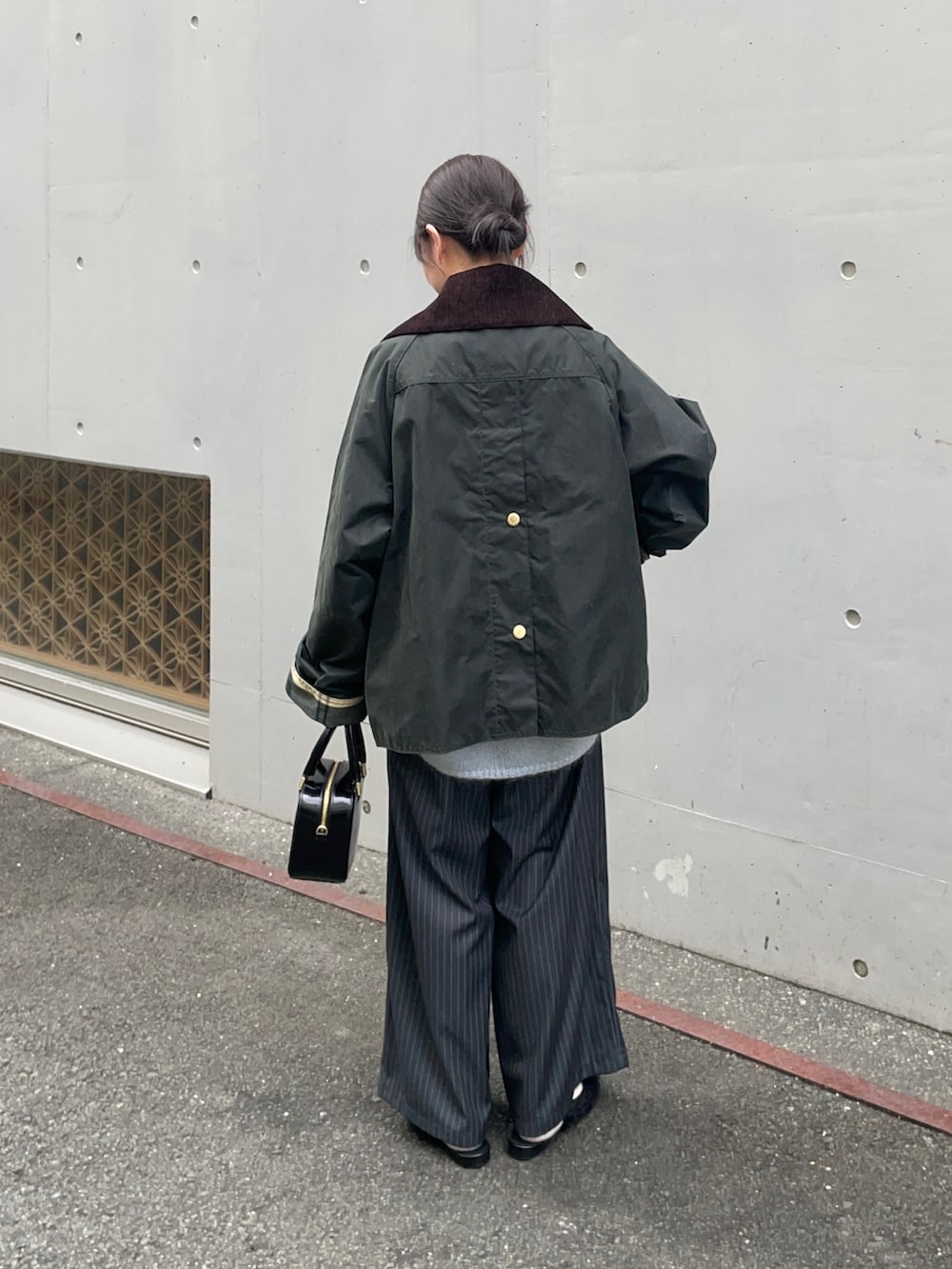 ジャケットはBarbourのcotton wax jacketで、特徴に大きいコーデュロイの襟がついており、小顔効果が叶う嬉しいデザインです!またワックスドクロス製の防水ジャケットは耐久性が高く、経年劣化も楽しめます✨