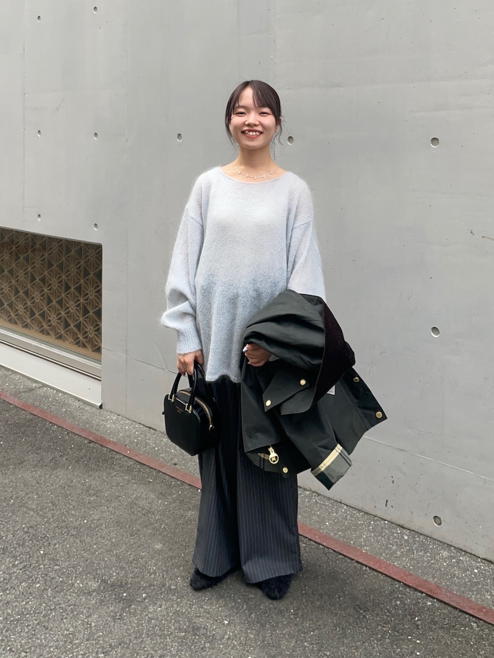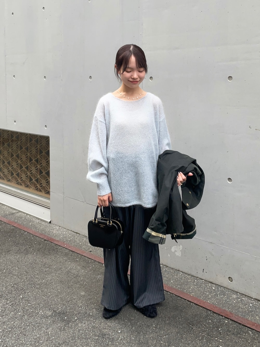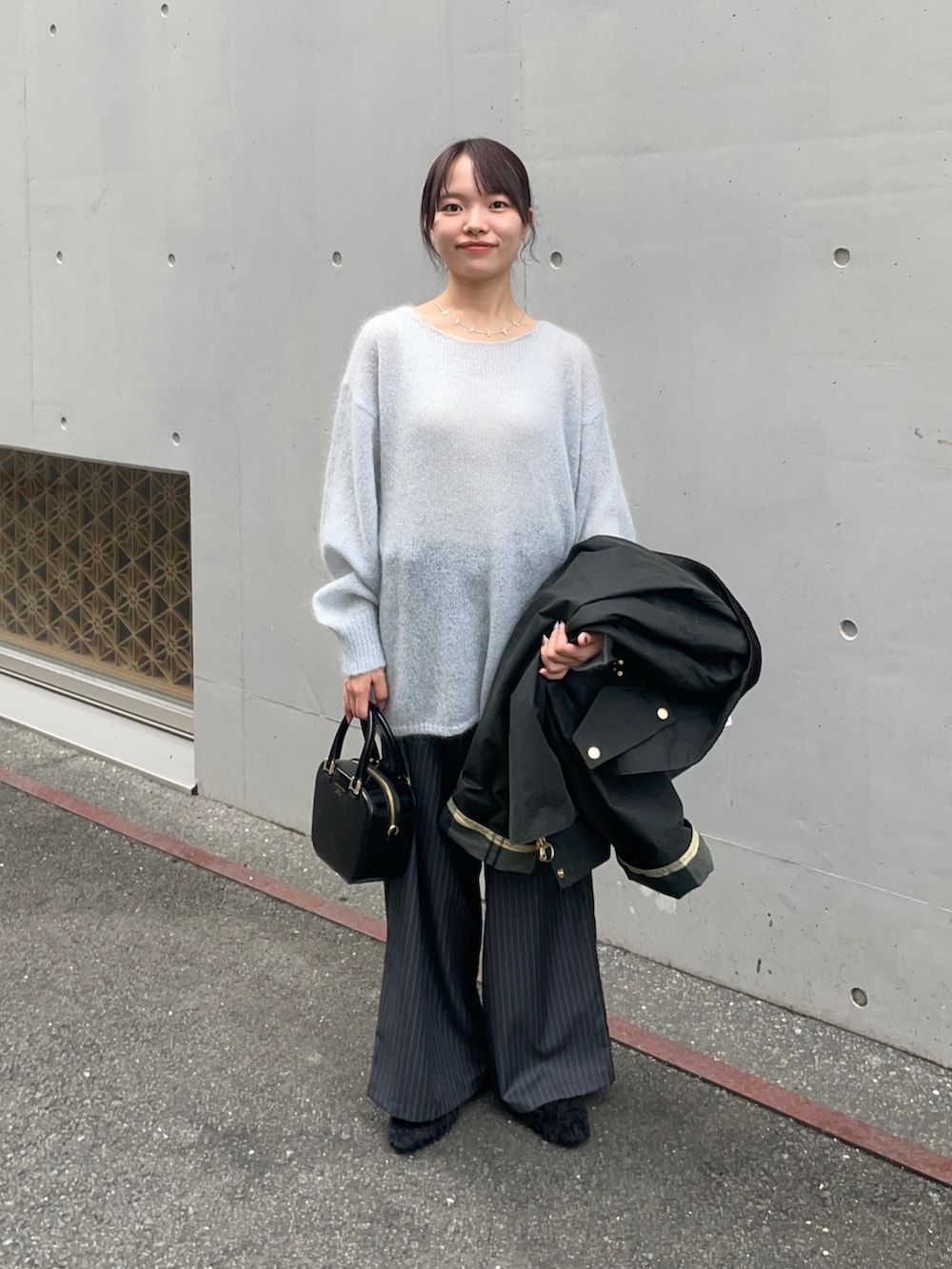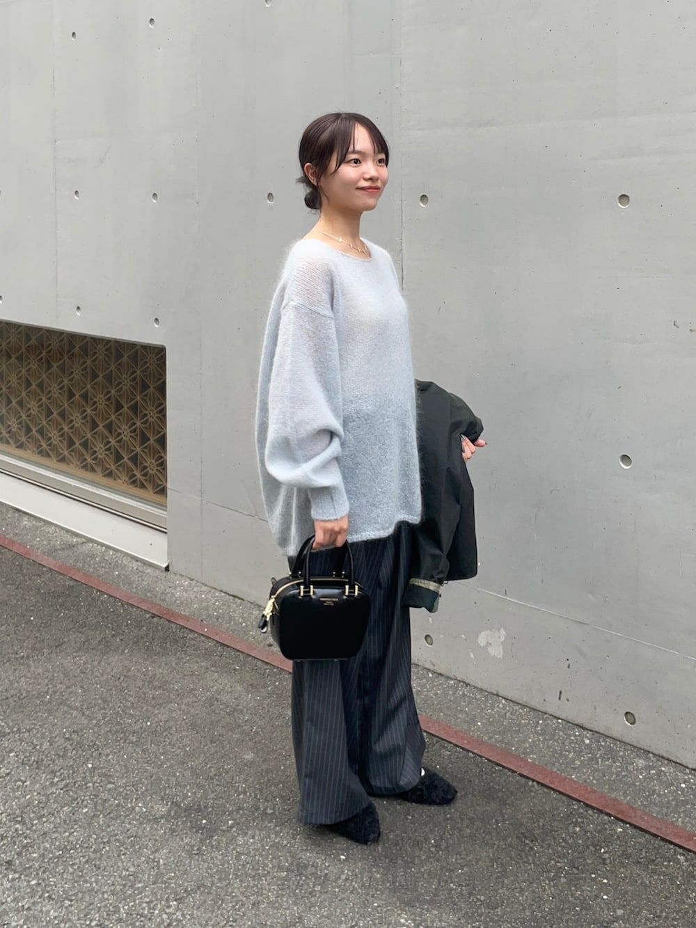 インナーのトップスはヘアリールーズニットで、薄い素材でインナーやカットソーを重ねてきても可愛いく、表面はフワフワとした触り心地です!ゆったり着れる余裕のある身幅が、どの身長の方でも合わせやすいと思います!