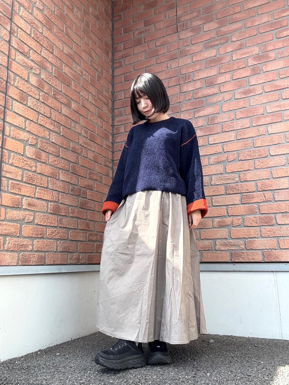 ベージュのタフタスカートとあわせたお気に入りコーデです☺︎