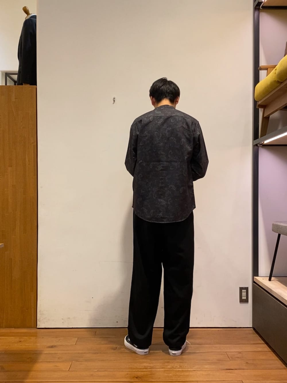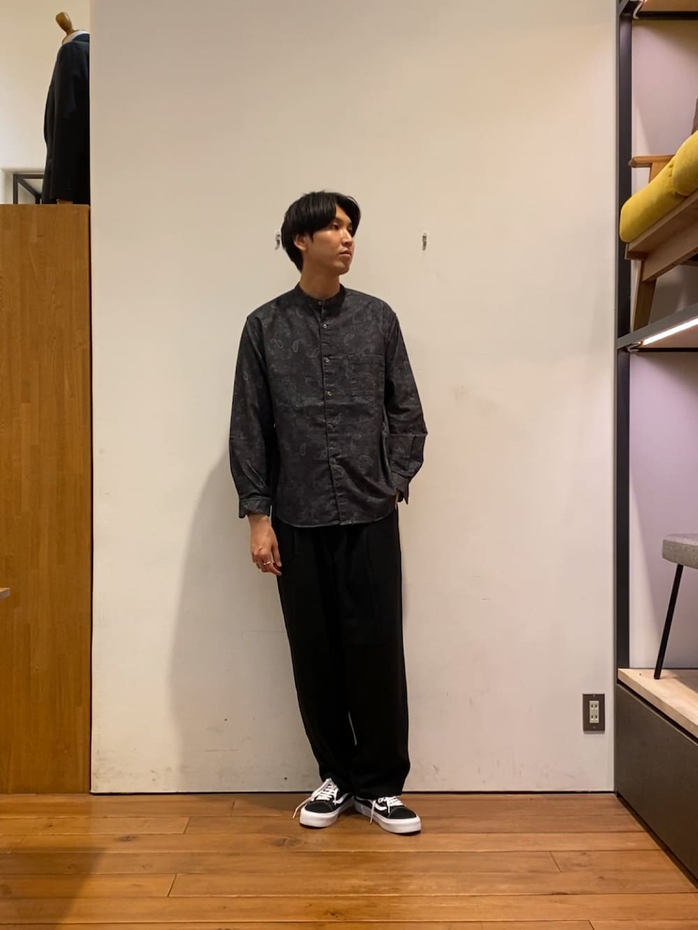 インナーには、ペイズリー柄のバンドカラーシャツを合わせてみました!