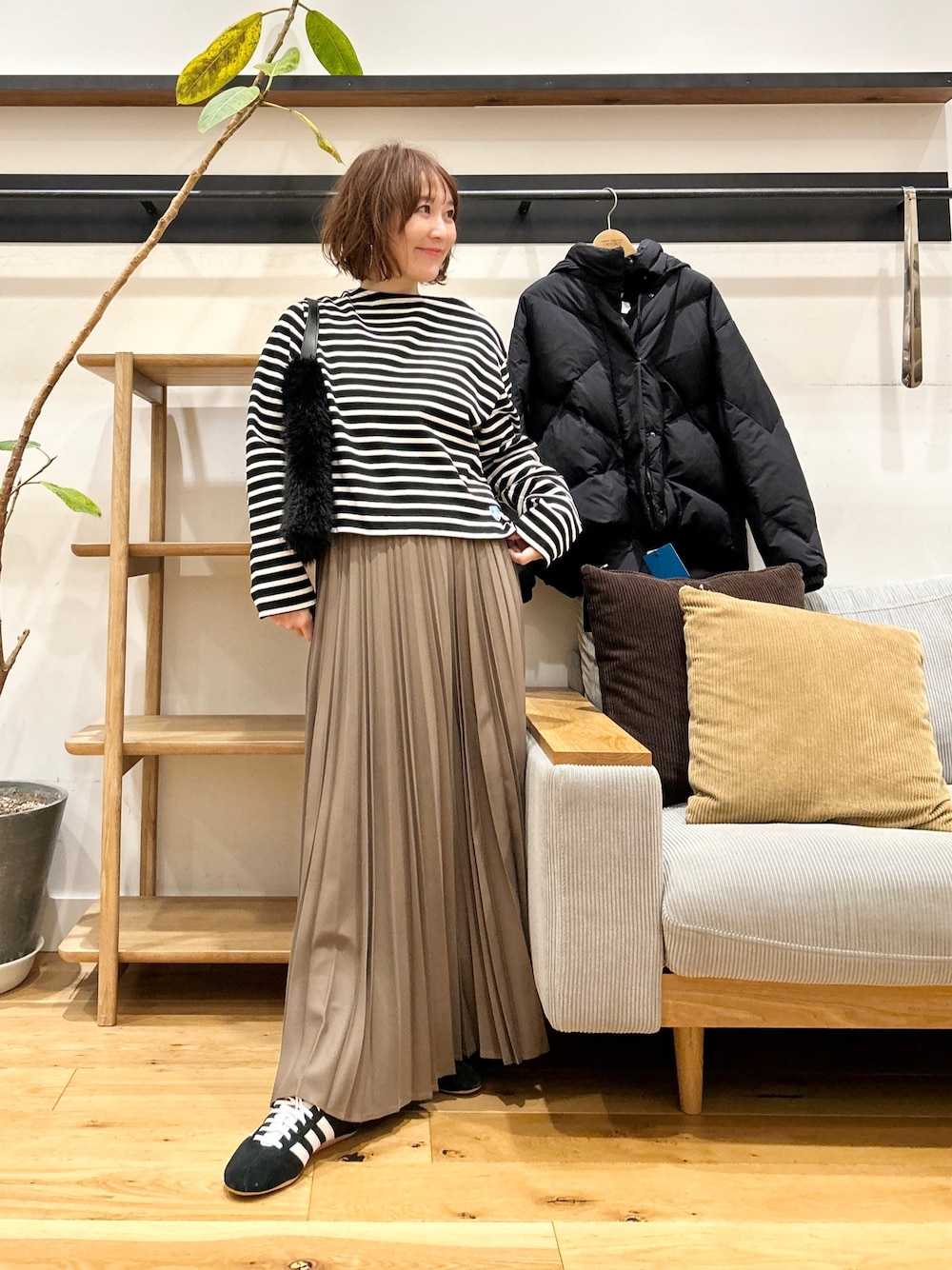 丈が少し短めなので、ワイドパンツやスカートと合わせてもバランスが取りやすく、