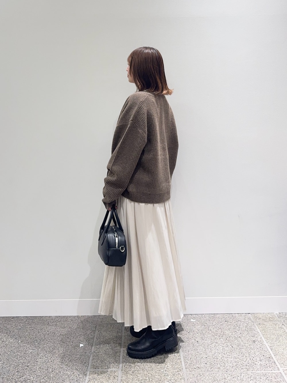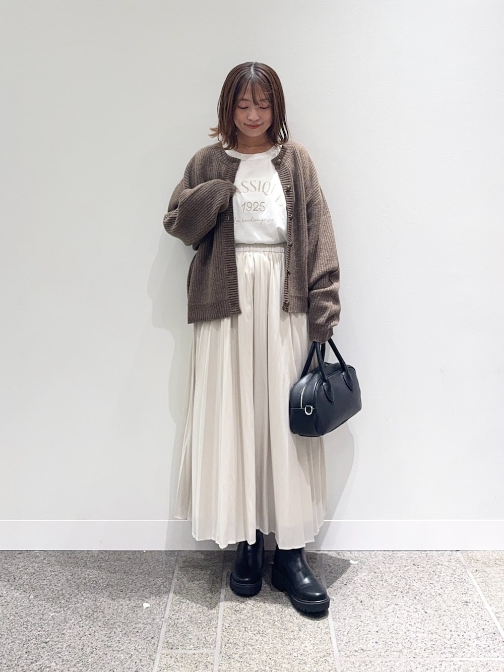 カーディガンは大きめのボタンが可愛く、