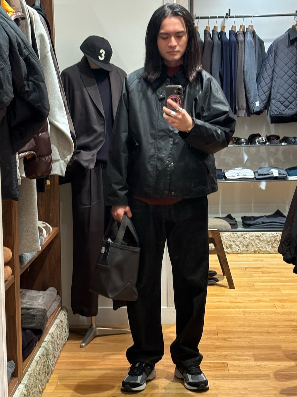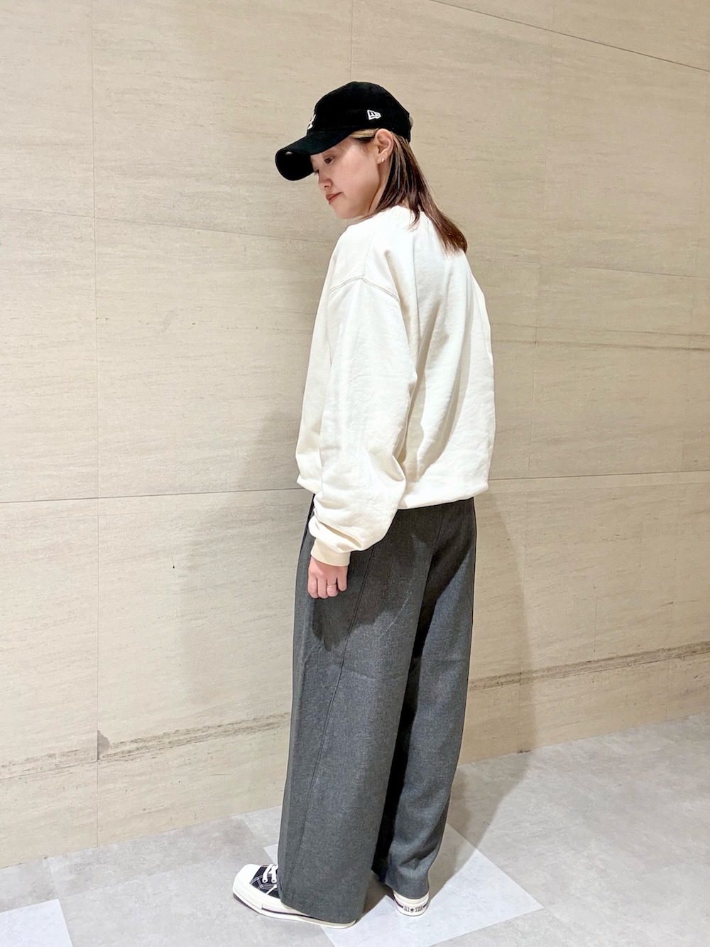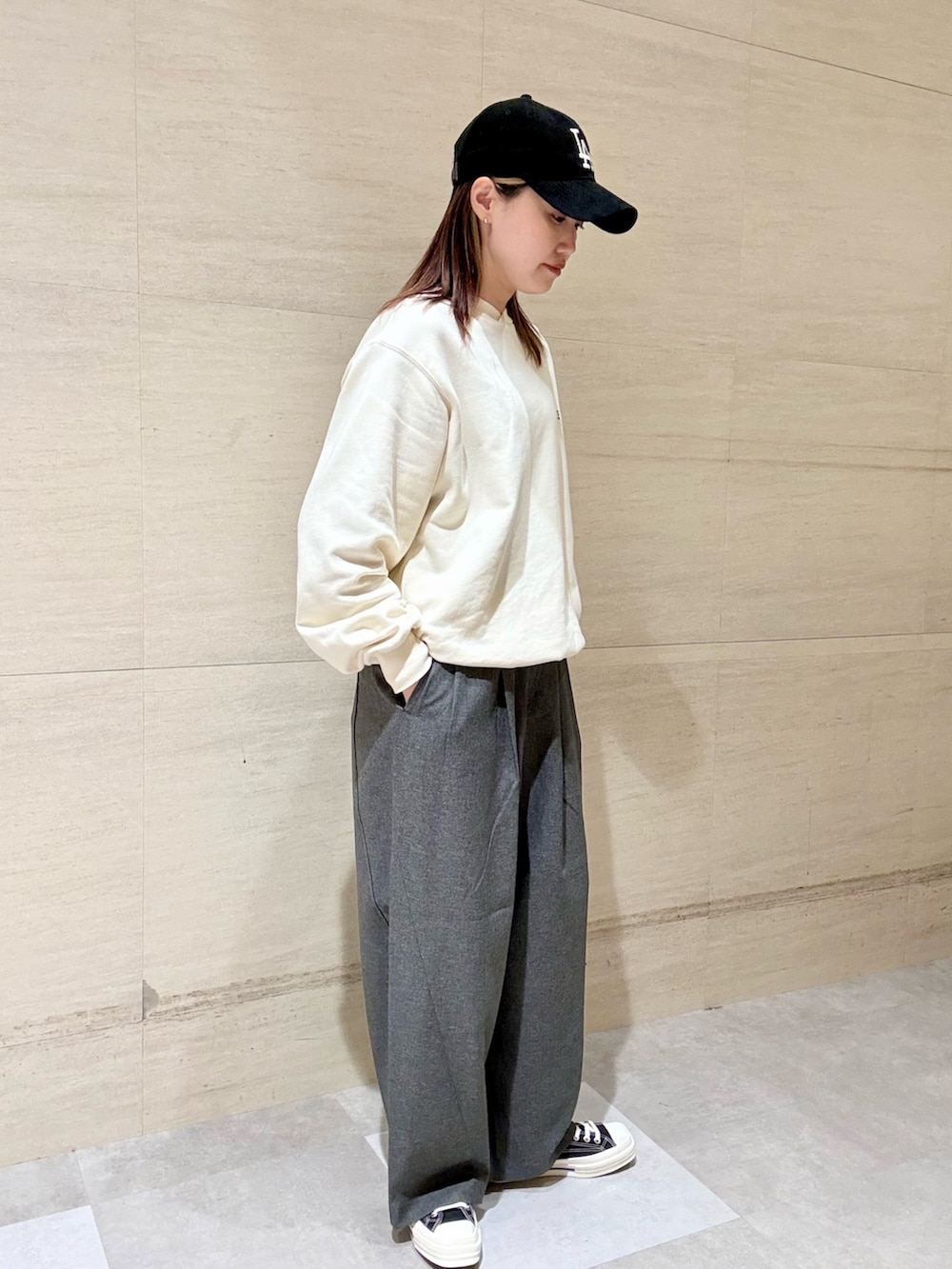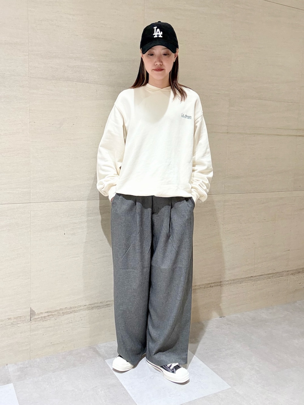 ボトムは裾に溜まる形になっていて、キレイめのコーディネートでも合わせやすいです。