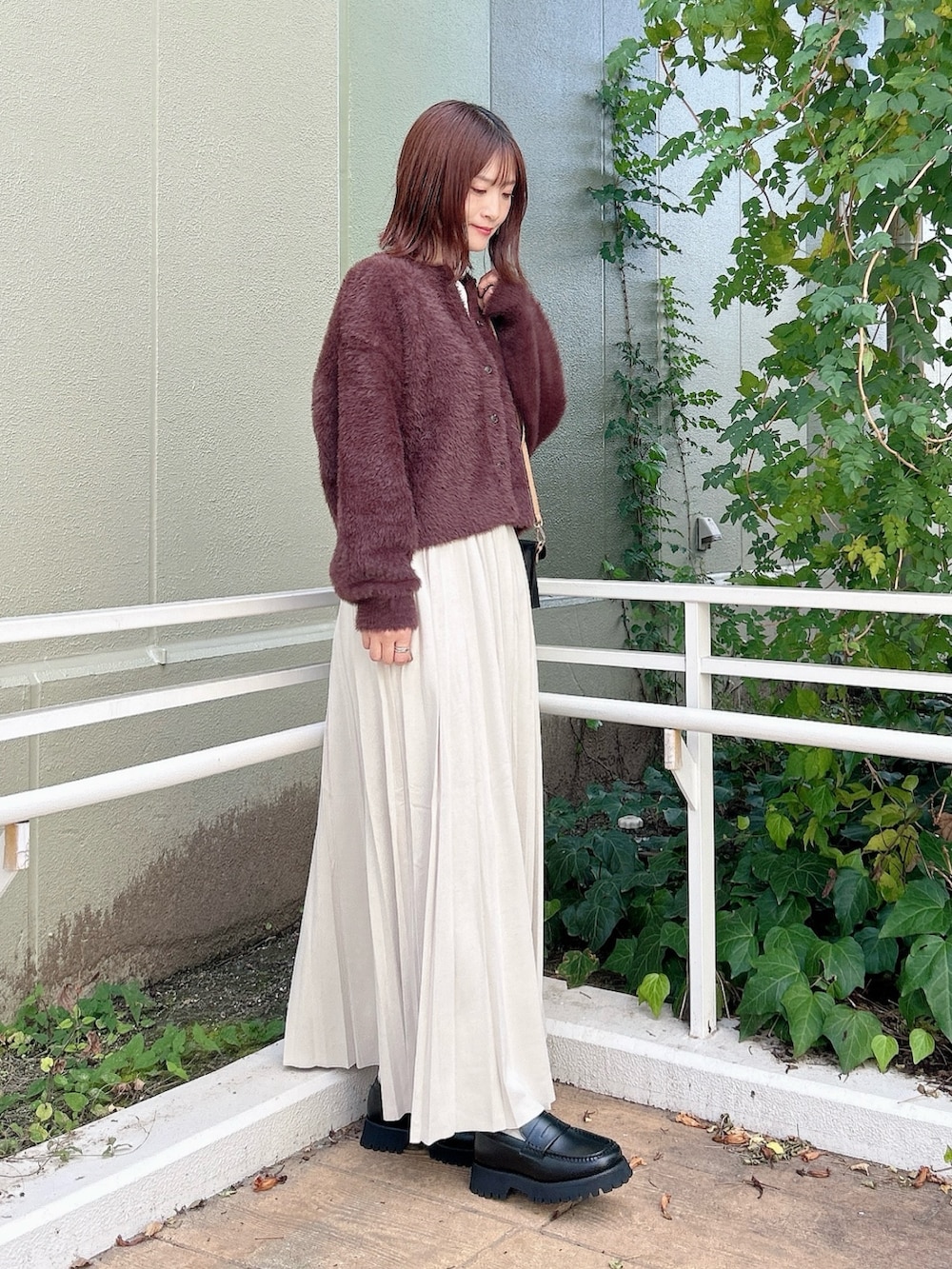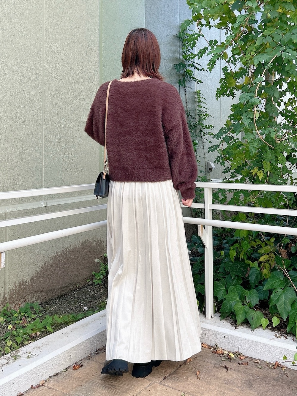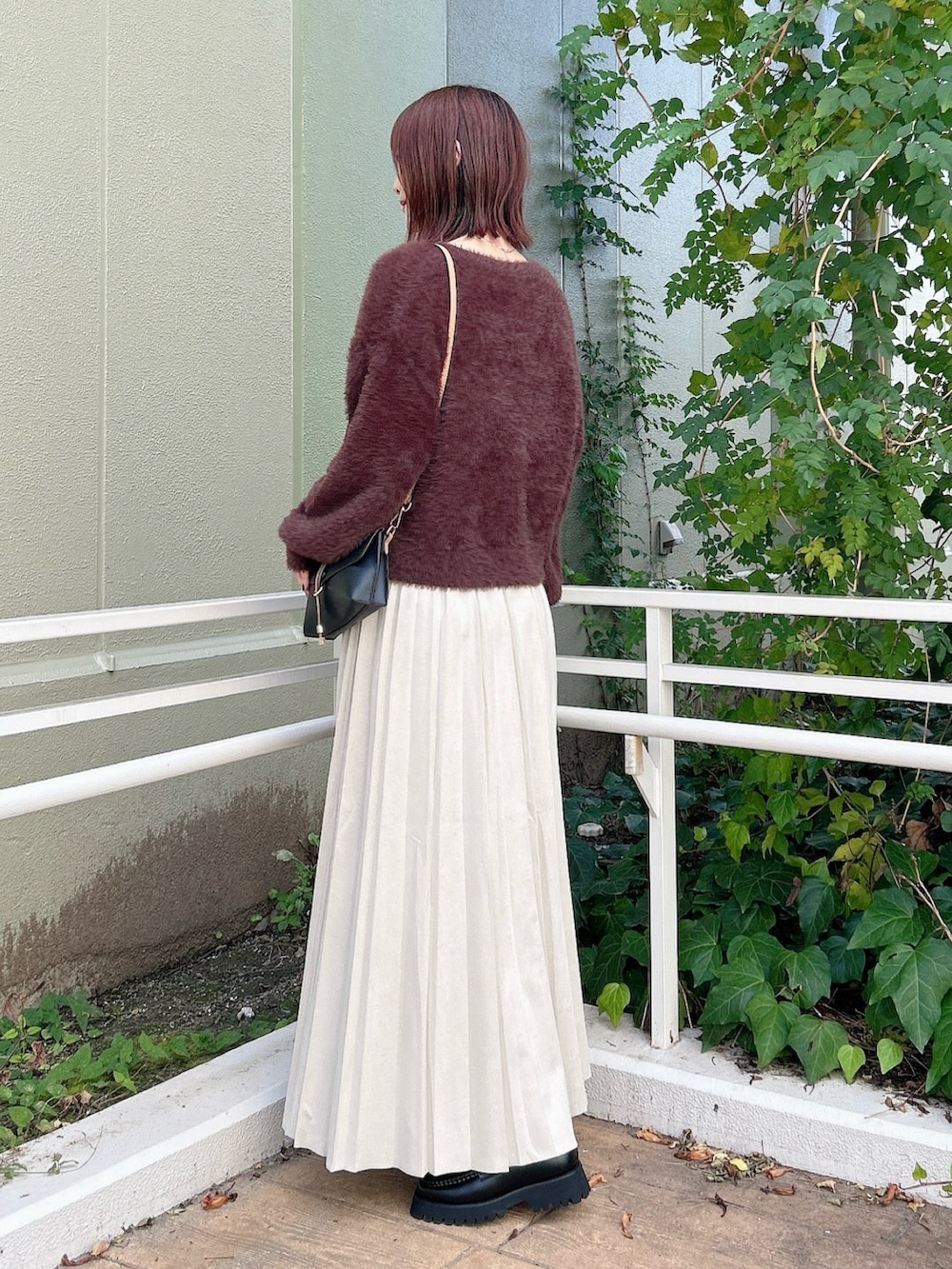 動くたびに揺れるプリーツが上品で、ニットとの相性も抜群です。