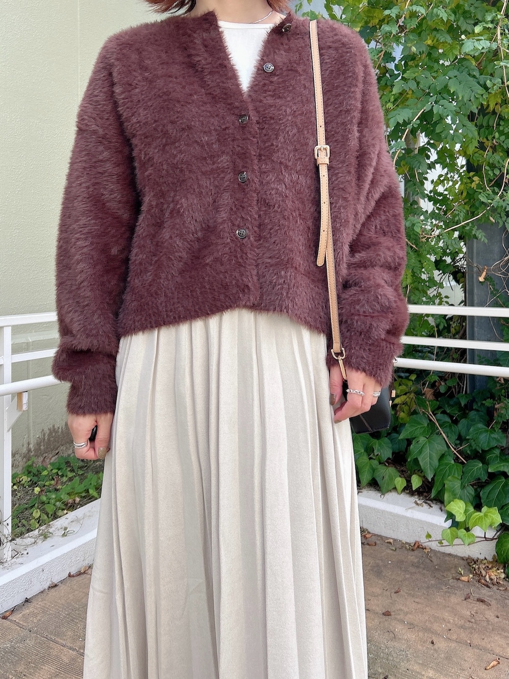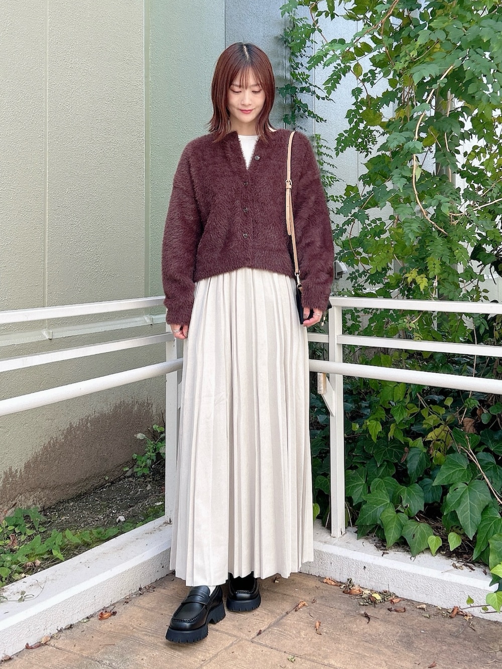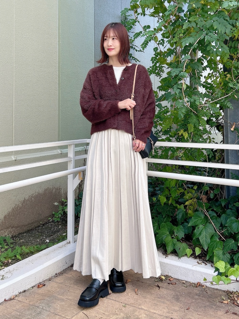 動くたびに揺れるプリーツが上品で、ニットとの相性も抜群です。