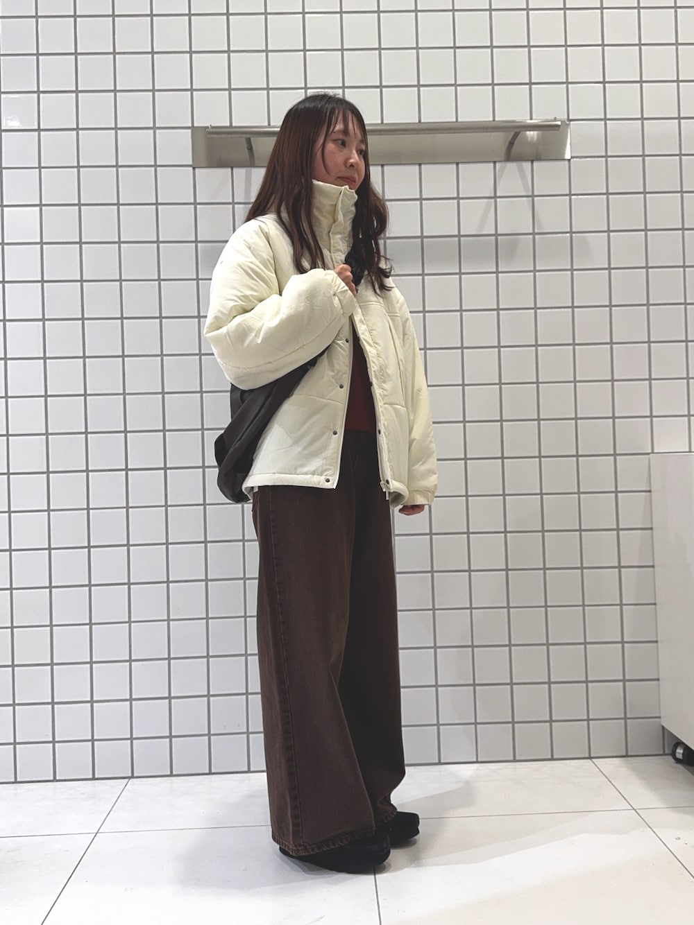 インナーのニットとパンツに白、カーディガンはベージュ系の色にすることで、優しい印象の秋冬コーデにまとめました。足元にレザーを入れることでコーデを引き締めています。