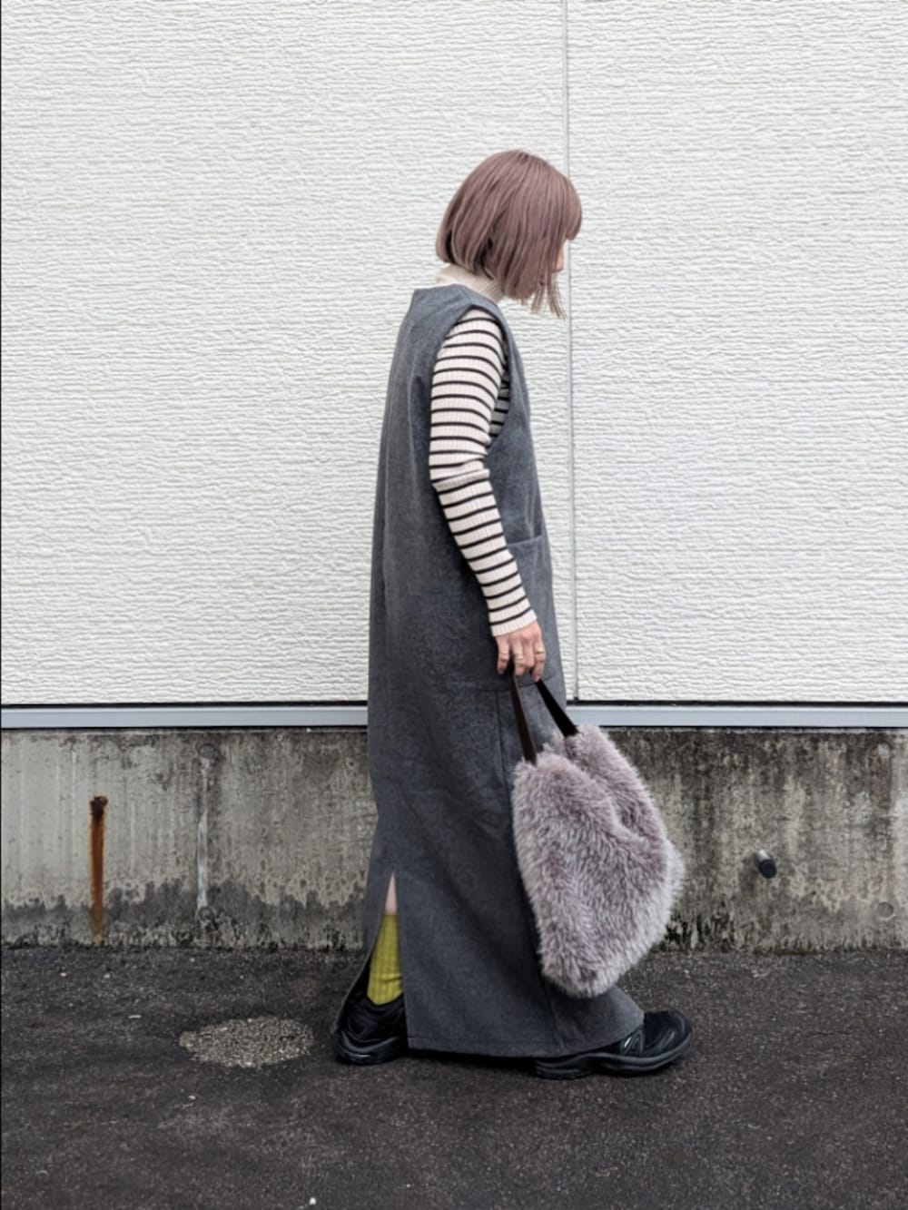 インナーはタイトなハイネックニットを。
