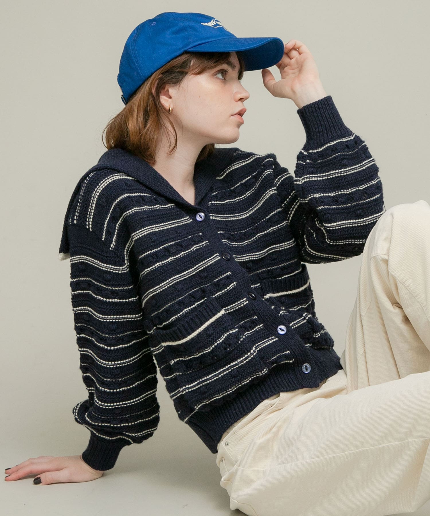 前釦の開閉でプルオーバーとしてもカーディガンとしての着用も可能で、着こなしの幅が広がります。