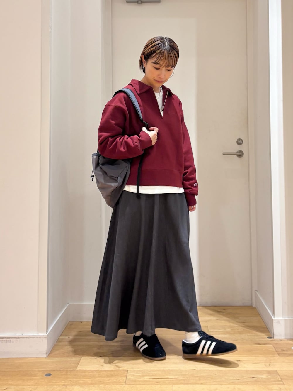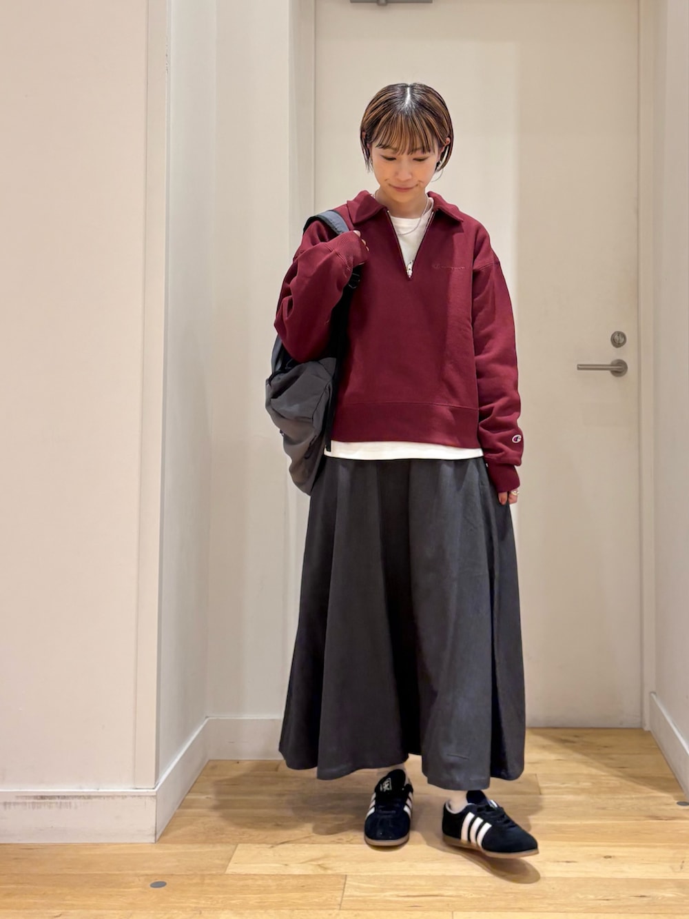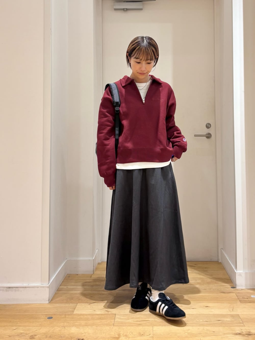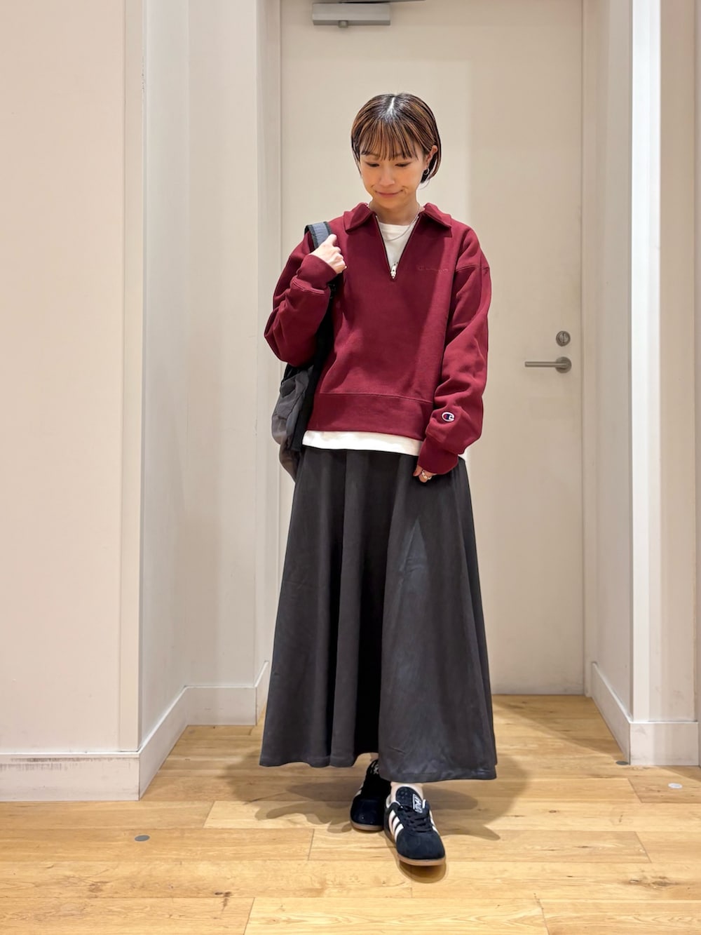 メンズライクになりがちなアイテムなので、今回はスカートと合わせて女性らしさもプラスしてみました◎