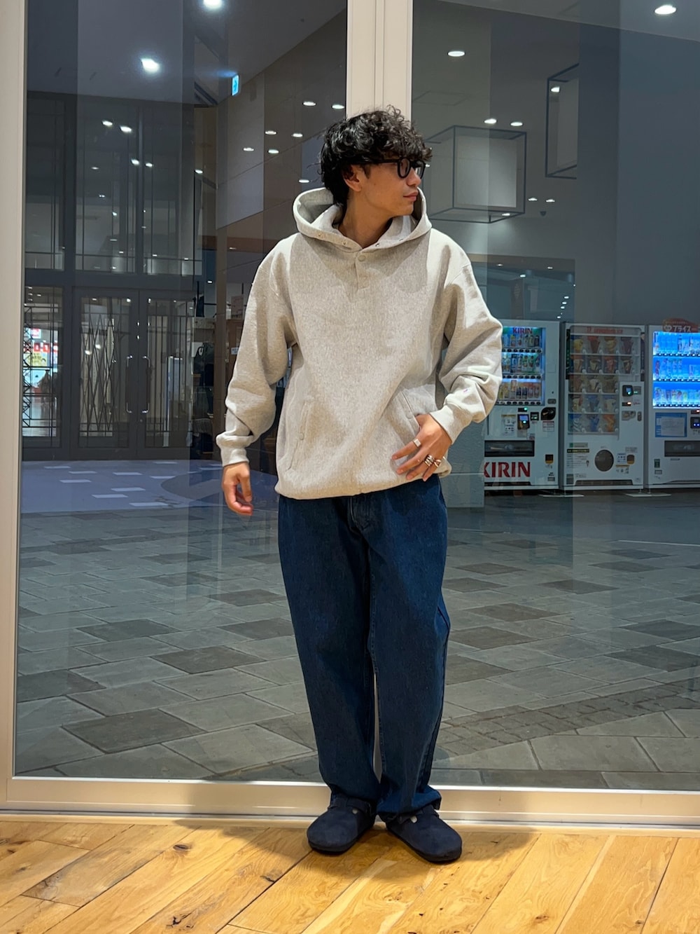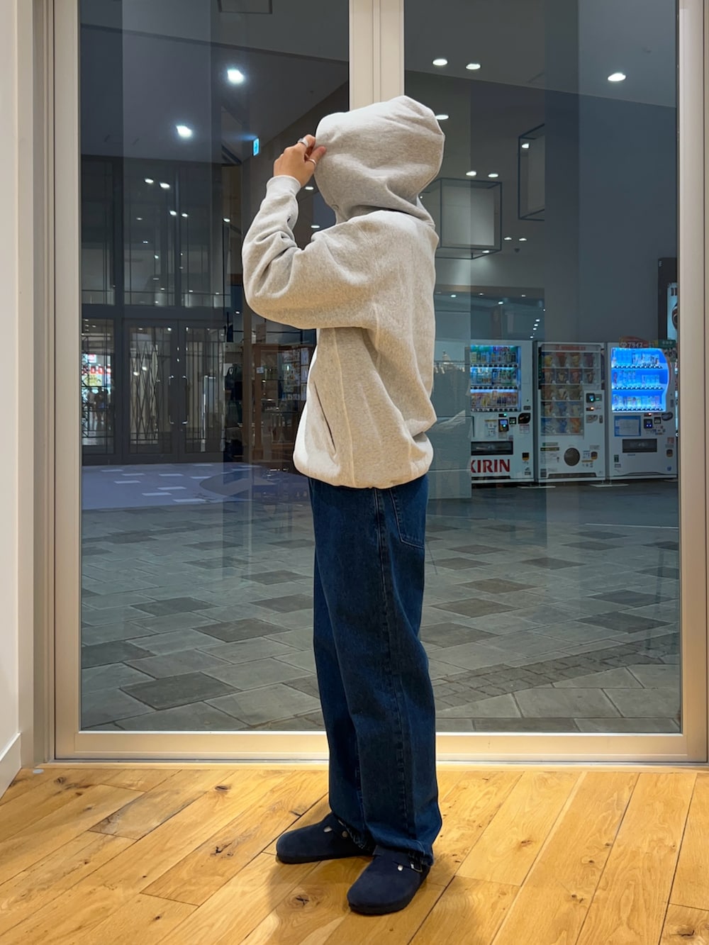 Champion別注のフーディーは首元にスナップボタンがあり気が利いてる作りに!
