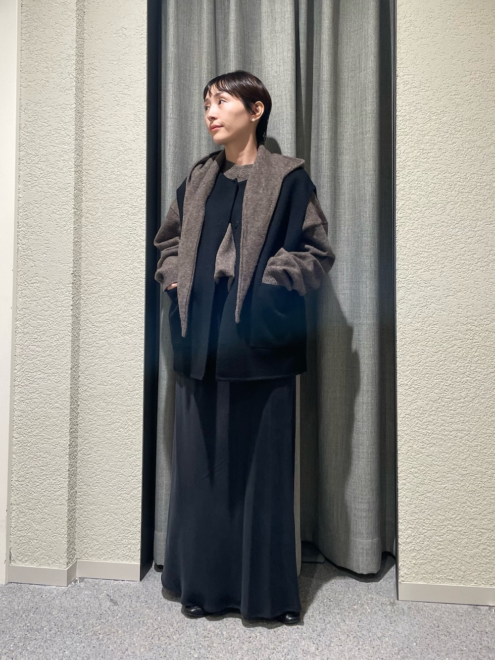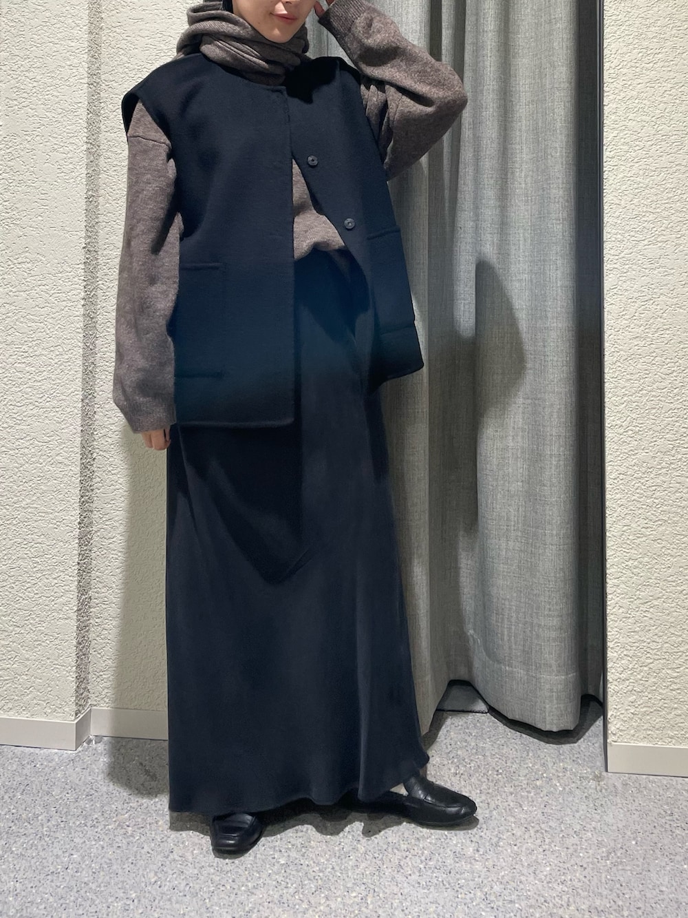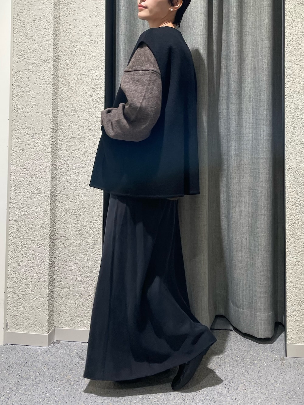柔らかい生地なのでオーバーサイズのコートのインナーにもして頂けるデザインです。