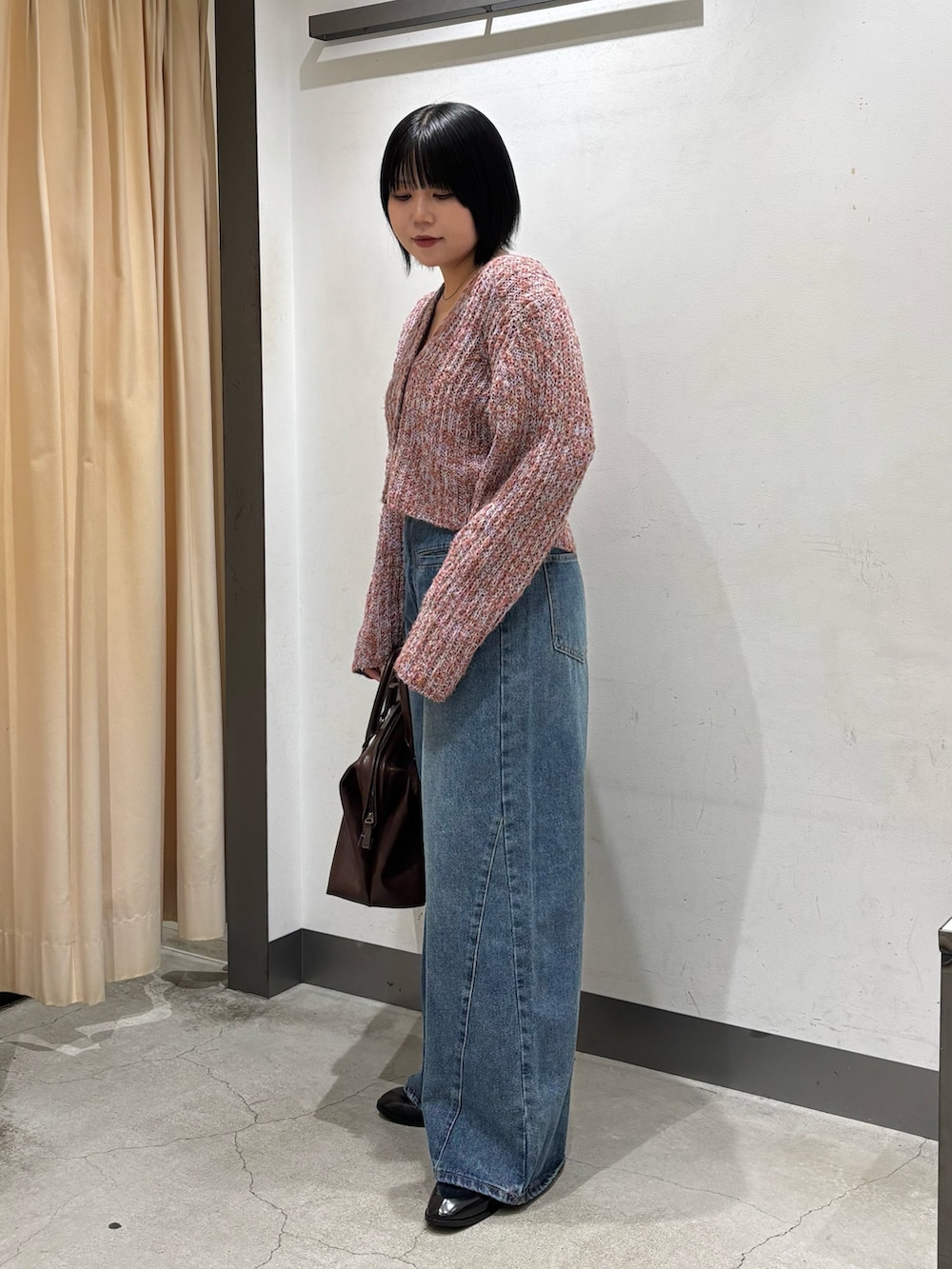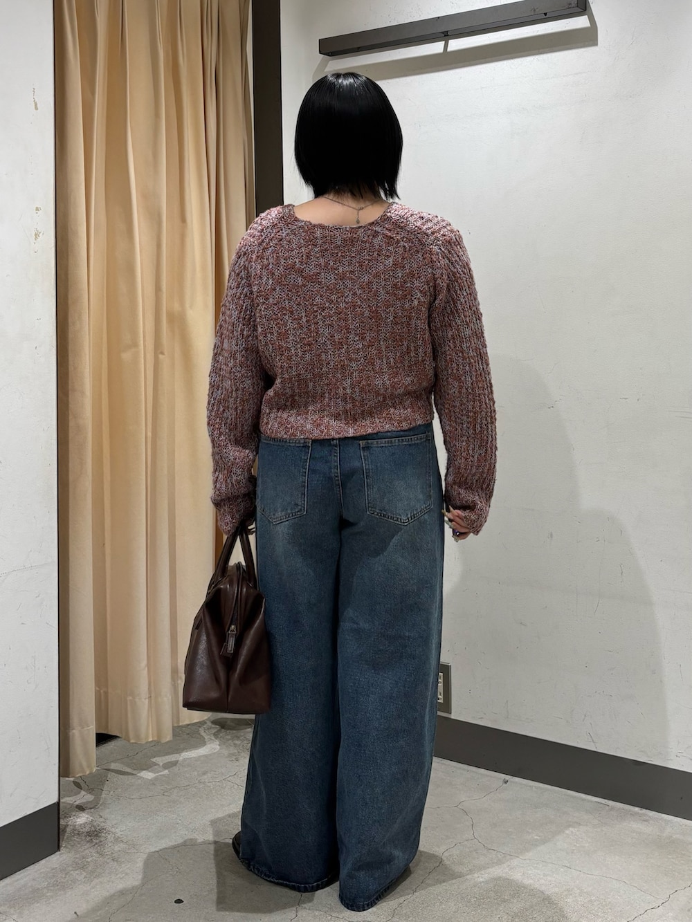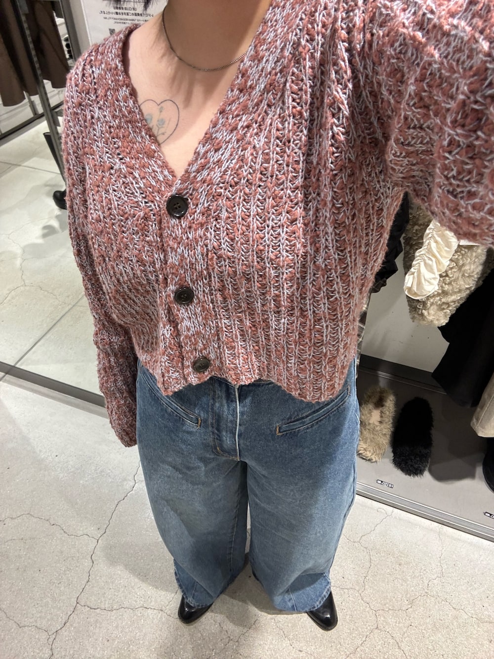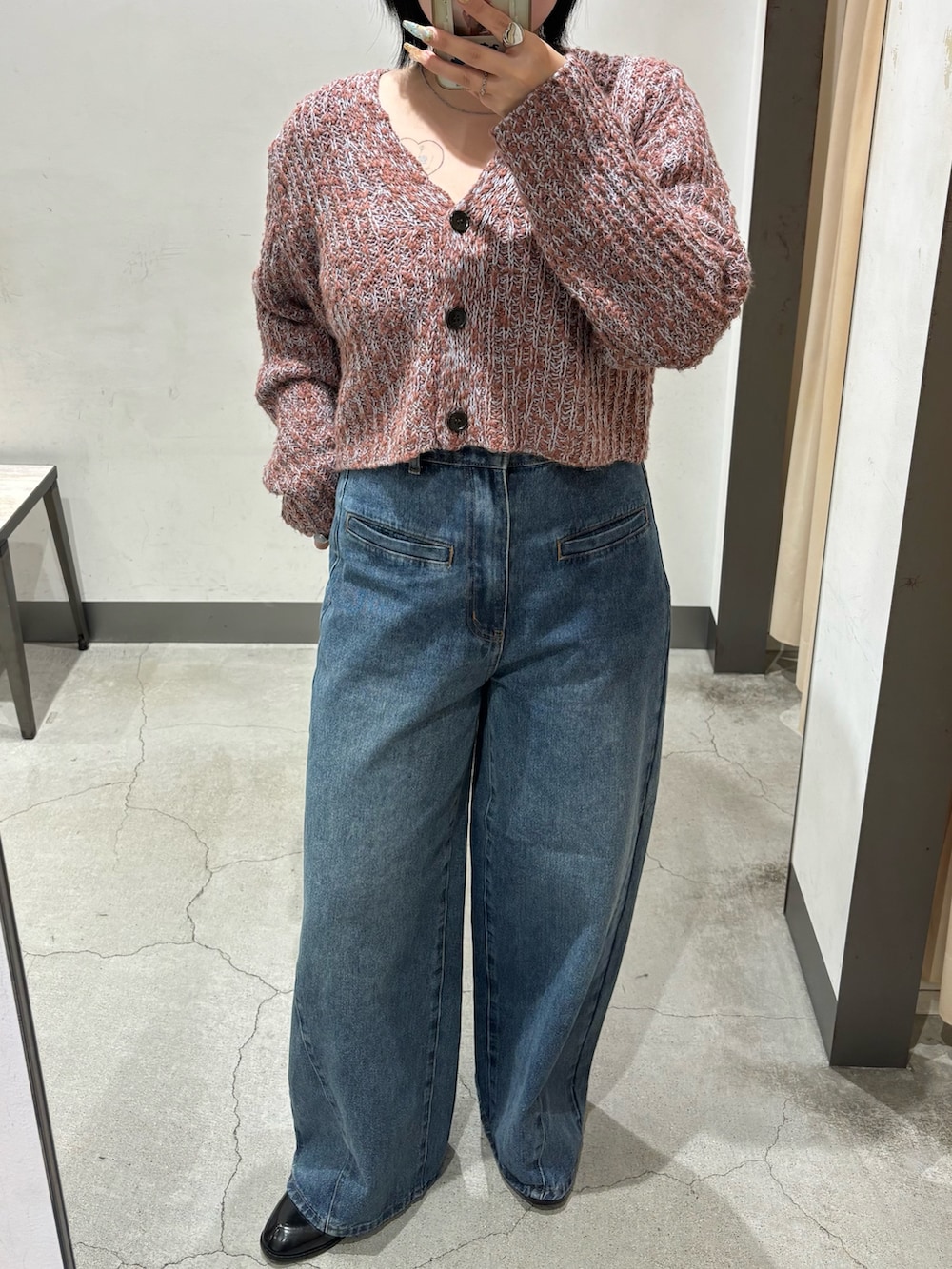 着てみた感じ、ニットの生地自体そこまで分厚いといったこともなく、広めに開いた首元のVネックがスッキリ見えも👌🏻ショート丈で上重心に見えやすいのでワイドなシルエットのボトムや厚底野ブーツなど下に目線を持ってくるアイテムと合わせると前身のバランスが取れるので、骨格ストレートさんは参考にしてみてください₍ᐢ ɞ̴̶̷.̮ɞ̴̶̷ ᐢ₎