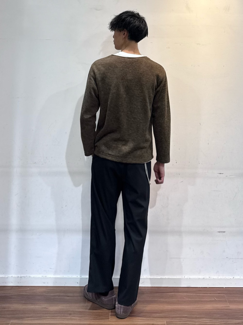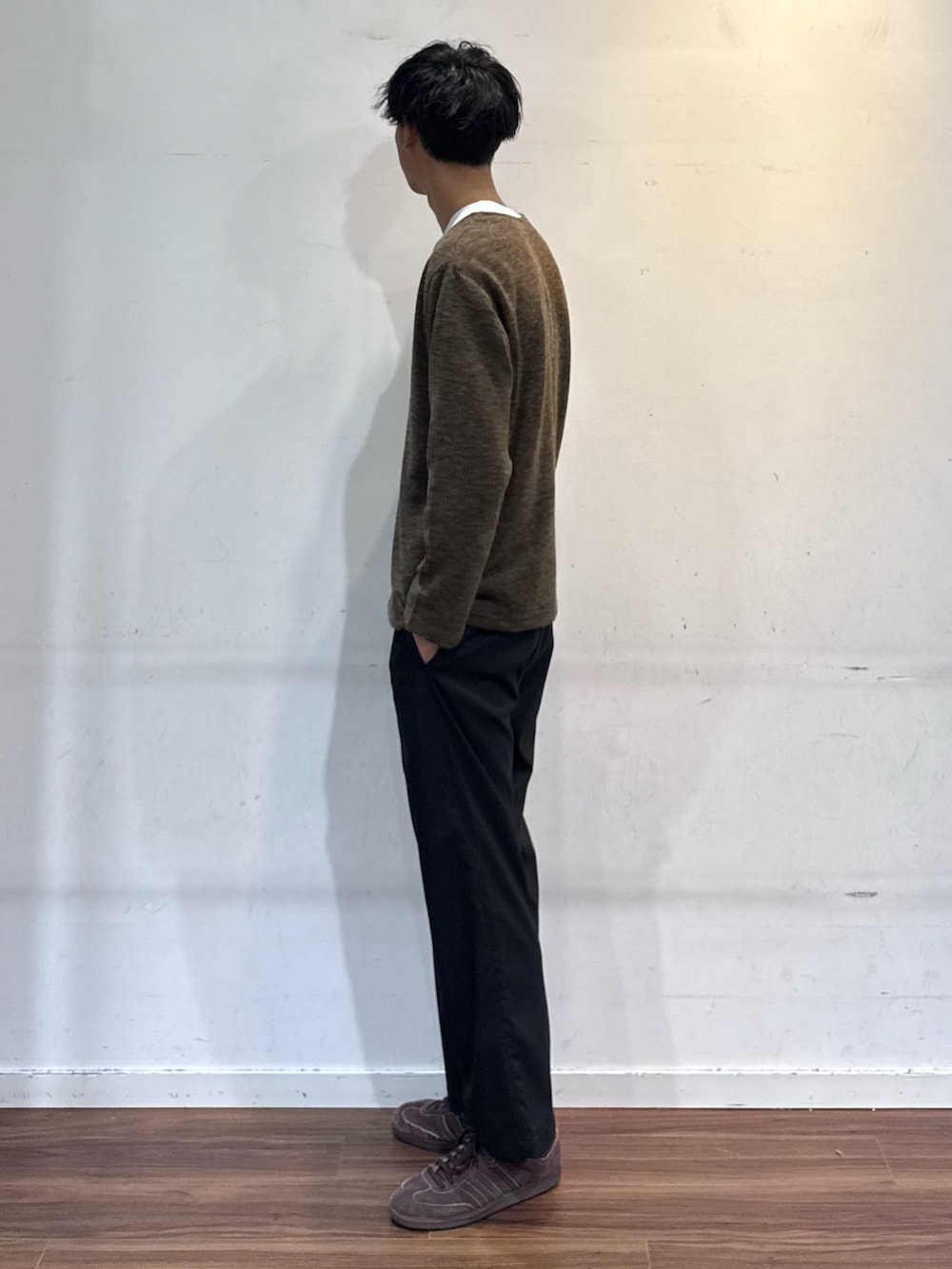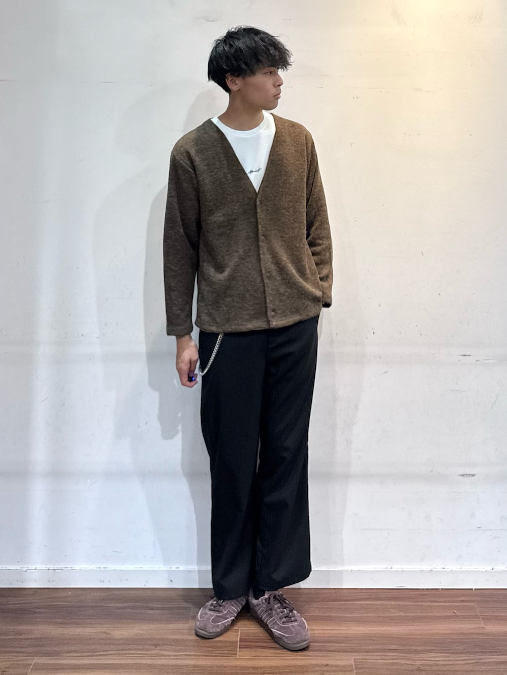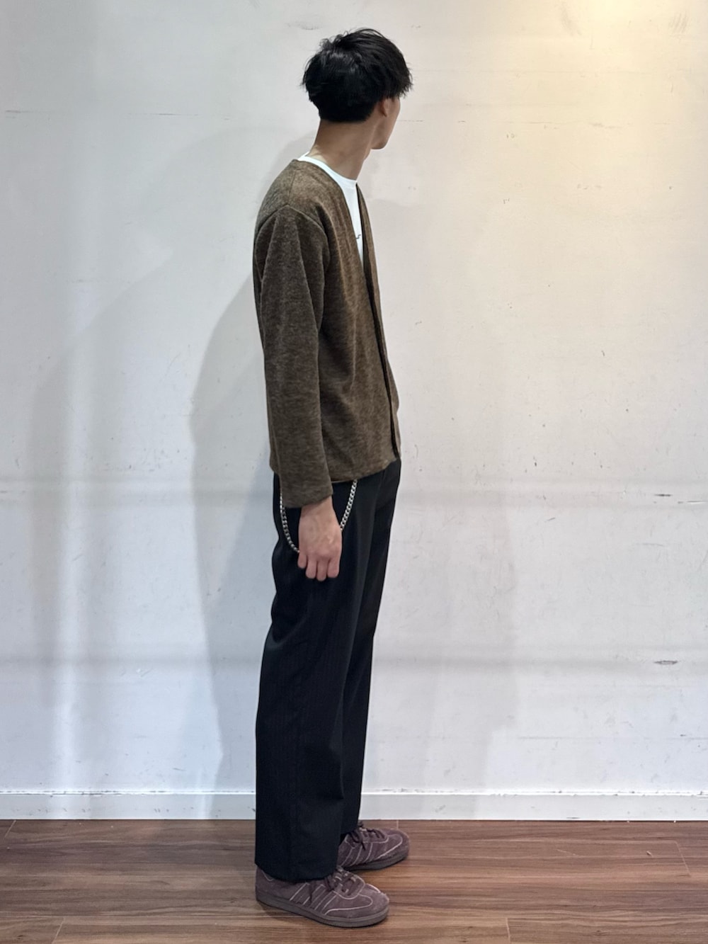 ついこの前まで暑かったのに、もう冬らしい気温感に。メランジカーディガンで季節感を。