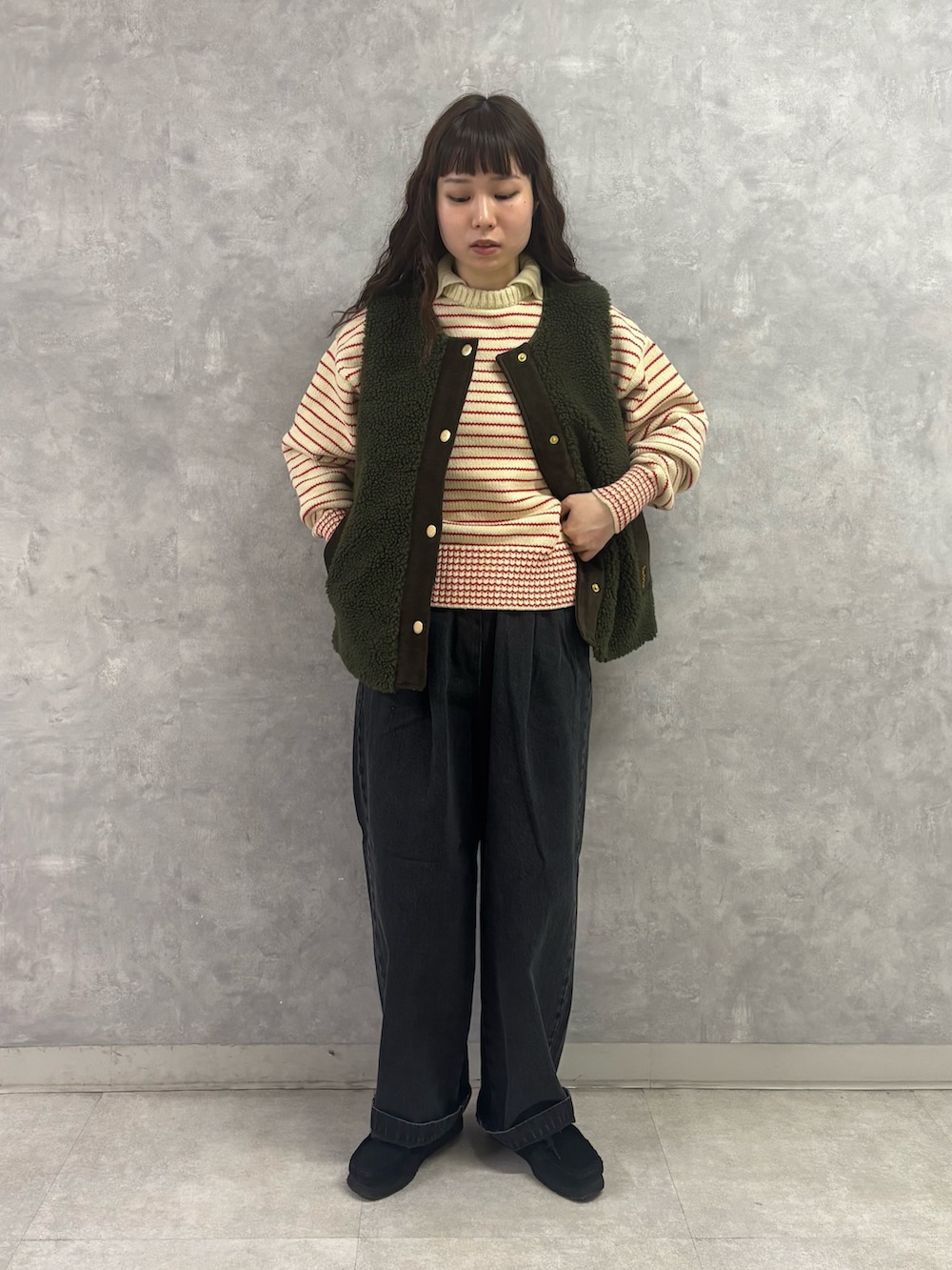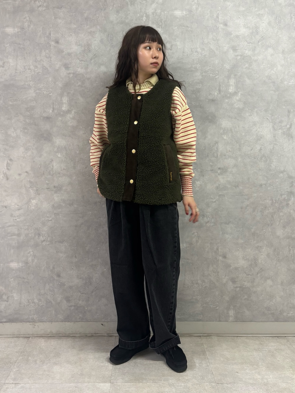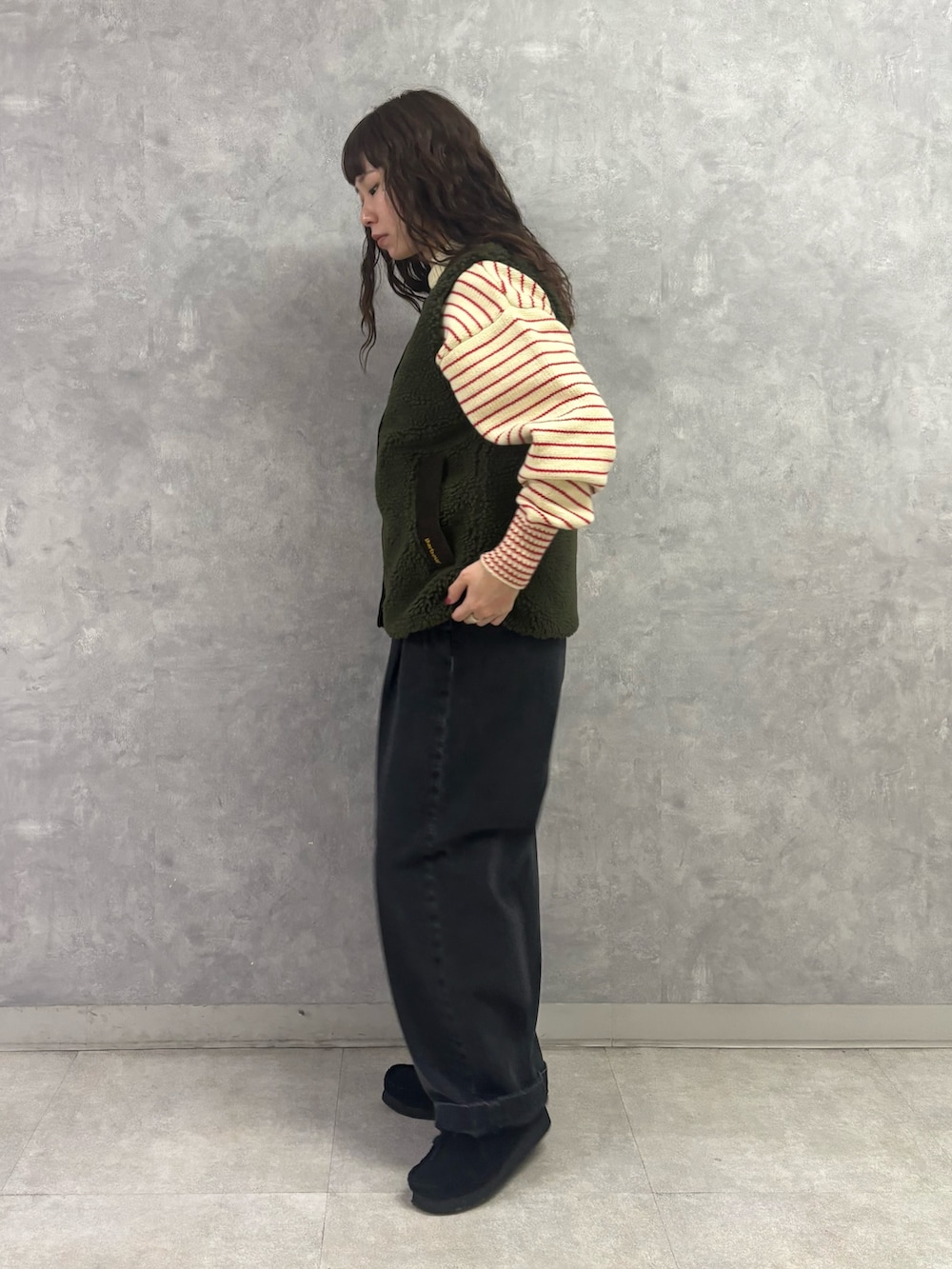 深みのあるグリーンのボアベストが季節感を引き立たせてくれ、より旬な装いにしてくれます!