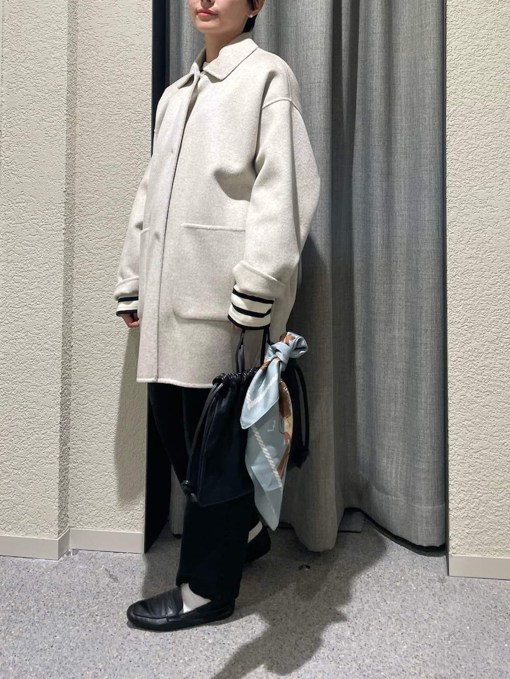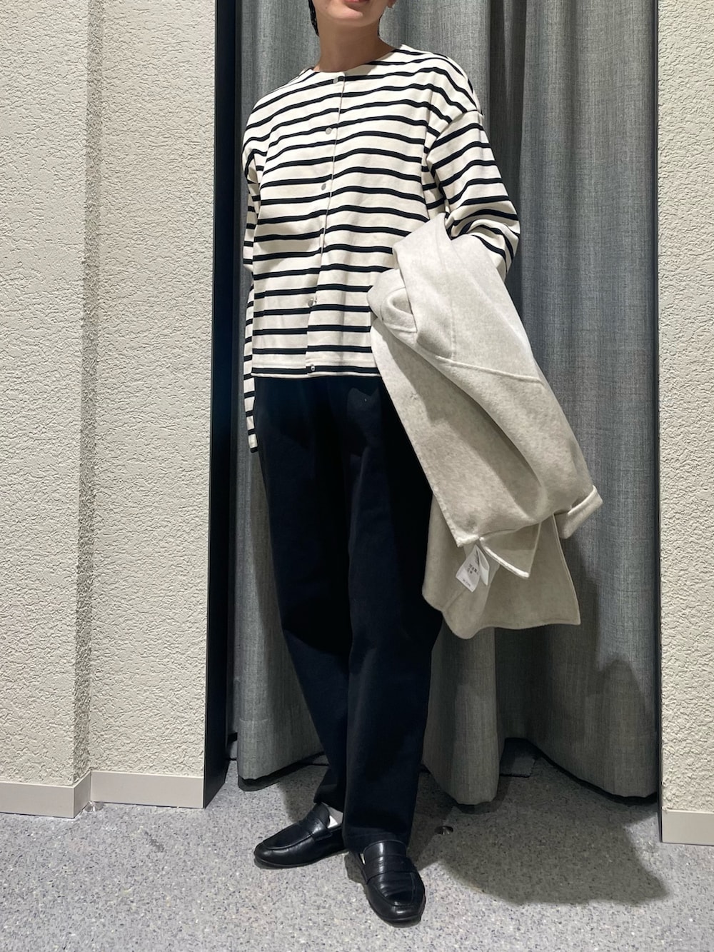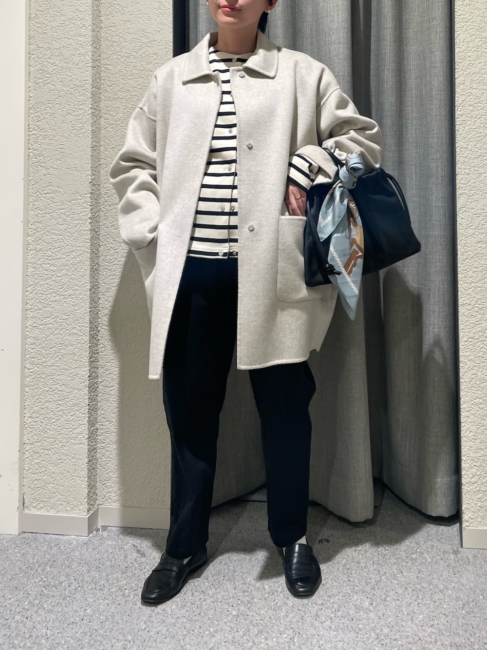 毎年人気のウールステンカラーショートコートの新色OATMEALにボーダーを合わせた秋冬だけど爽やかさのあるdailyスタイルに🛳️