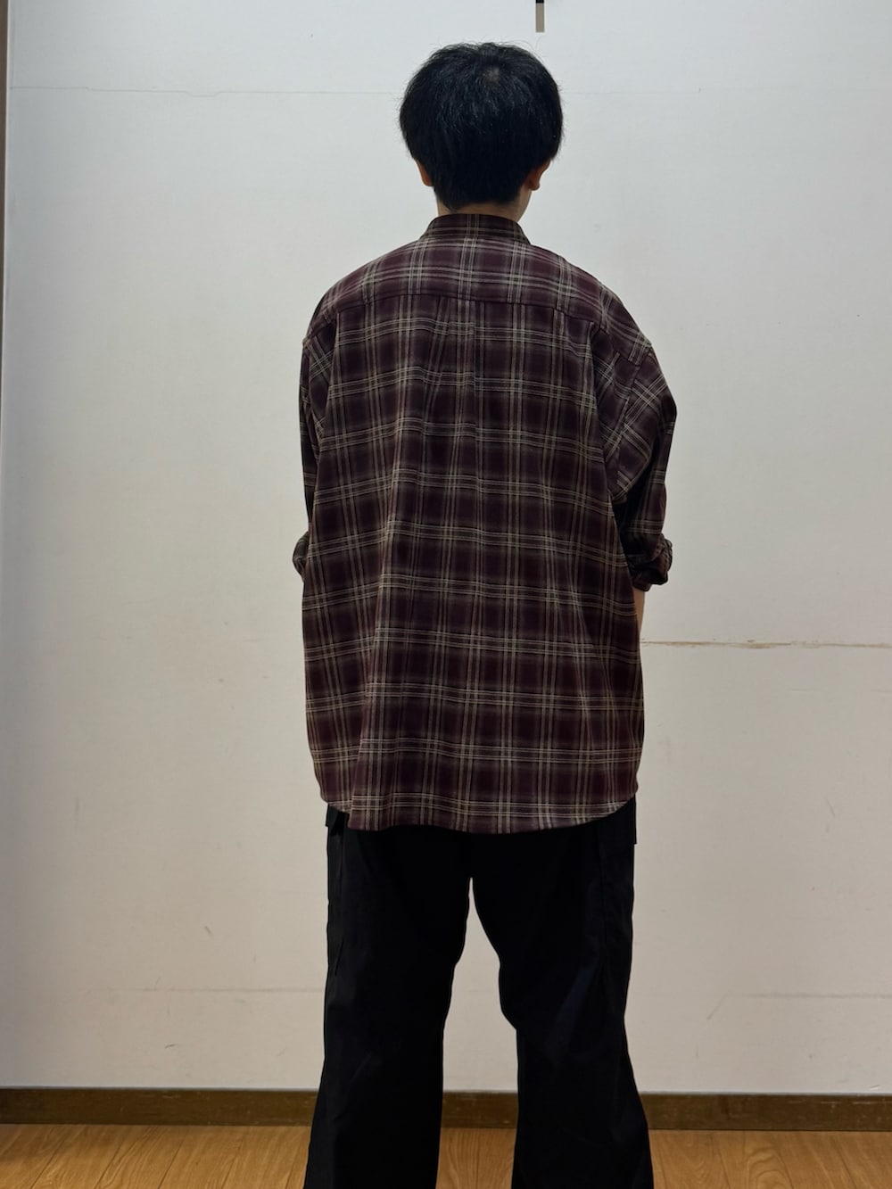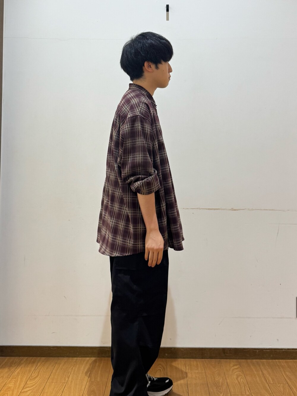 チェックのルーズシャツに黒のカーゴパンツを合わせました