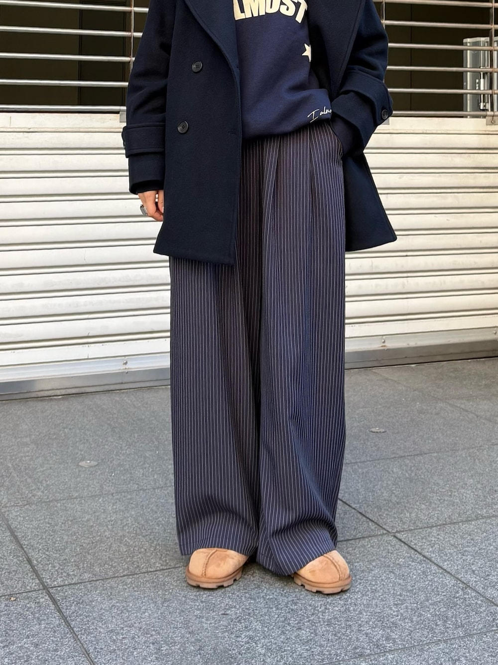 暖かさと美しいシルエットを両立した、人気のタックギャザーストレートパンツ。