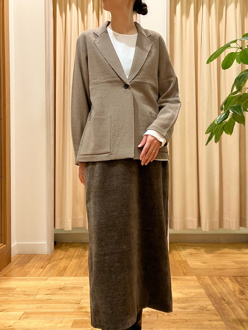ウール100%ですがガーゼ素材の薄手ジャケット。すっきりと着れる程よくフィット感のあるサイズです。上からアウターも着ることができるので、きっちりしたカーディガンのような立ち位置で、新鮮です◎