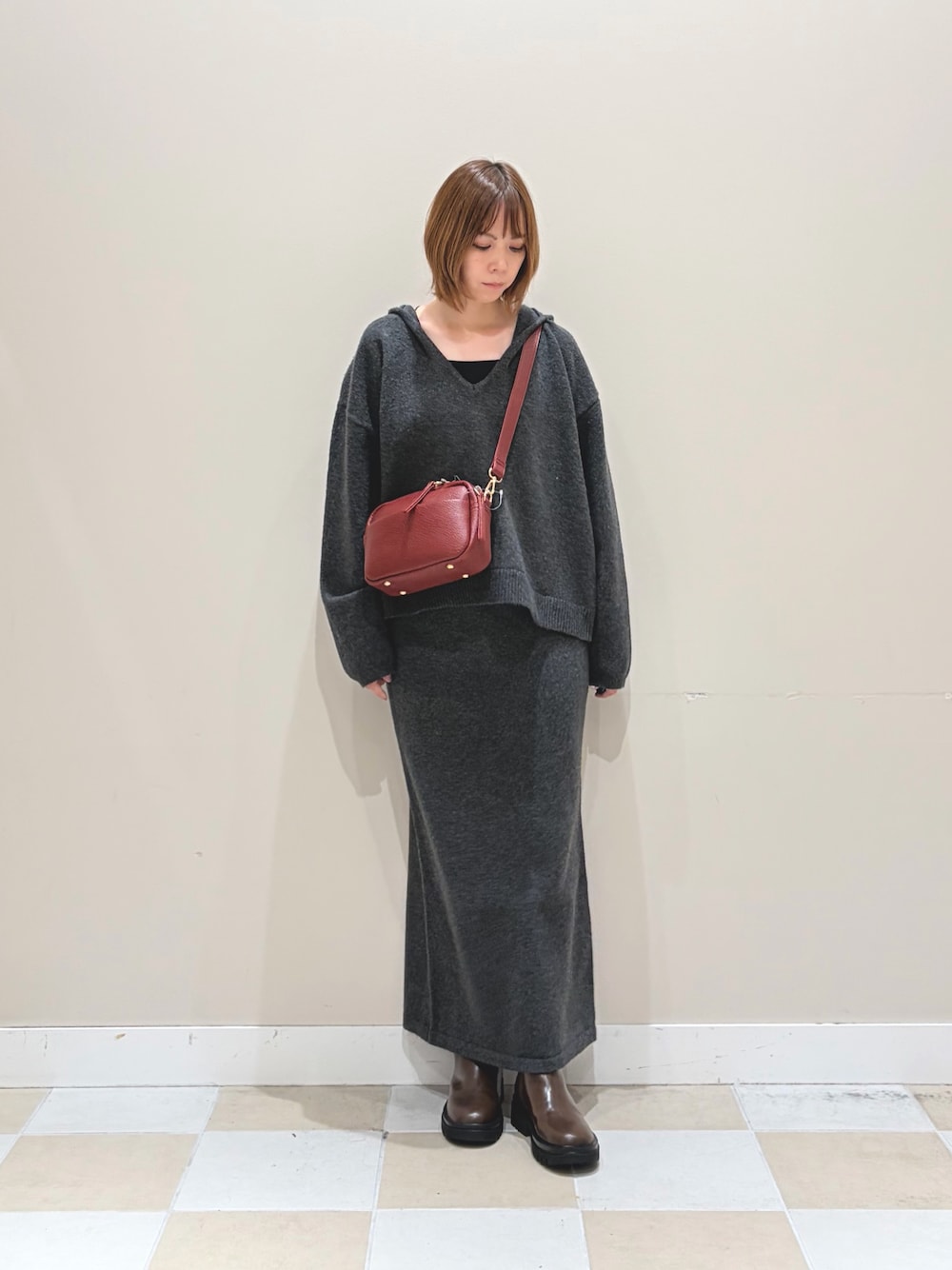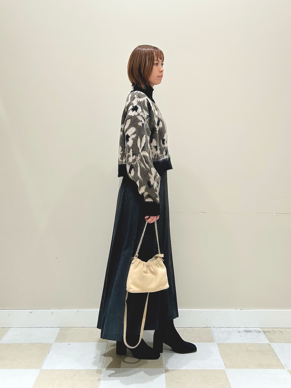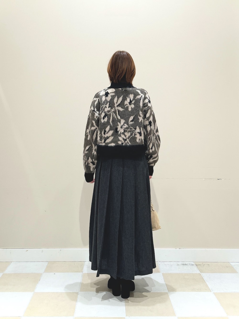 目を引くジャガードニュアンスのショート丈ハイネックニットを主役に、ベルト付きプリーツスカートで少しシックなスタイルにしました!