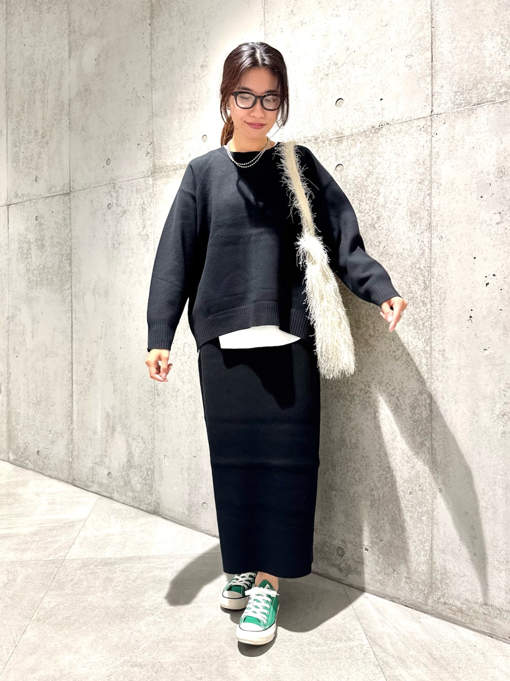 スカートは、脚長効果抜群のIラインシルエットがポイントです。