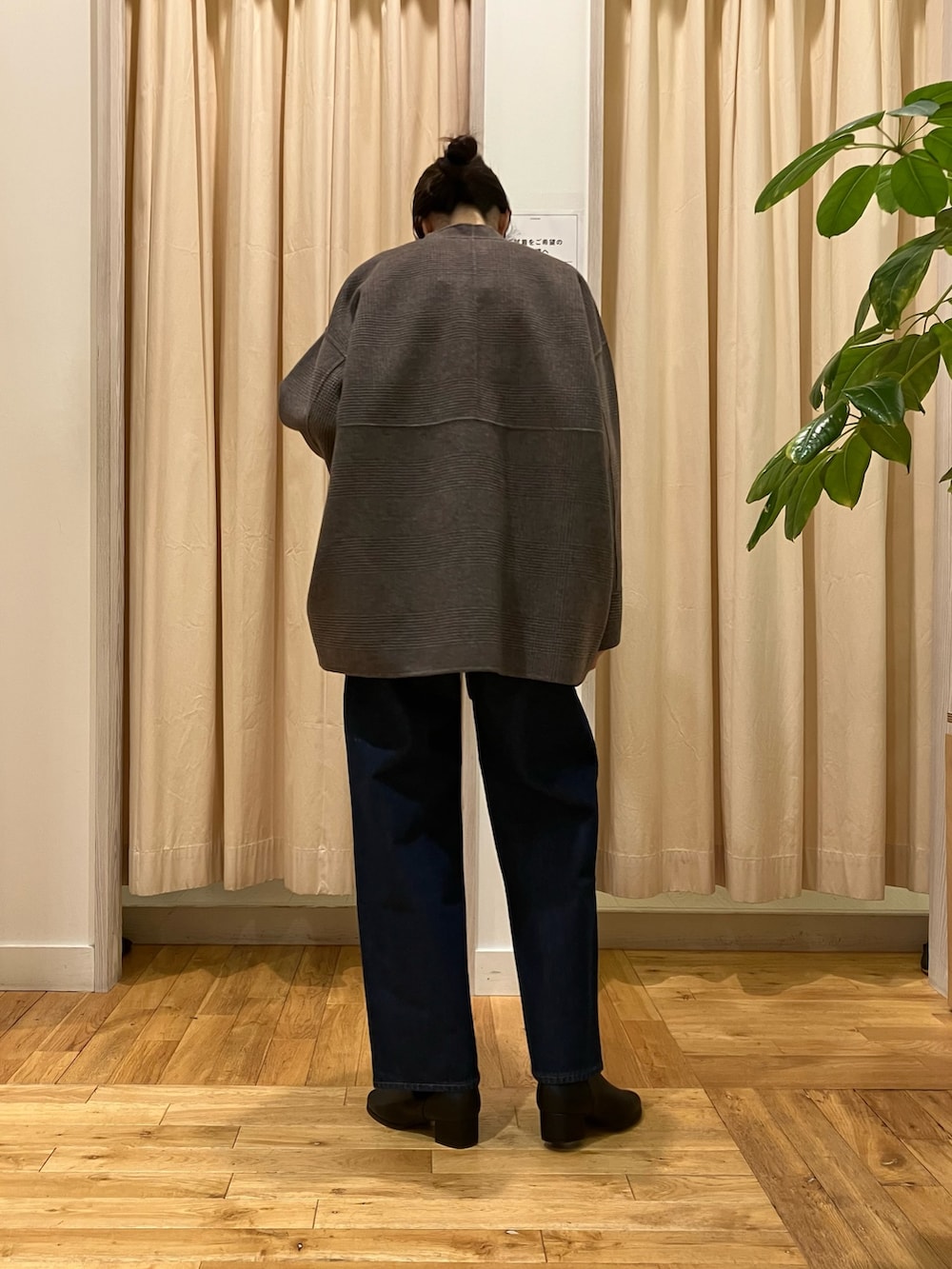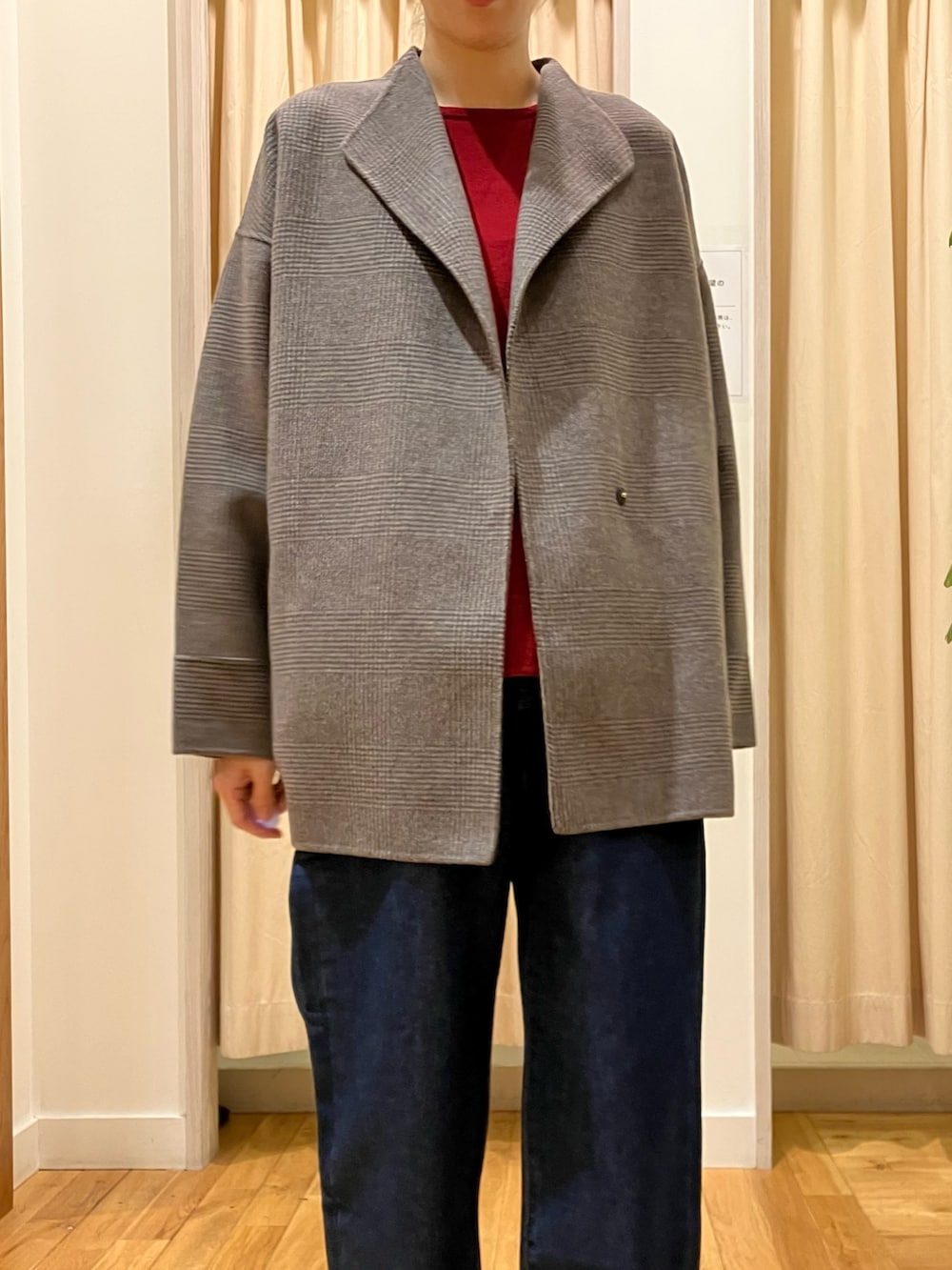 裏地がないので軽く羽織りやすいガウンコートは、ゆったりコクーンシルエットなので、厚手のニットやインナーダウンを中に着ると真冬まで使っていただけます。