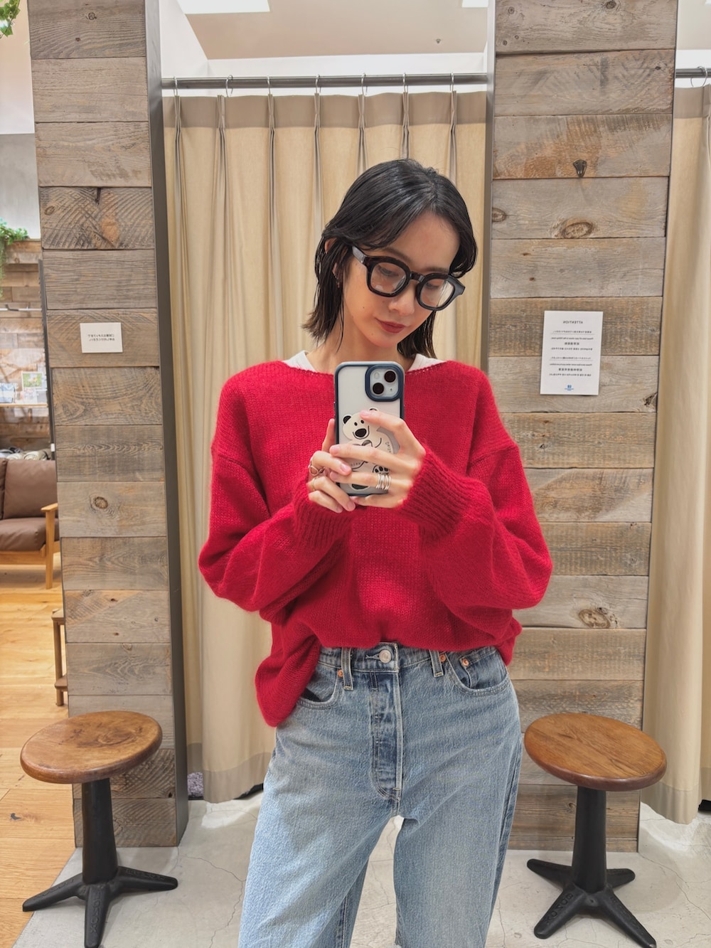 こなれ感の出る柔らかい素材のヘアリーニット。首元が程よい広さでカラーニットでも大人っぽく着こなせます。