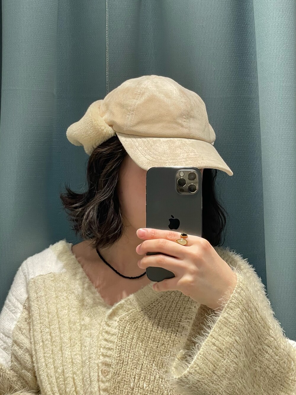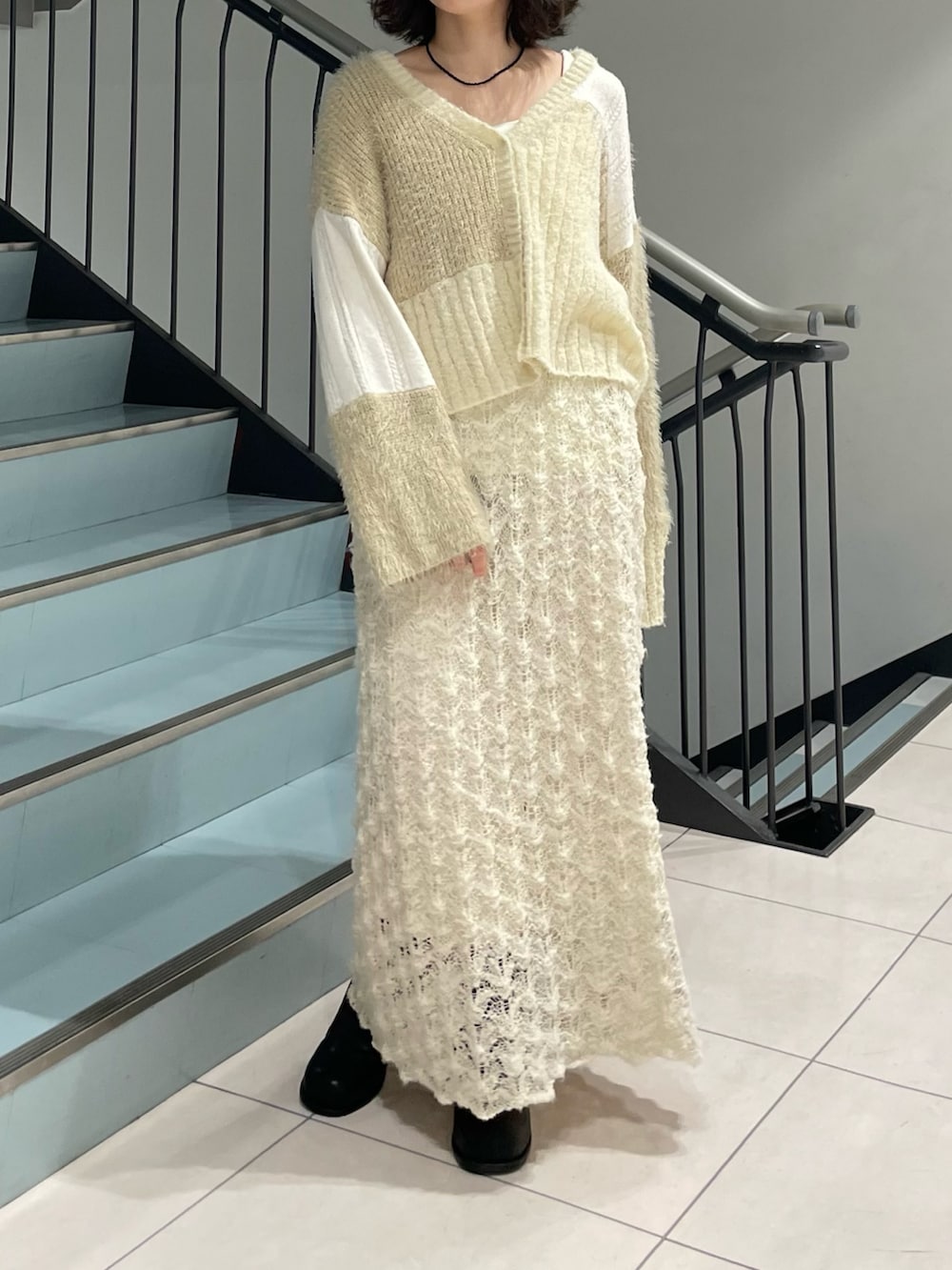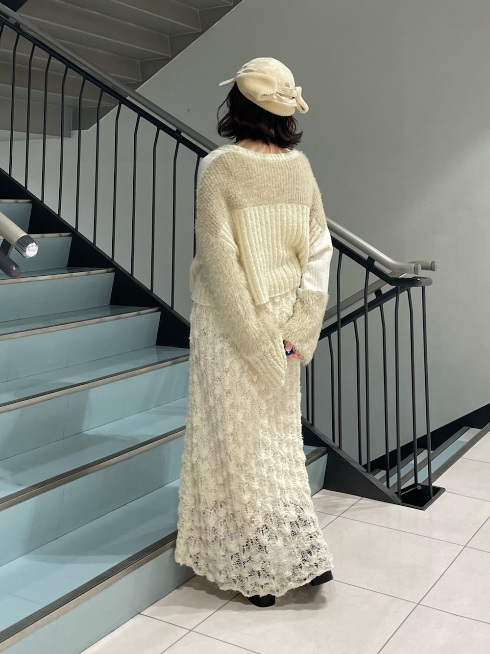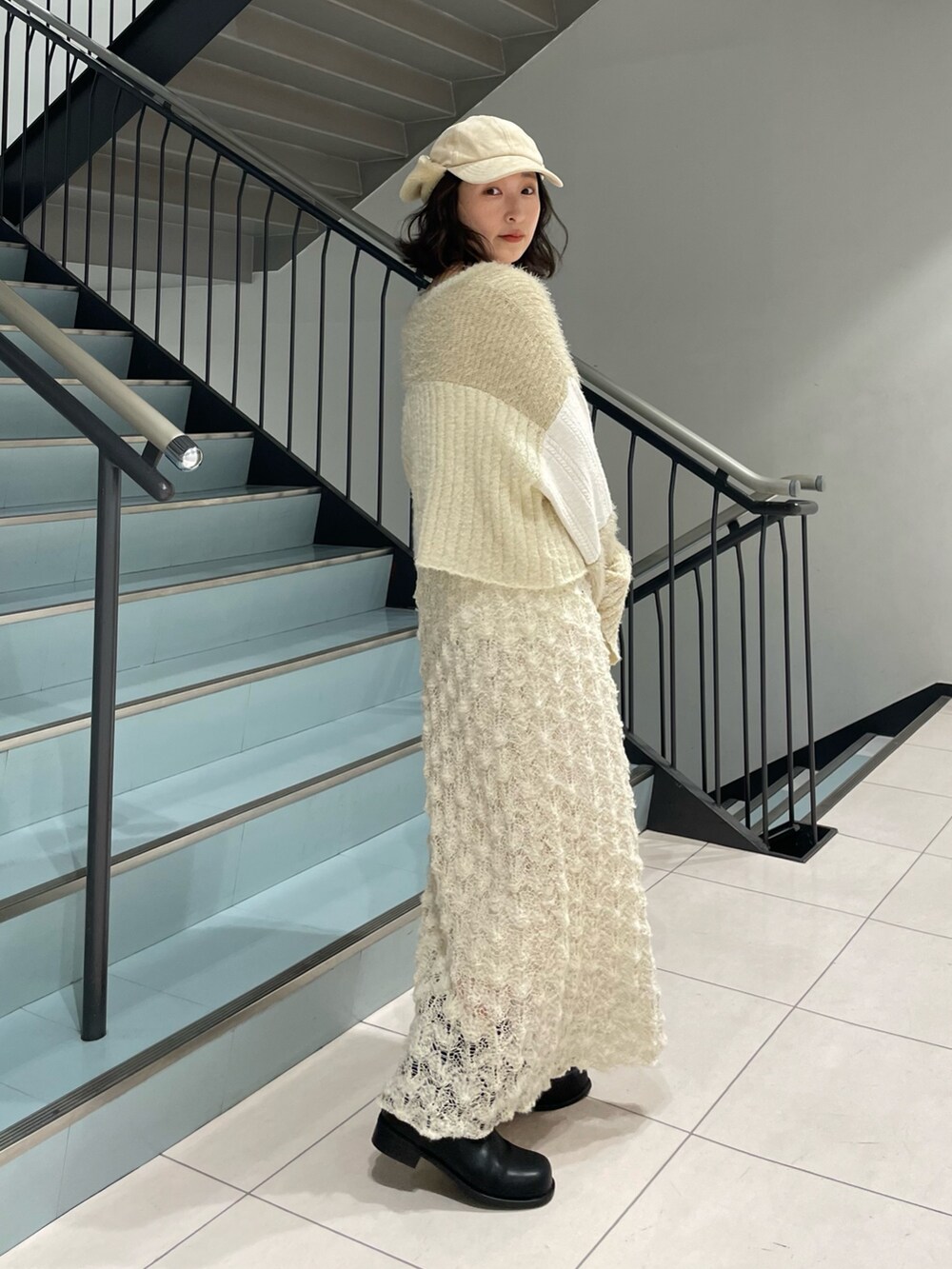 カーディガンがパッチワークで糸も編み方もいろんなデザインを使っているので、ボトムにニット合わせてもまとまります◎